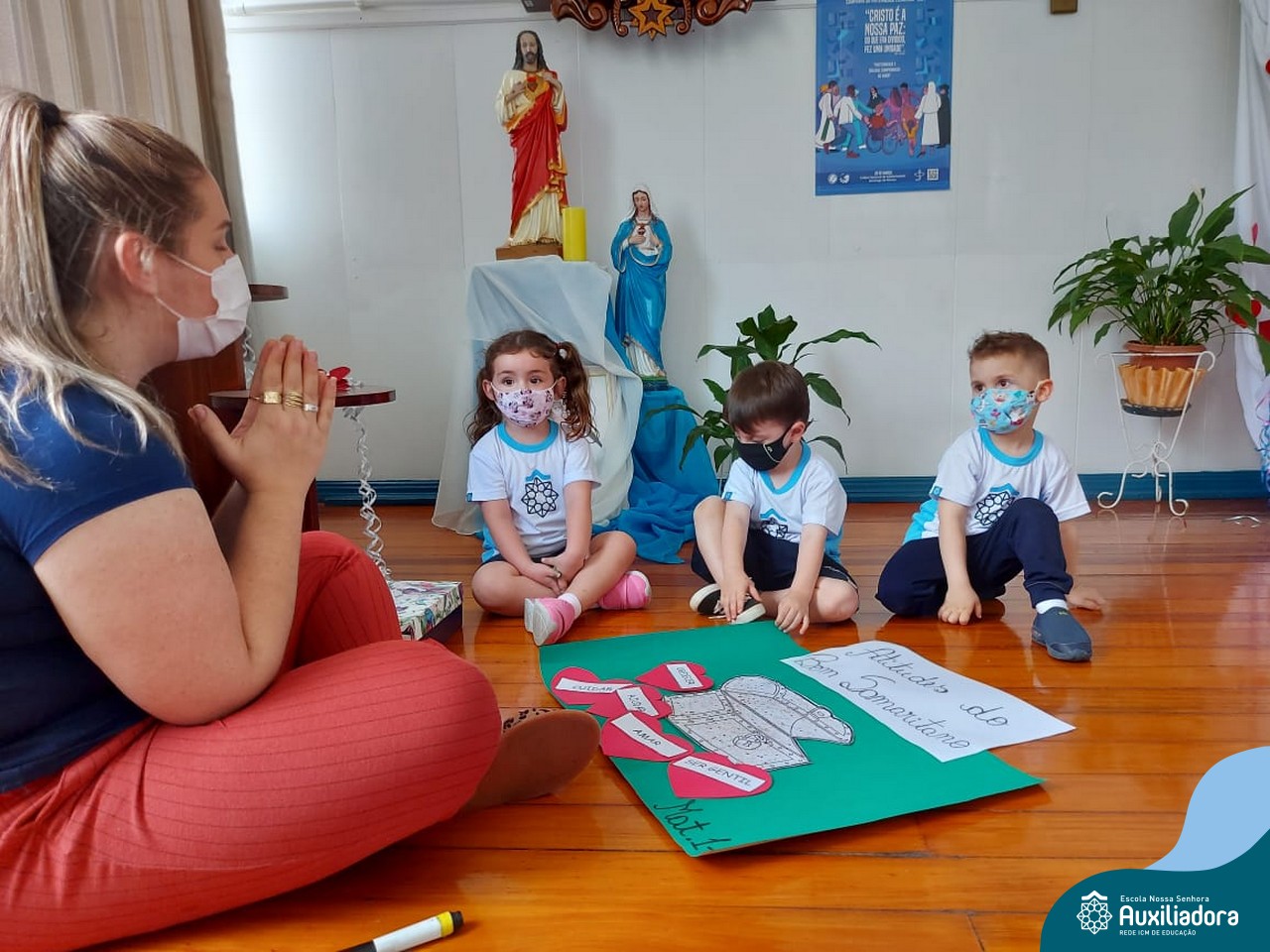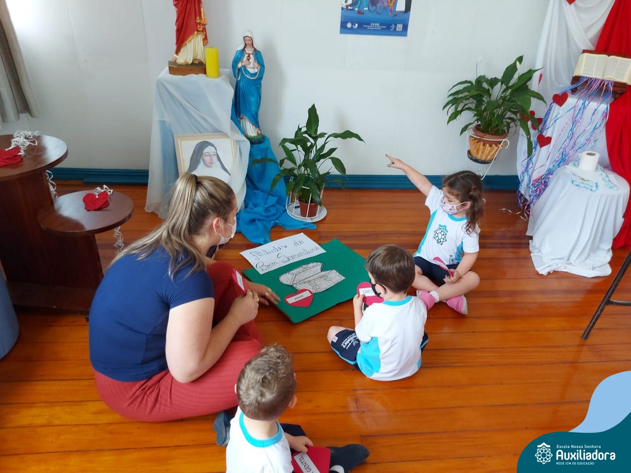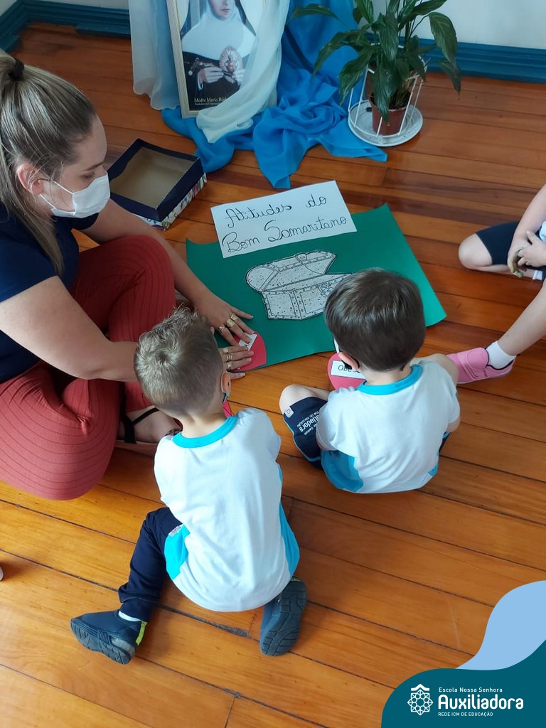 A turma do Maternal 1 A estudou e confeccionou trabalhos alusivos sobre a parábola do Bom Samaritano. Além disso, foram realizadas leituras bíblicas diariamente e visitas a Capela da Escola no decorrer do mês.