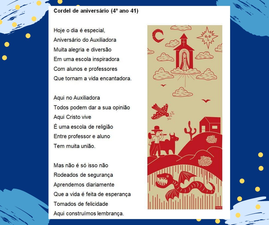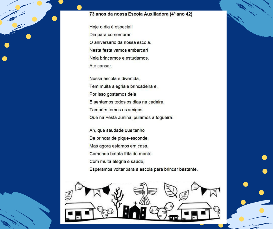 Em comemoração aos 73 anos da escola, os alunos do 4° ano, criaram um Poema de Cordel para registrar a data importante. A alegria de fazer parte dessa história e a saudade do ambiente escolar foram os pilares para a construção.