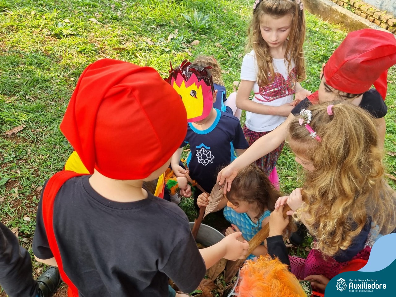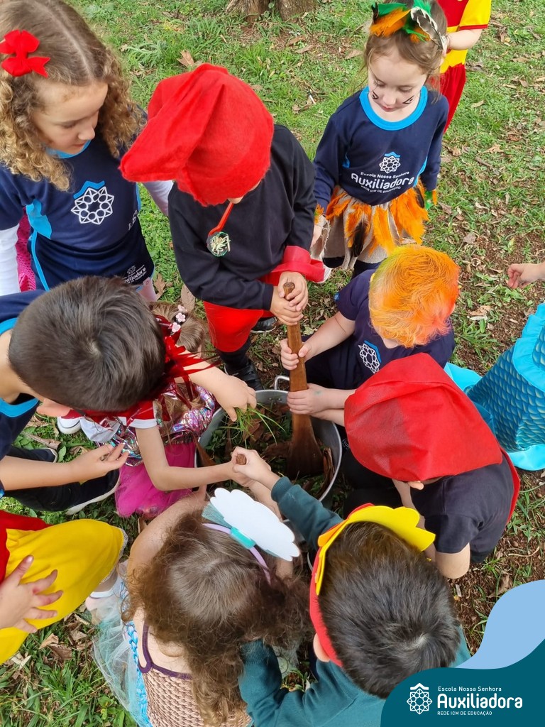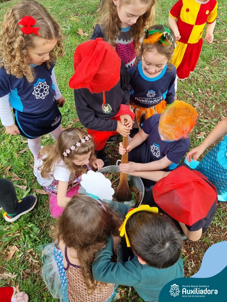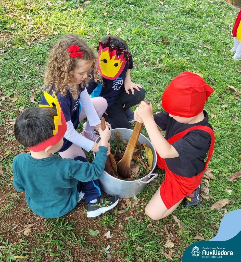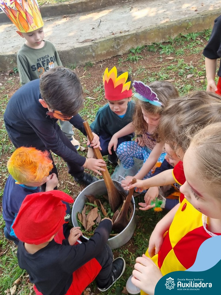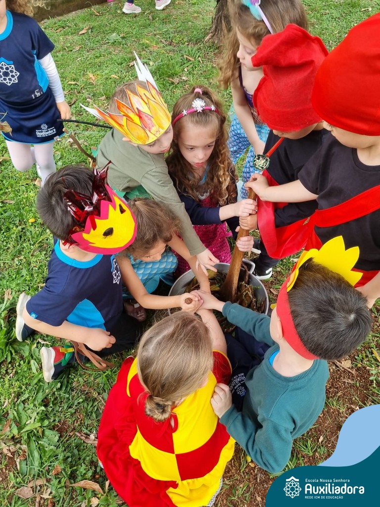 Hoje foi um dia cheio de magia e aventura! As crianças se uniram para criar uma poção mágica inspirada pela Cuca. Juntas, elas exploraram a natureza e coletaram ingredientes especiais: folhas, flores e pedrinhas. Cada item foi escolhido com muito cuidado, pois sabiam que só assim a poção teria o poder necessário.