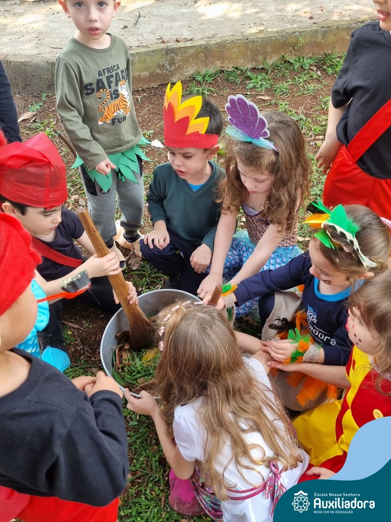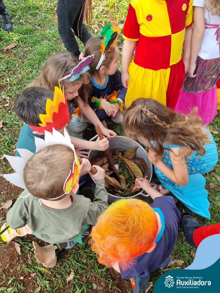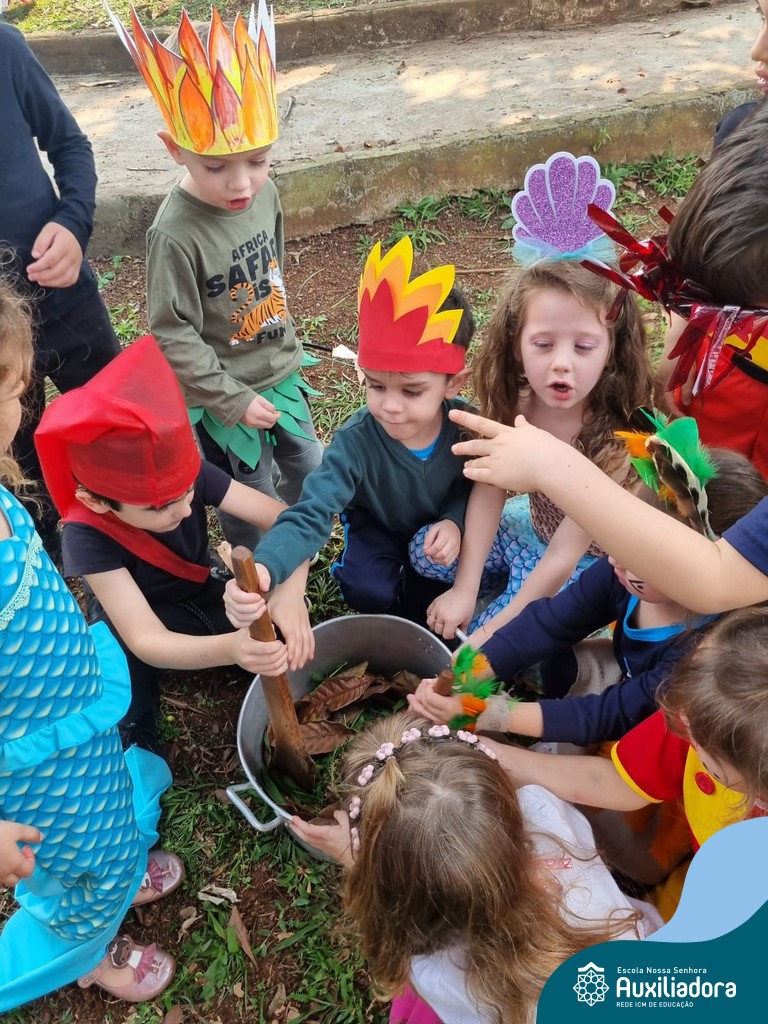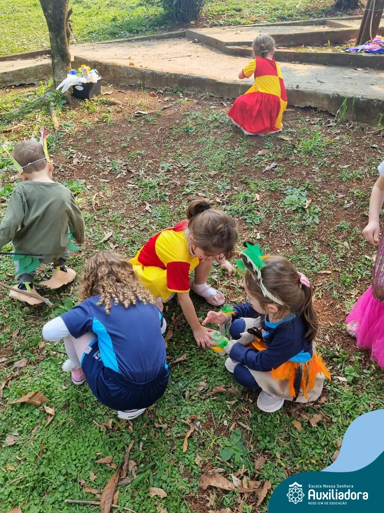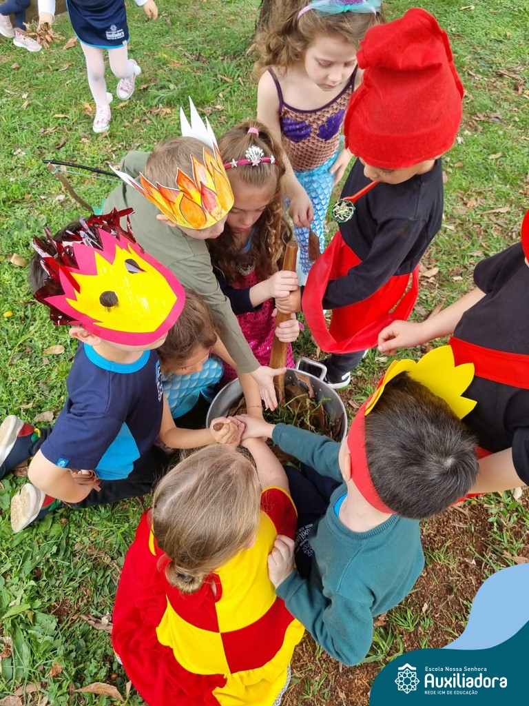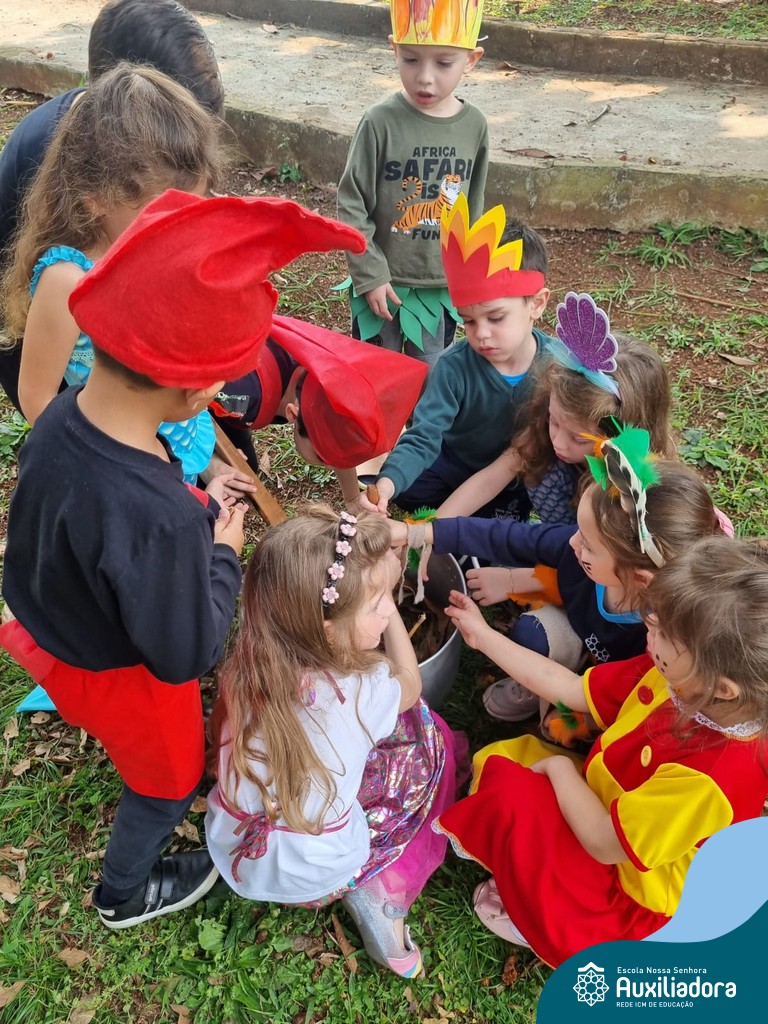 Hoje foi um dia cheio de magia e aventura! As crianças se uniram para criar uma poção mágica inspirada pela Cuca. Juntas, elas exploraram a natureza e coletaram ingredientes especiais: folhas, flores e pedrinhas. Cada item foi escolhido com muito cuidado, pois sabiam que só assim a poção teria o poder necessário.