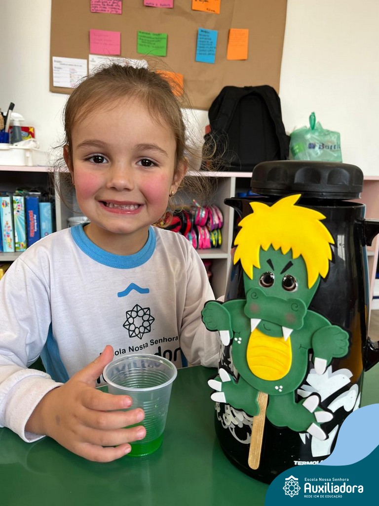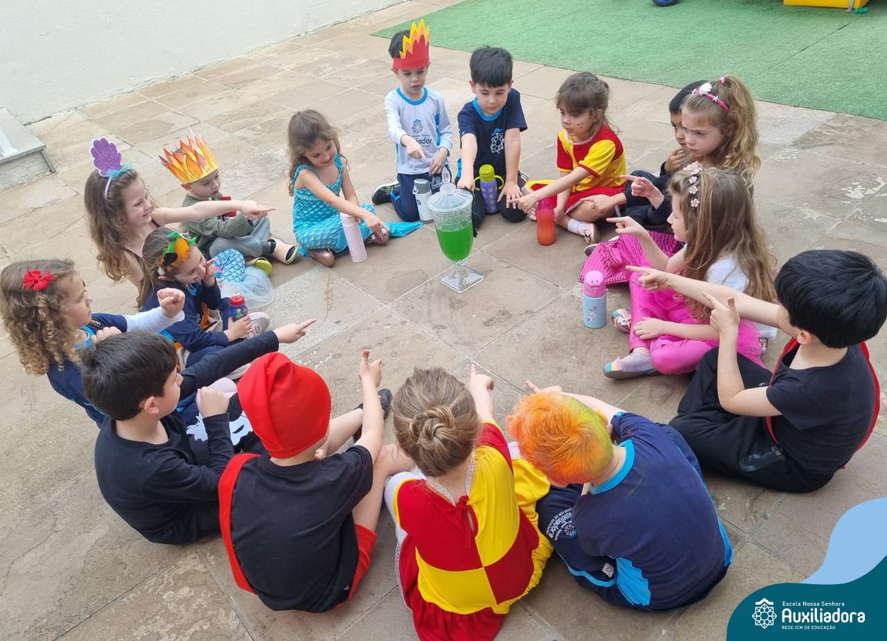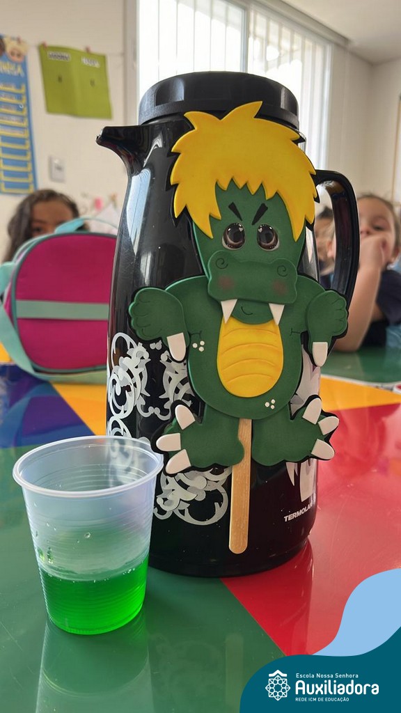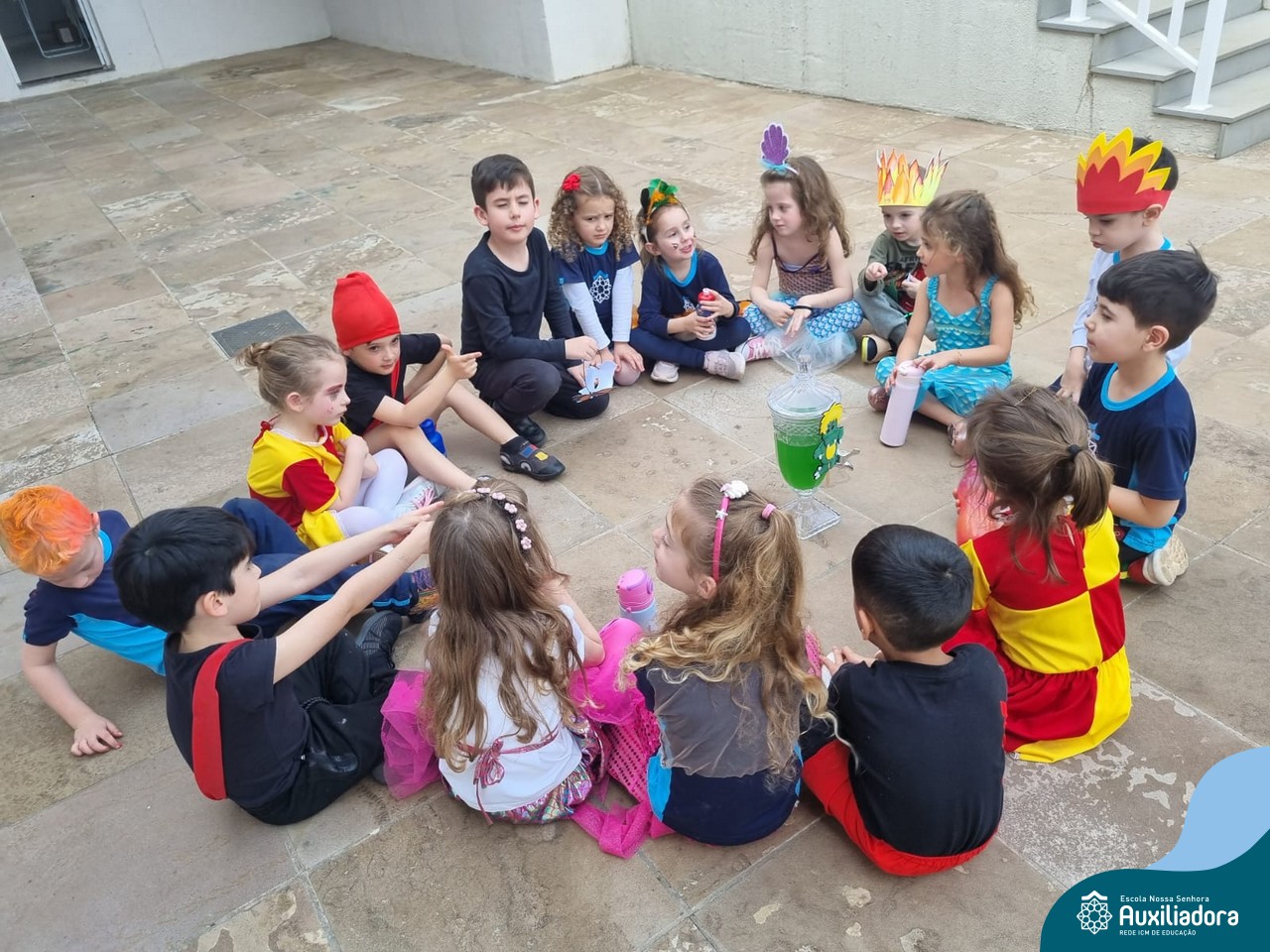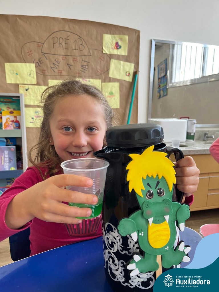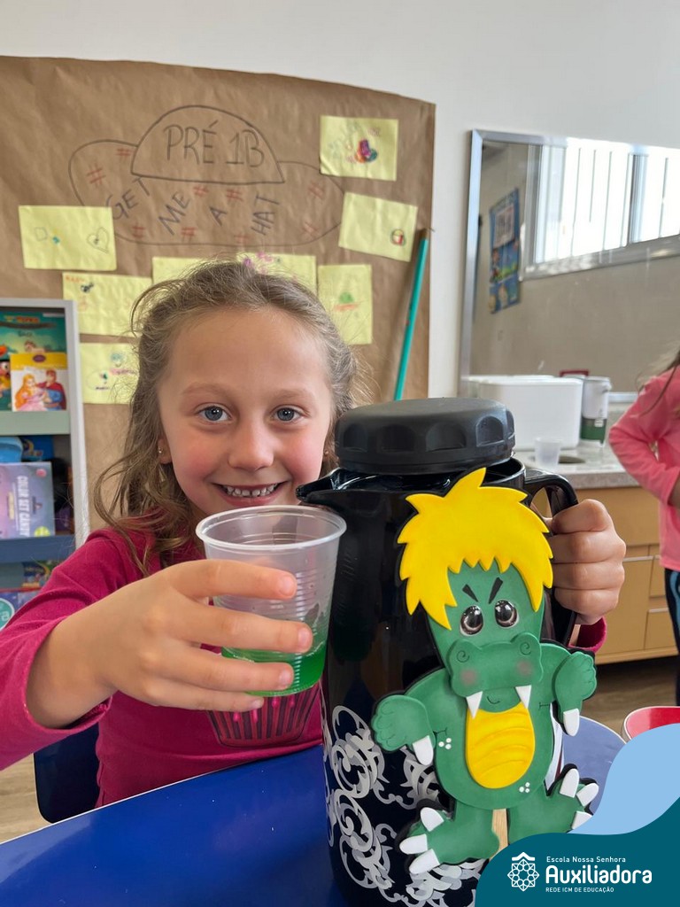 Depois de misturarem tudo, um líquido misterioso apareceu. As crianças, corajosas como sempre, aceitaram o desafio de experimentar a poção mágica, que na verdade se transformou em um delicioso suco de gelatina. Quem teria coragem de dar o primeiro gole? Com muita animação e um pouquinho de medo, todos se divertiram com a brincadeira, imaginando quais poderes poderiam ganhar com aquela mistura especial.
