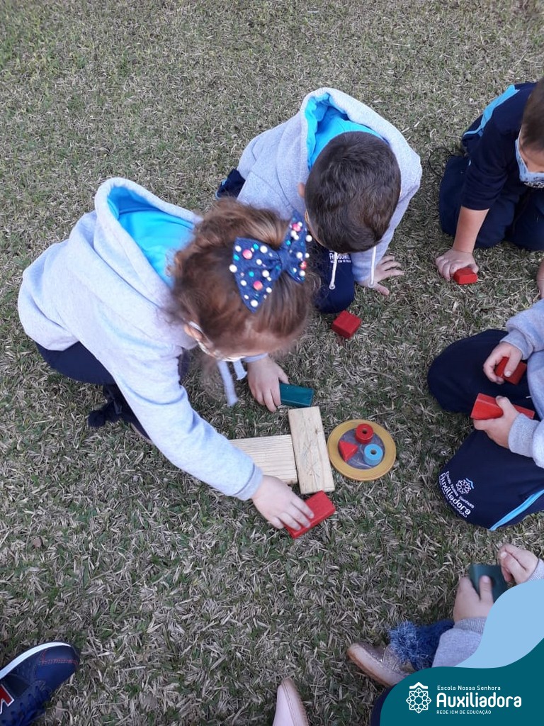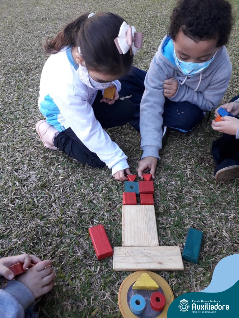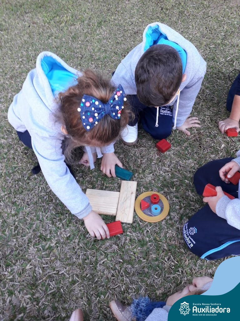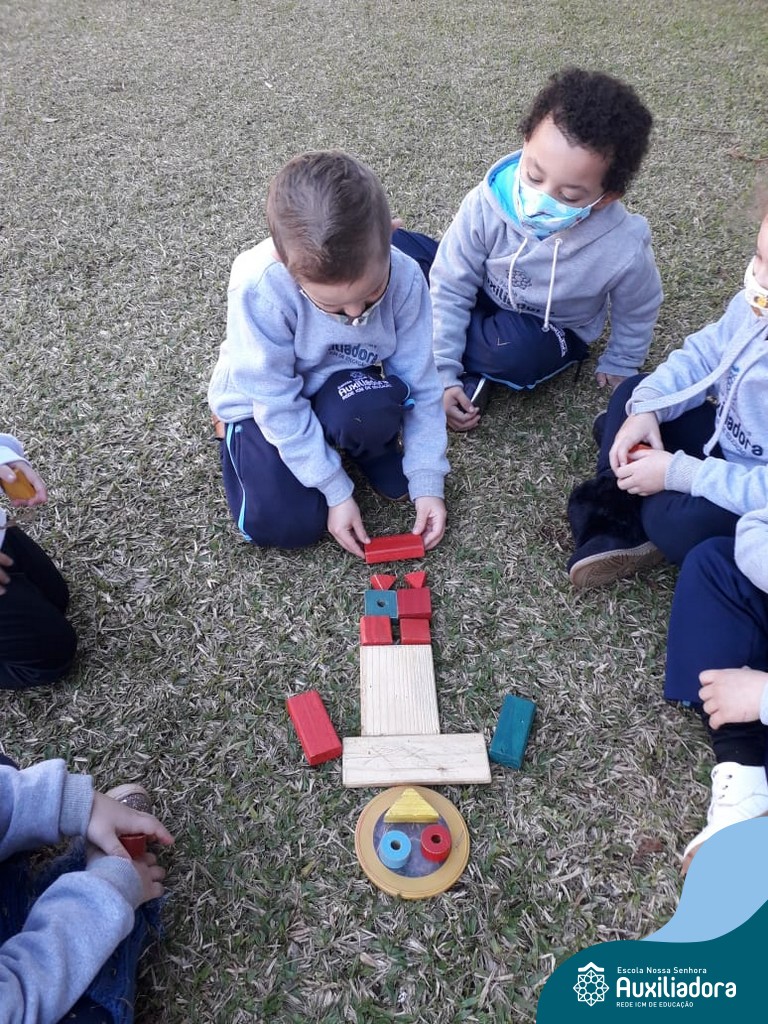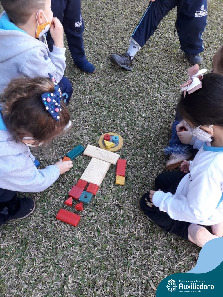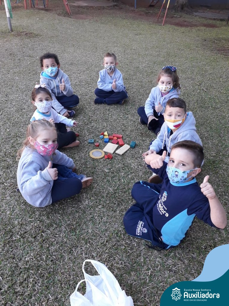 O Sol nos permitiu uma bela caça ao tesouro das formas: saímos a procura das formas geométricas, identificamos, contamos e nos divertimos muito!