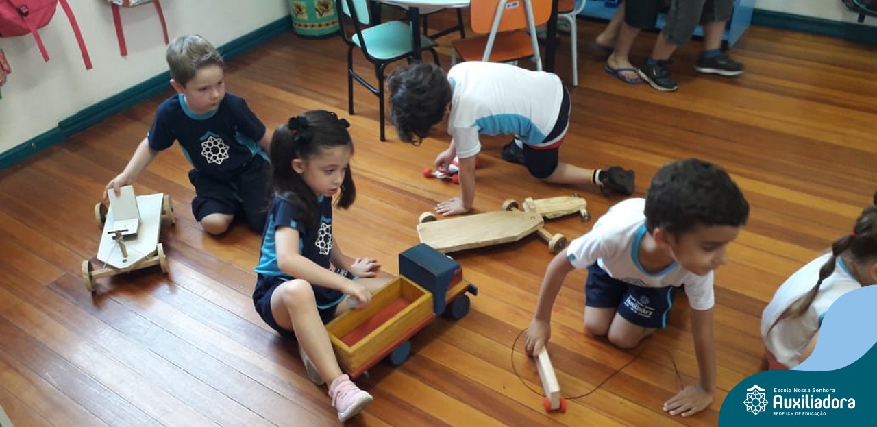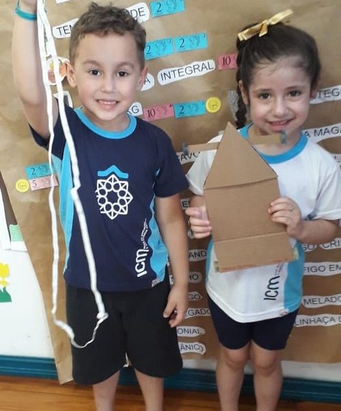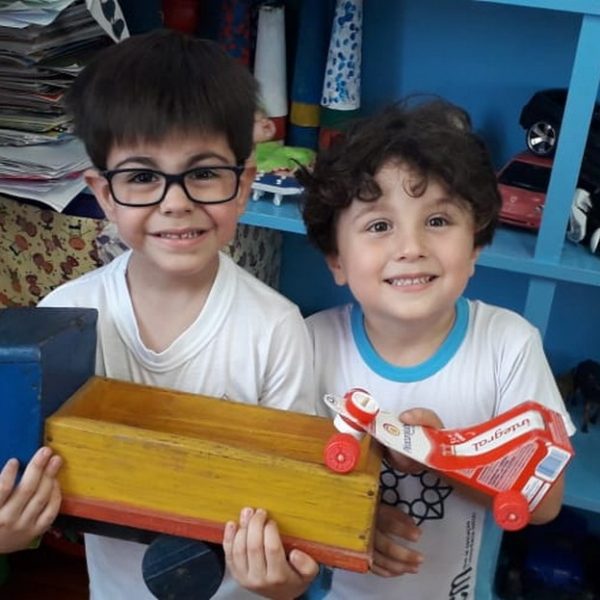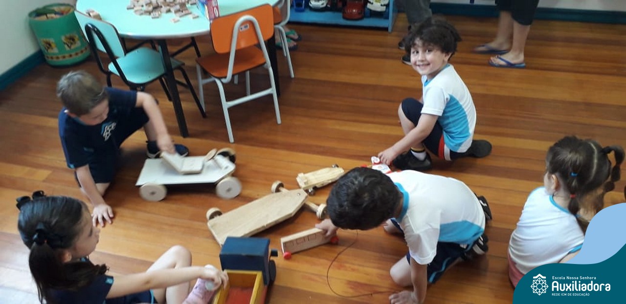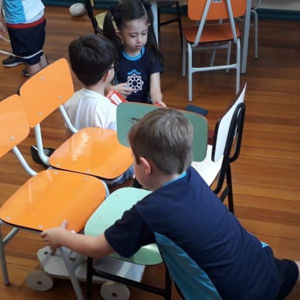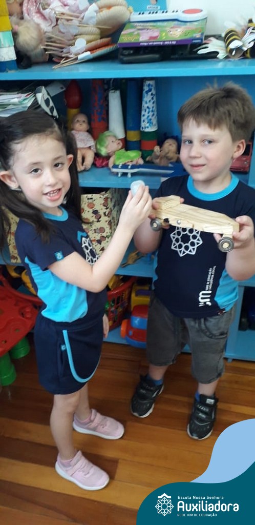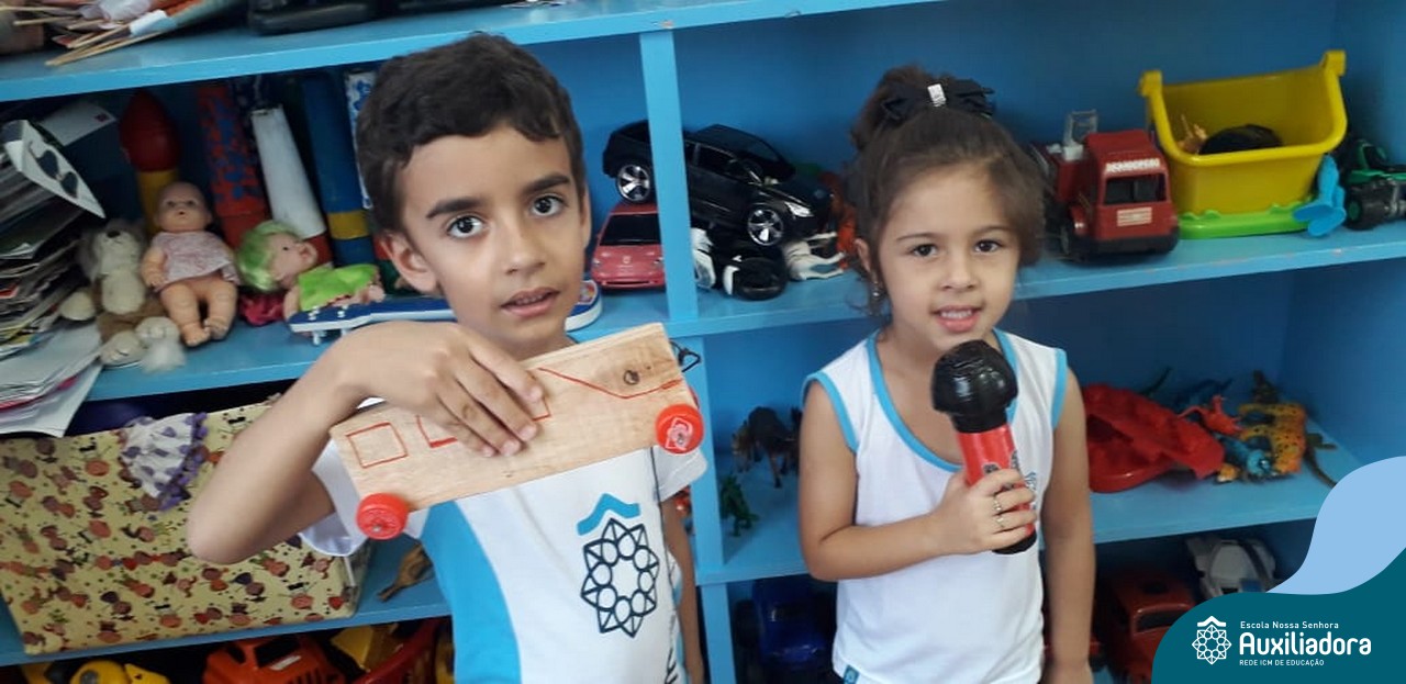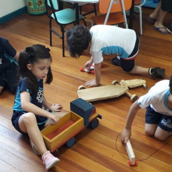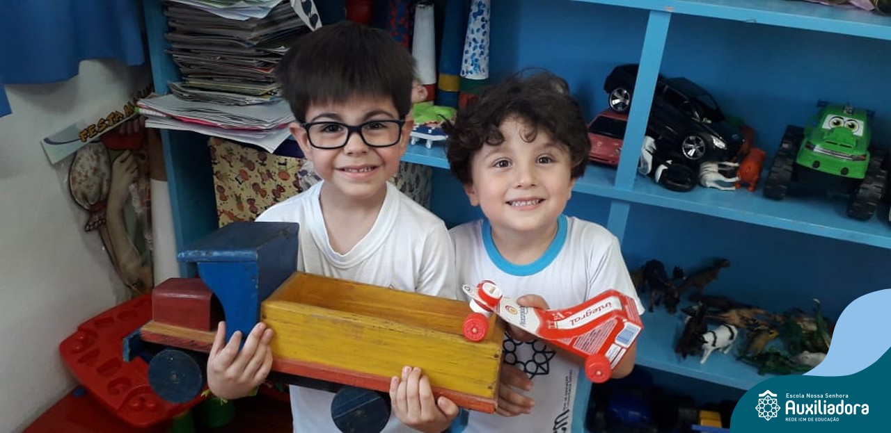 Com o objetivo de resgatar os brinquedos, jogos e brincadeiras dos antepassados, os alunos trouxeram suas construções que realizaram em família para compartilhar com os colegas.