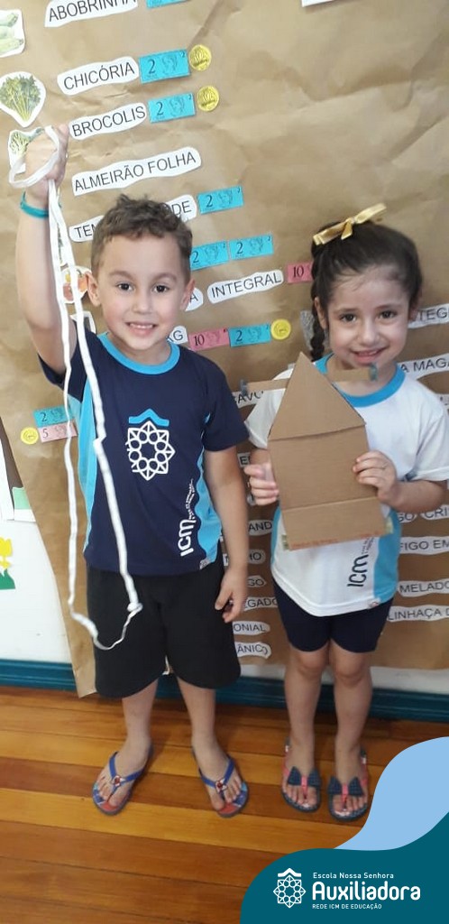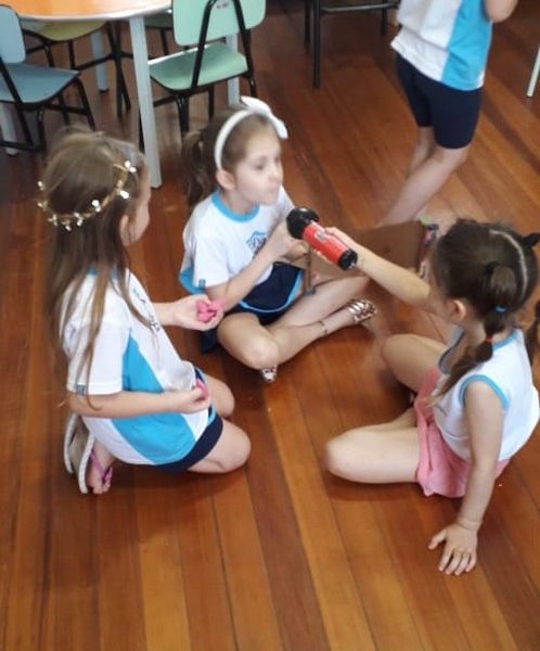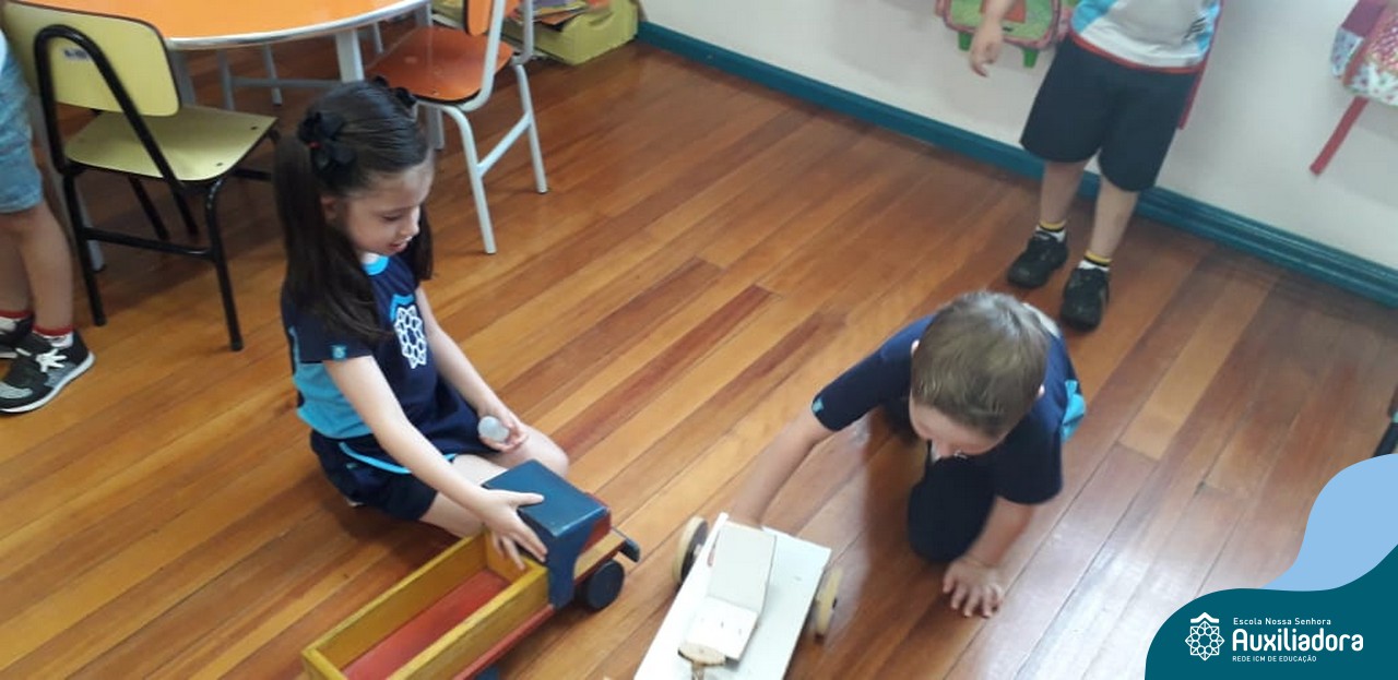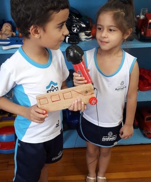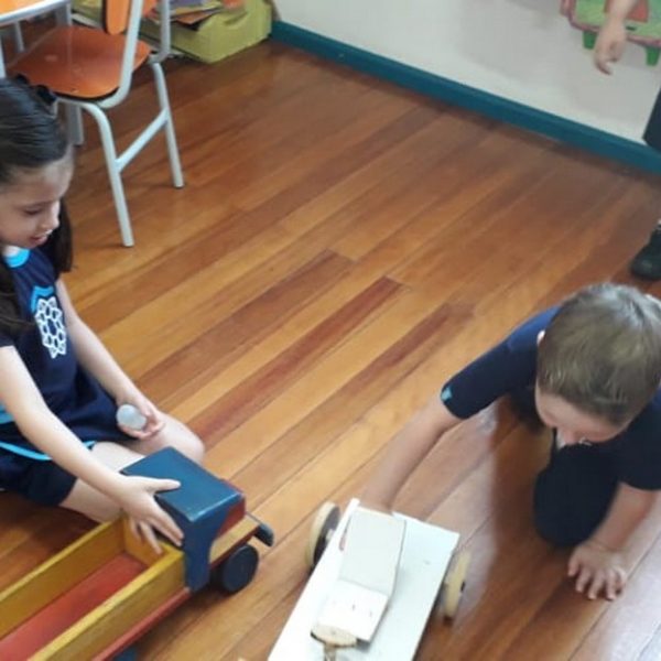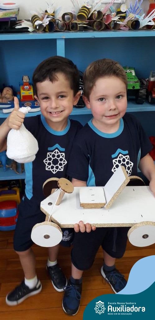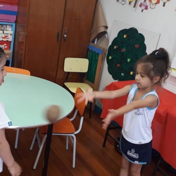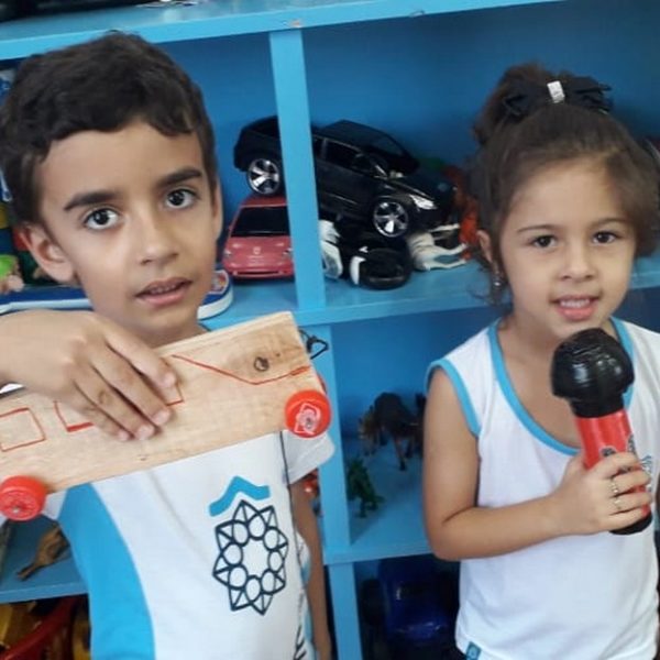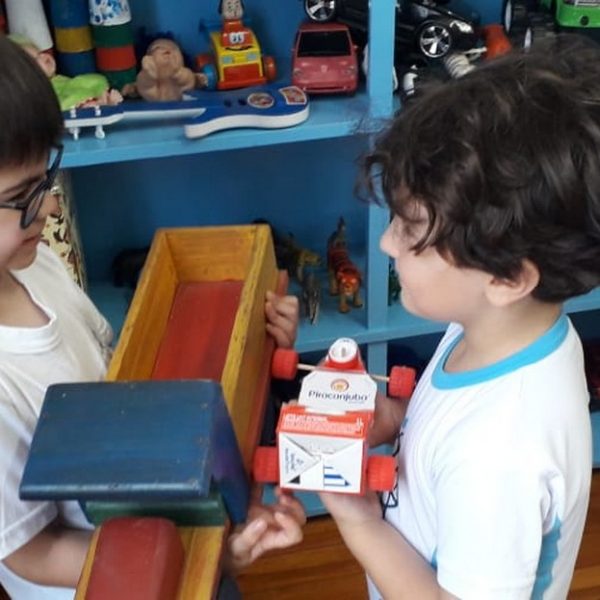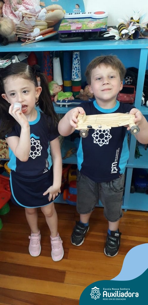 Com o objetivo de resgatar os brinquedos, jogos e brincadeiras dos antepassados, os alunos trouxeram suas construções que realizaram em família para compartilhar com os colegas.