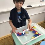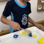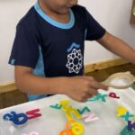 Foi um momento de exercitar a concentração, a motricidade fina, explorar diferentes texturas, além de estabelecer relações com outras palavras que iniciam com essa letra.