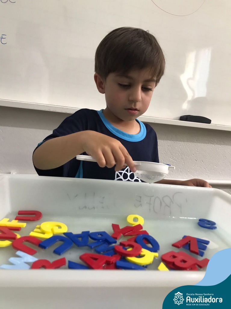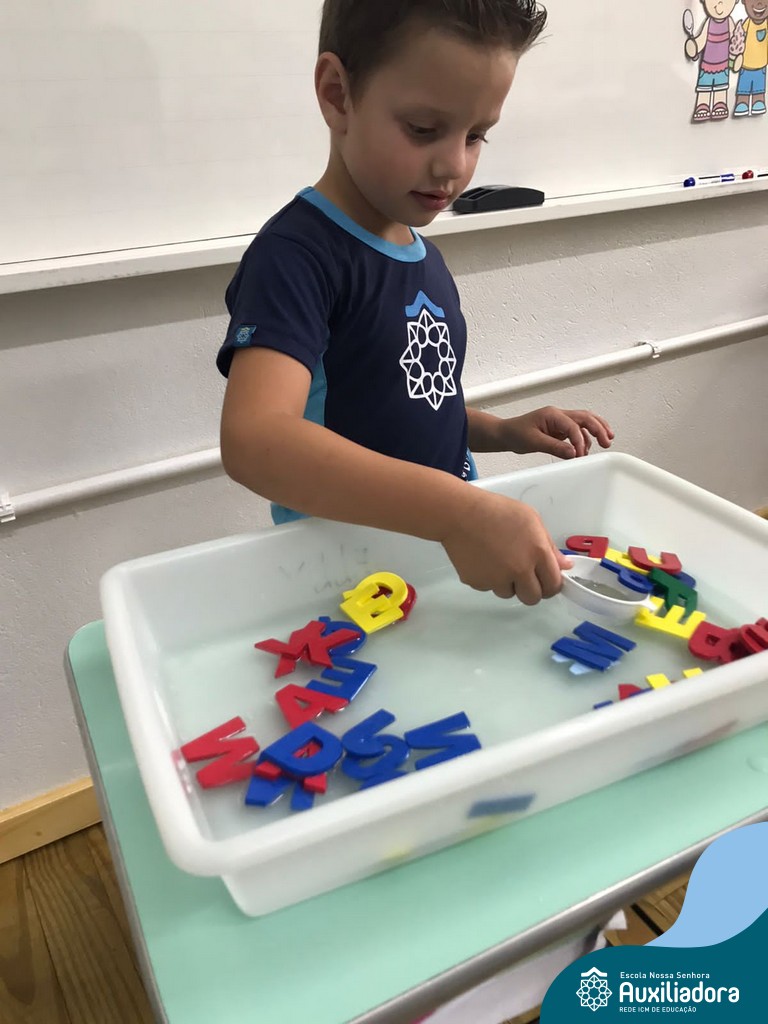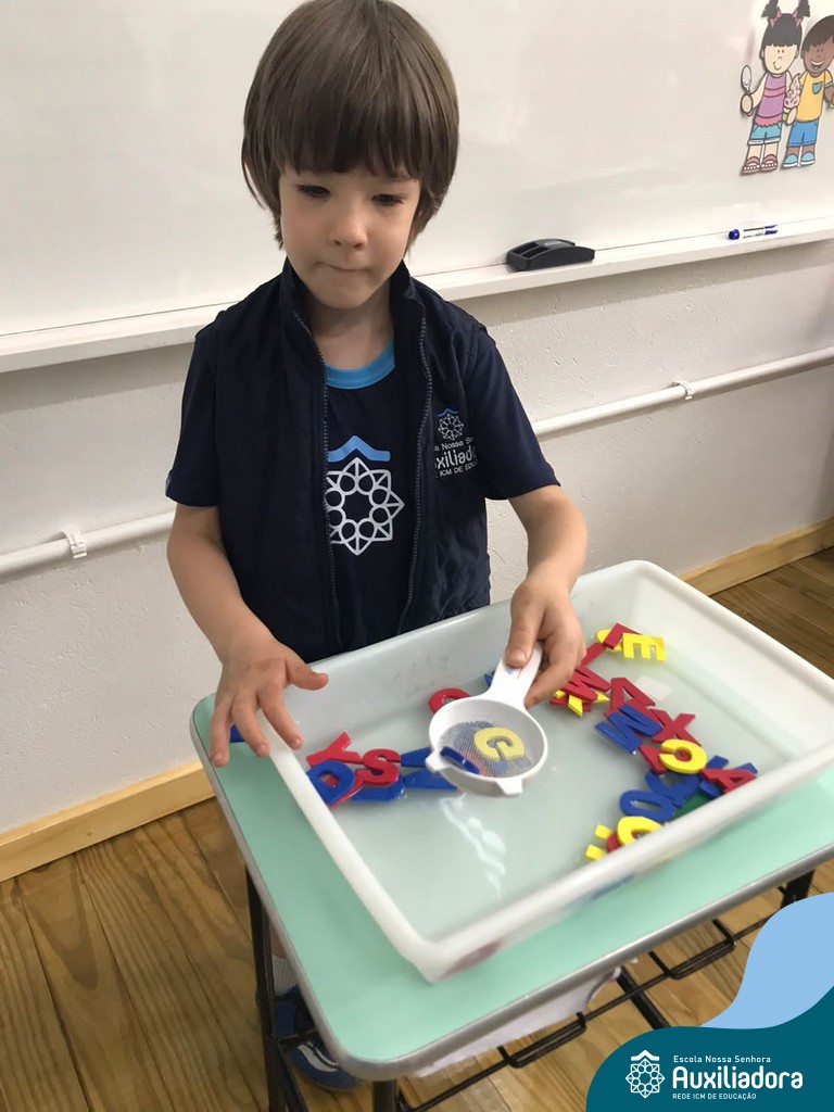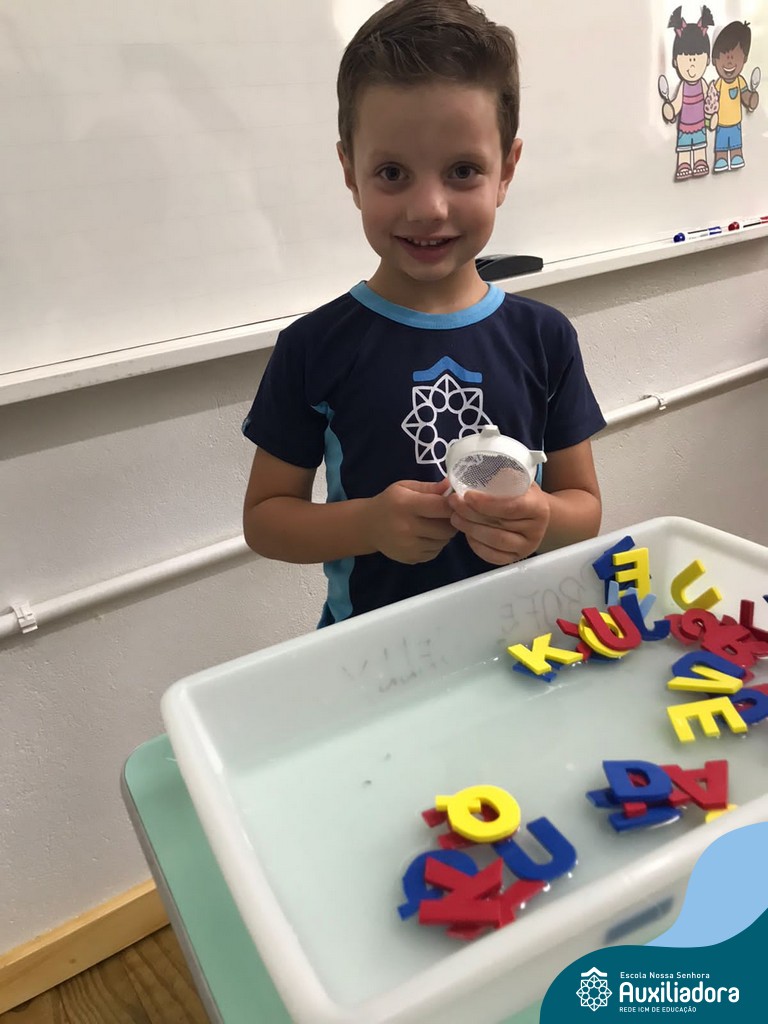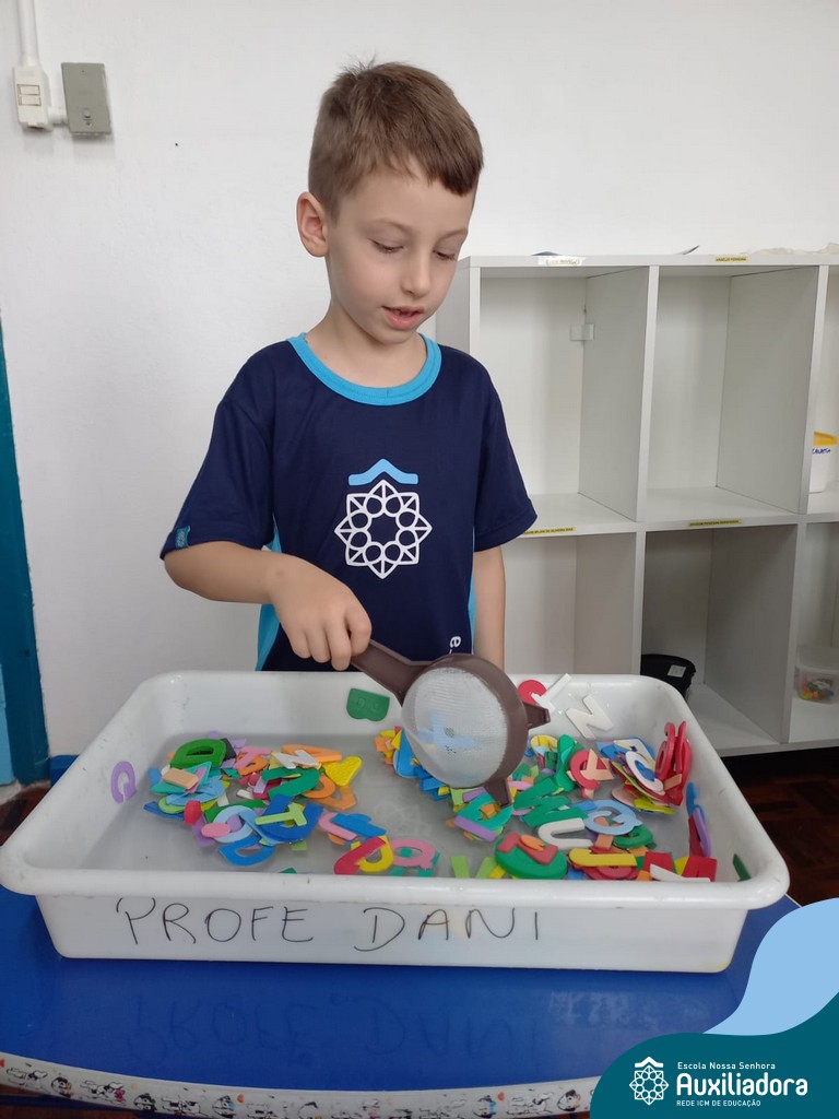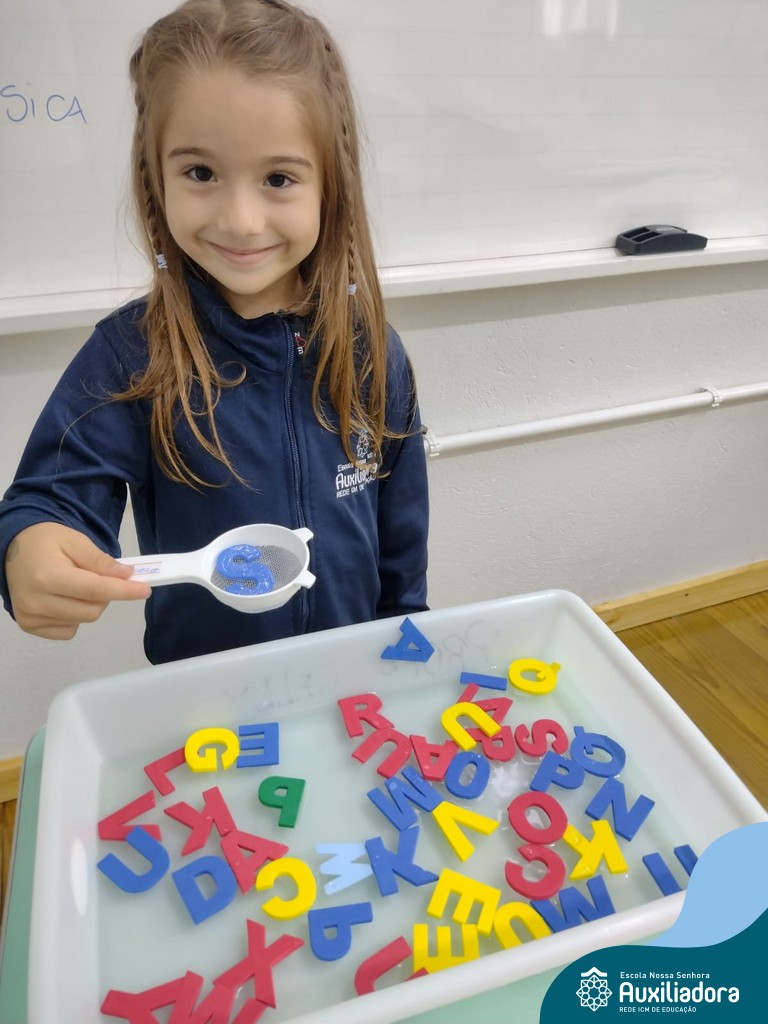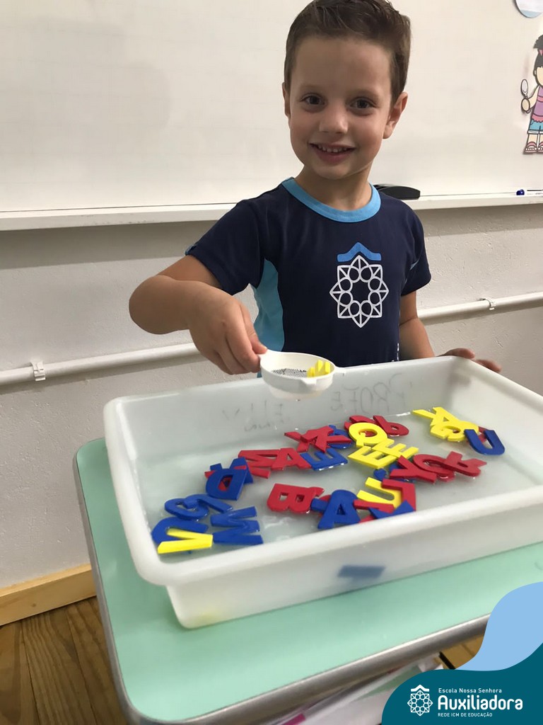 A partir da história “A escolinha do mar” a galerinha do Pré 2 conheceu vários peixinhos. As crianças trabalharam sobre a letra “P” da palavra peixe e uma das atividades realizadas foi a pesca das letras com auxílio de uma peneira.