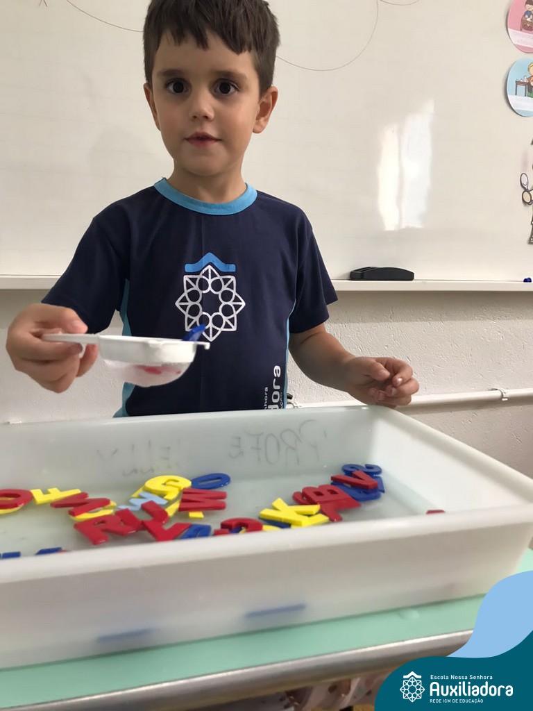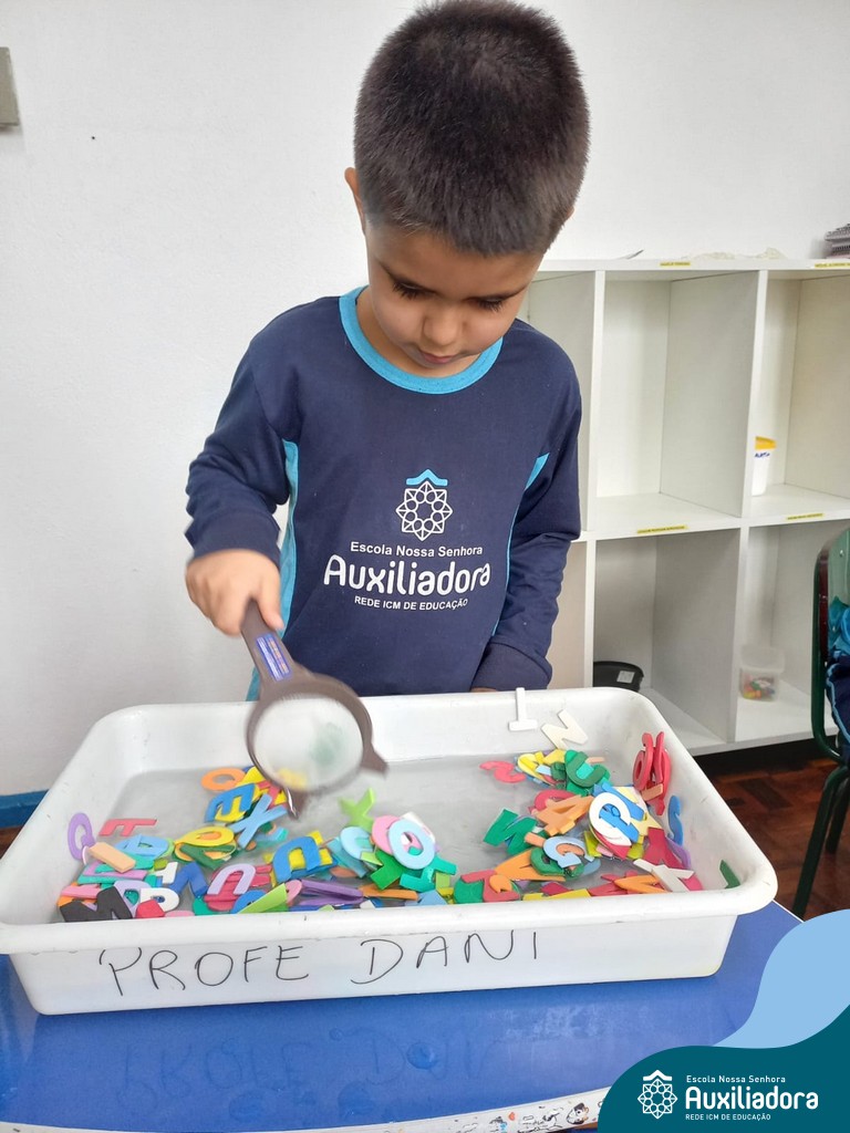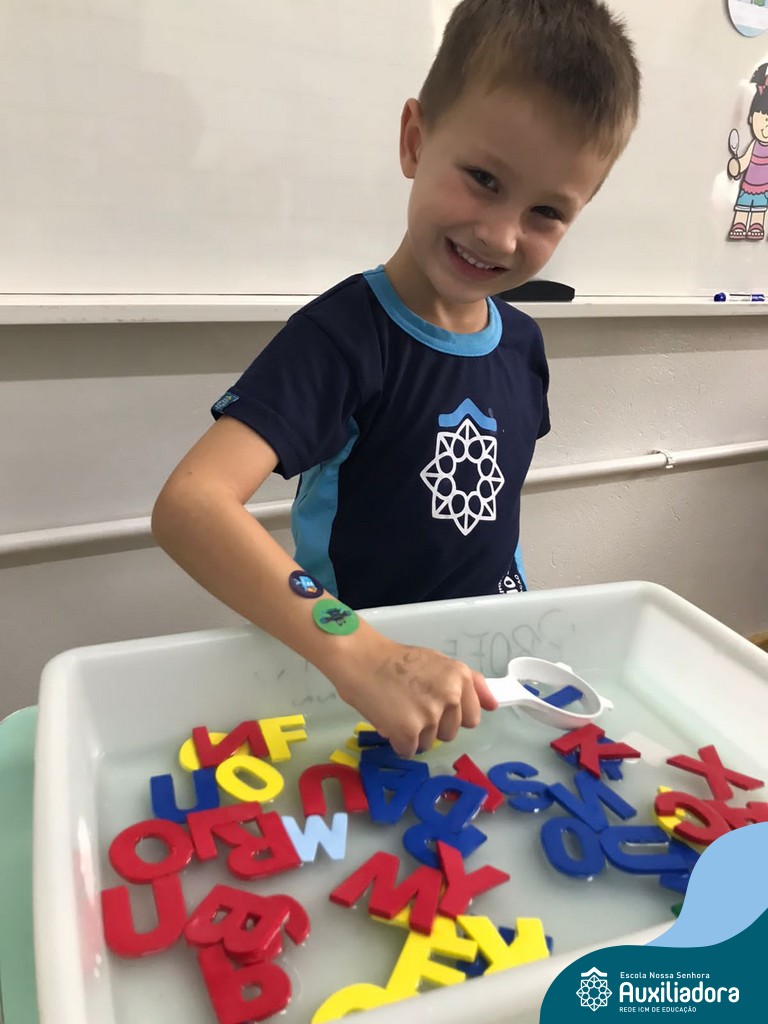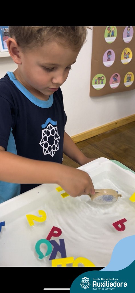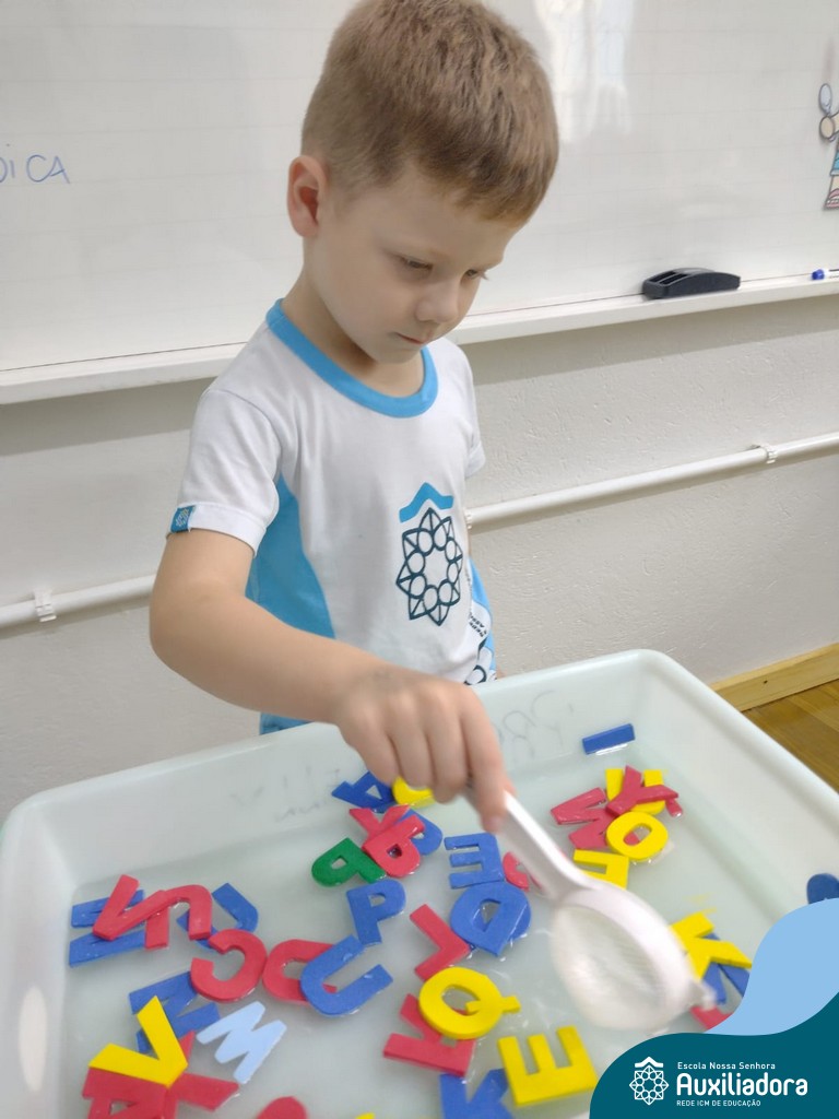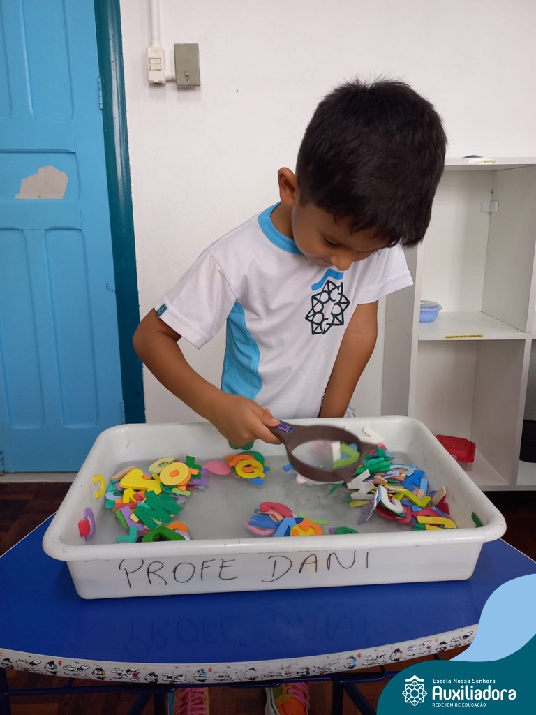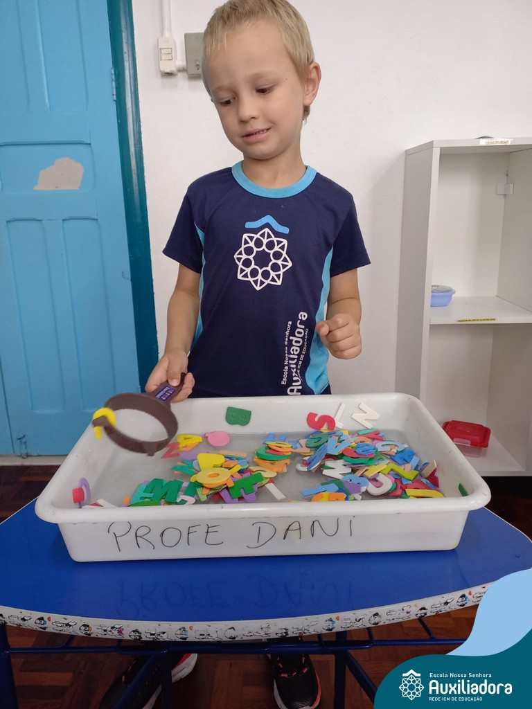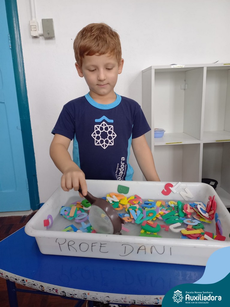 A partir da história “A escolinha do mar” a galerinha do Pré 2 conheceu vários peixinhos. As crianças trabalharam sobre a letra “P” da palavra peixe e uma das atividades realizadas foi a pesca das letras com auxílio de uma peneira.