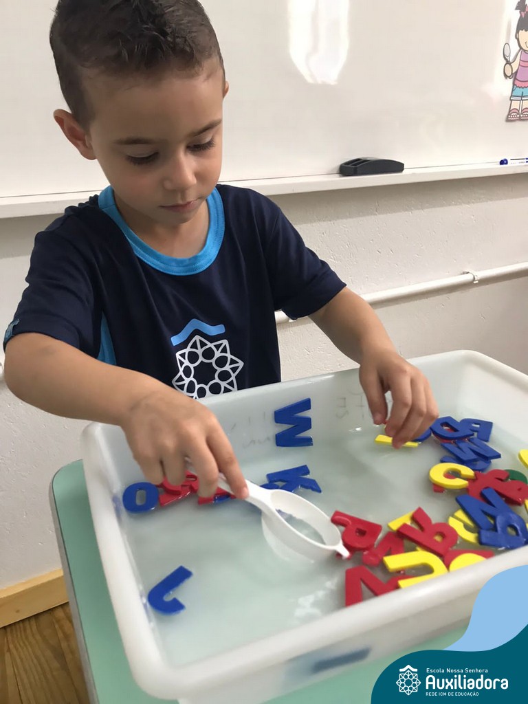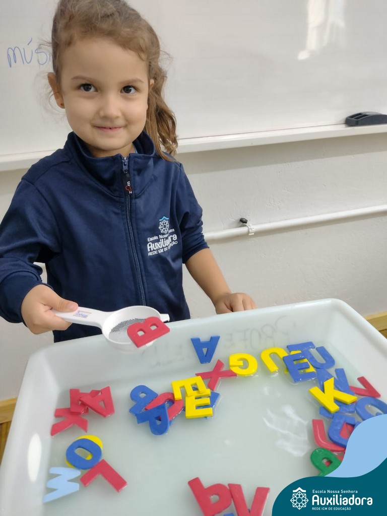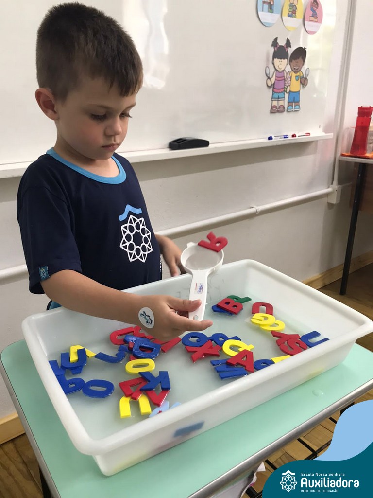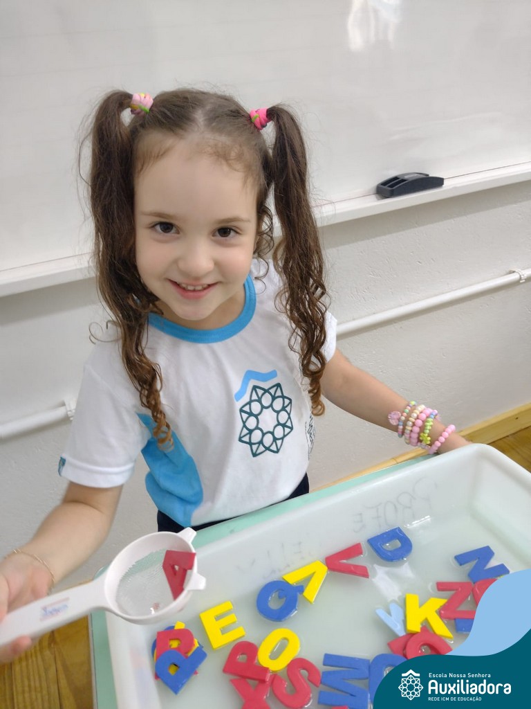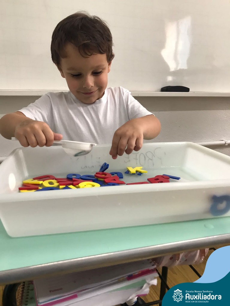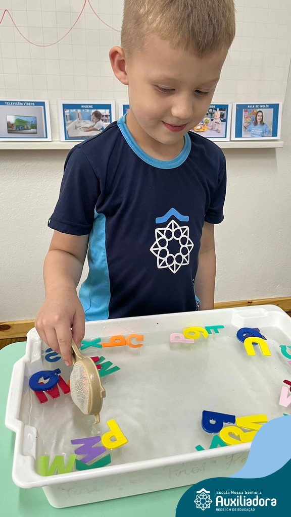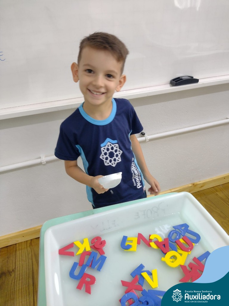 A partir da história “A escolinha do mar” a galerinha do Pré 2 conheceu vários peixinhos. As crianças trabalharam sobre a letra “P” da palavra peixe e uma das atividades realizadas foi a pesca das letras com auxílio de uma peneira.