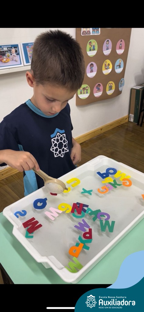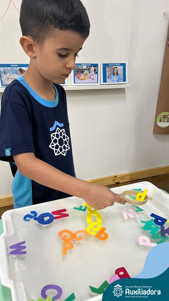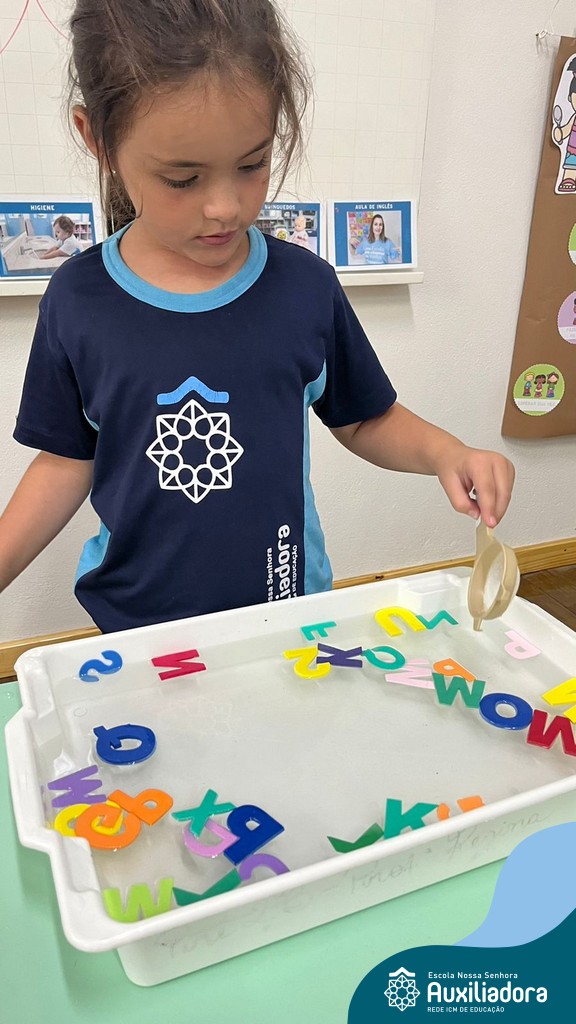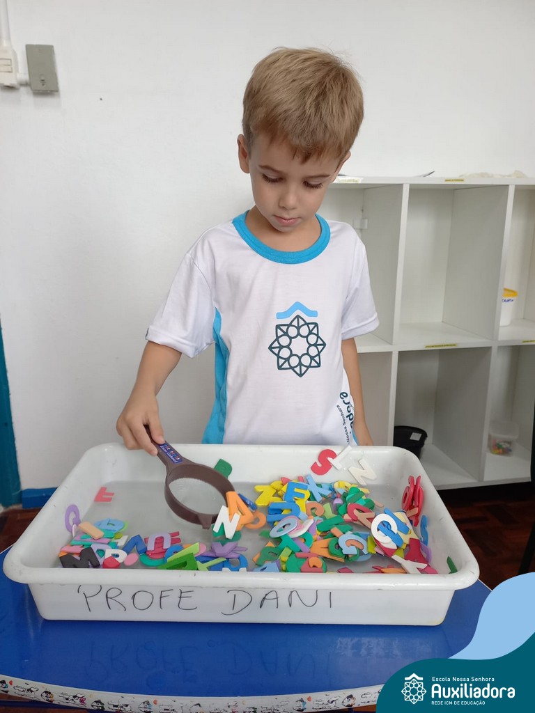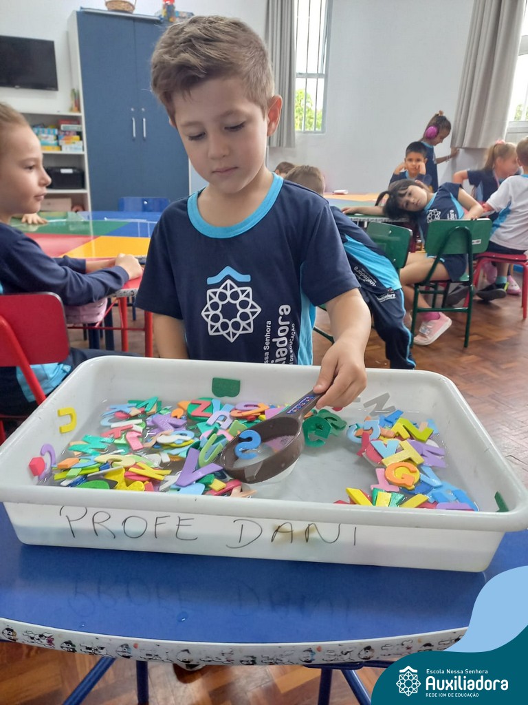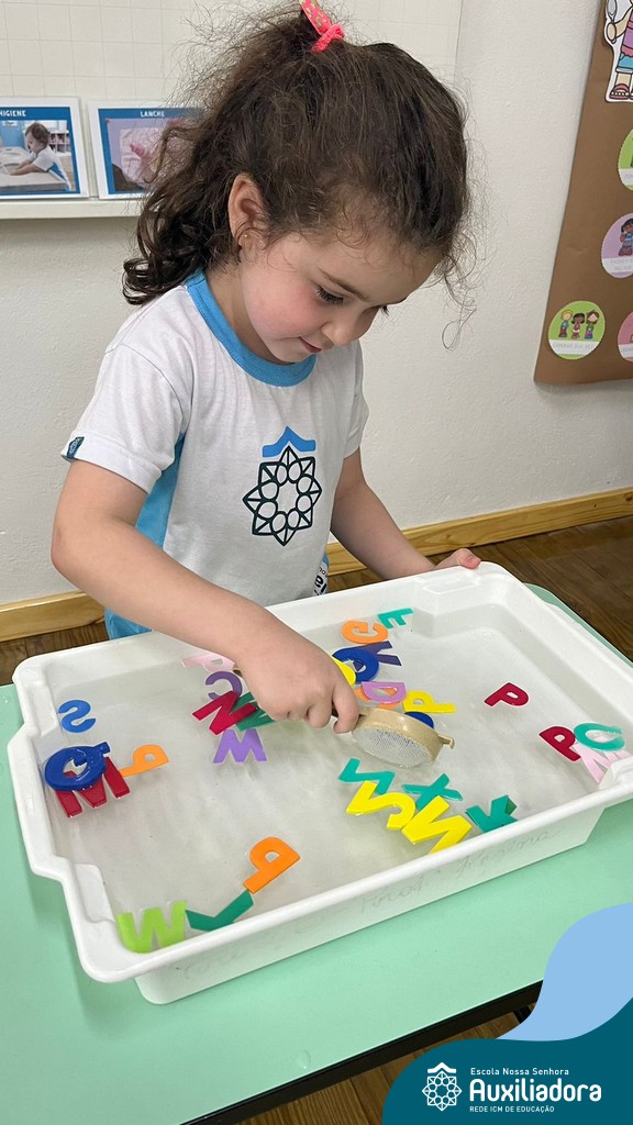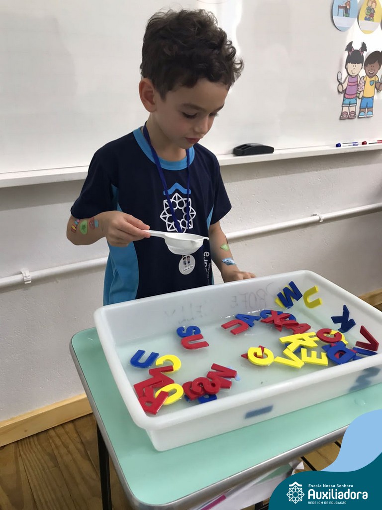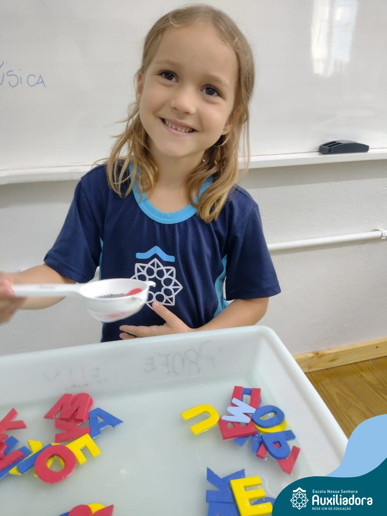 A partir da história “A escolinha do mar” a galerinha do Pré 2 conheceu vários peixinhos. As crianças trabalharam sobre a letra “P” da palavra peixe e uma das atividades realizadas foi a pesca das letras com auxílio de uma peneira.