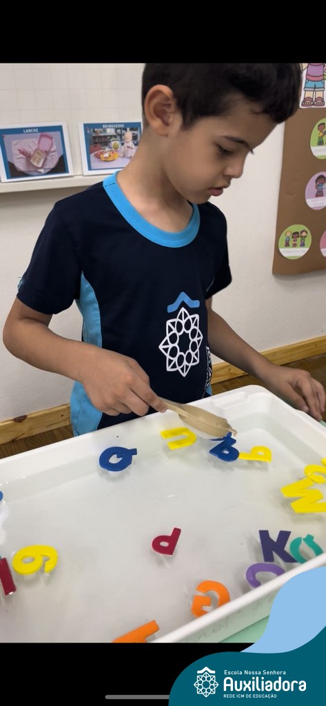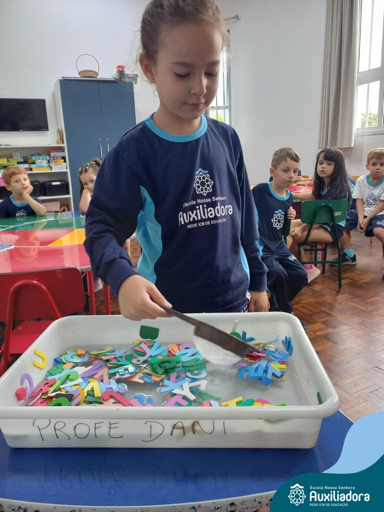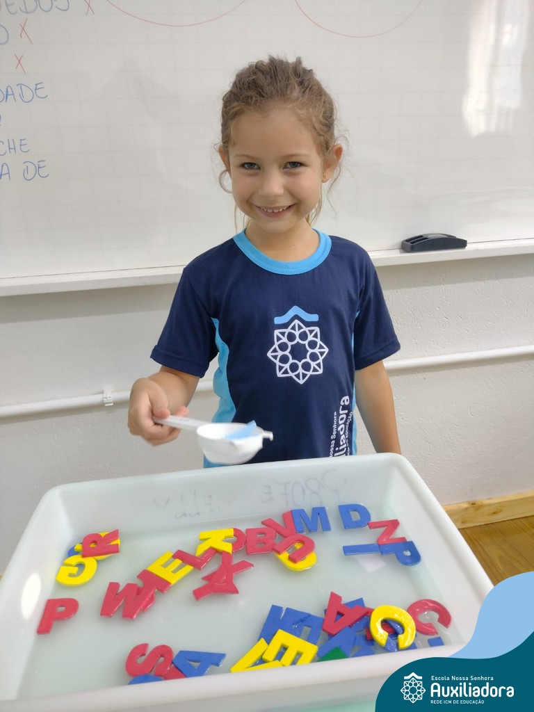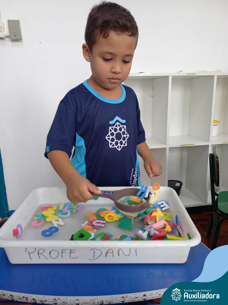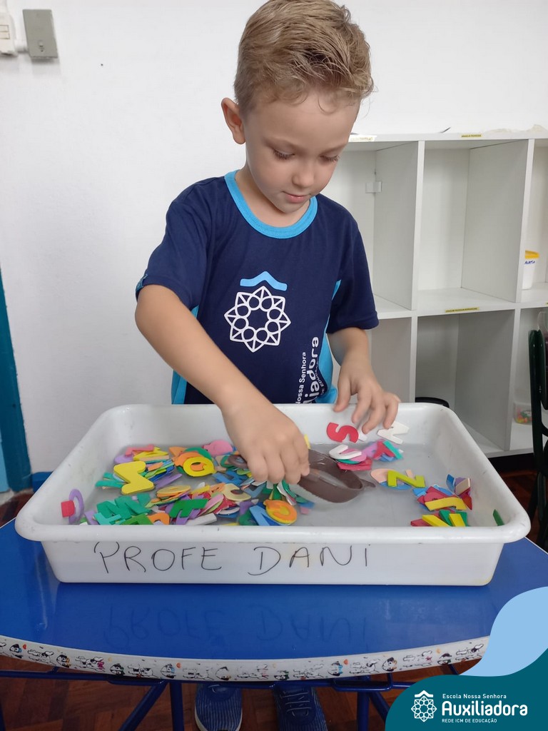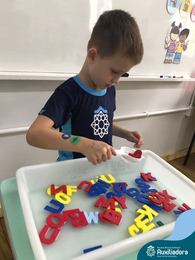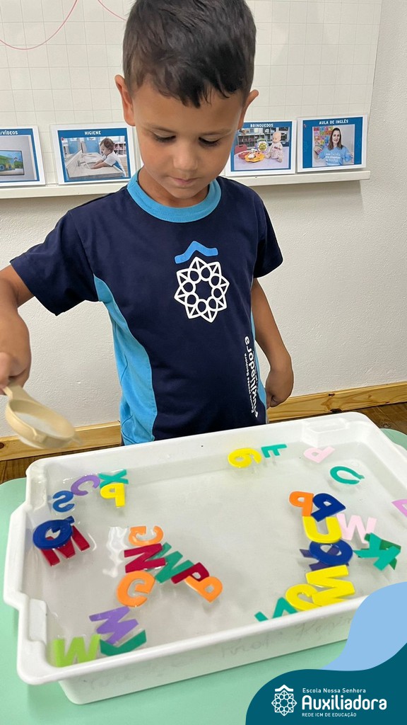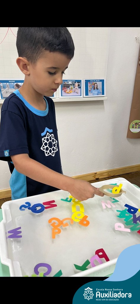 A partir da história “A escolinha do mar” a galerinha do Pré 2 conheceu vários peixinhos. As crianças trabalharam sobre a letra “P” da palavra peixe e uma das atividades realizadas foi a pesca das letras com auxílio de uma peneira.