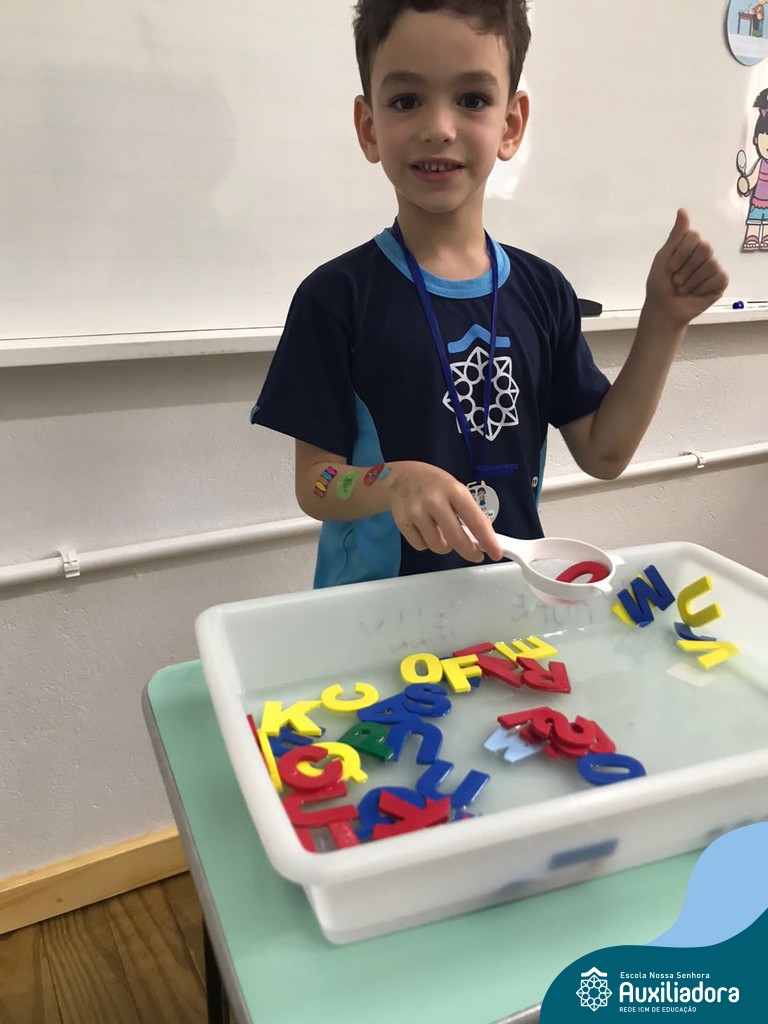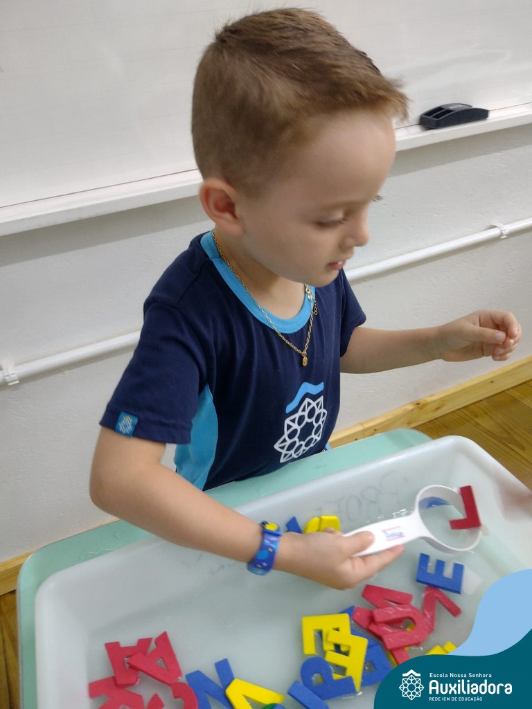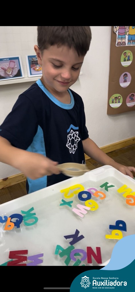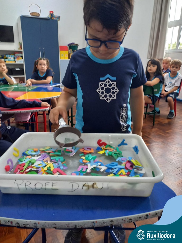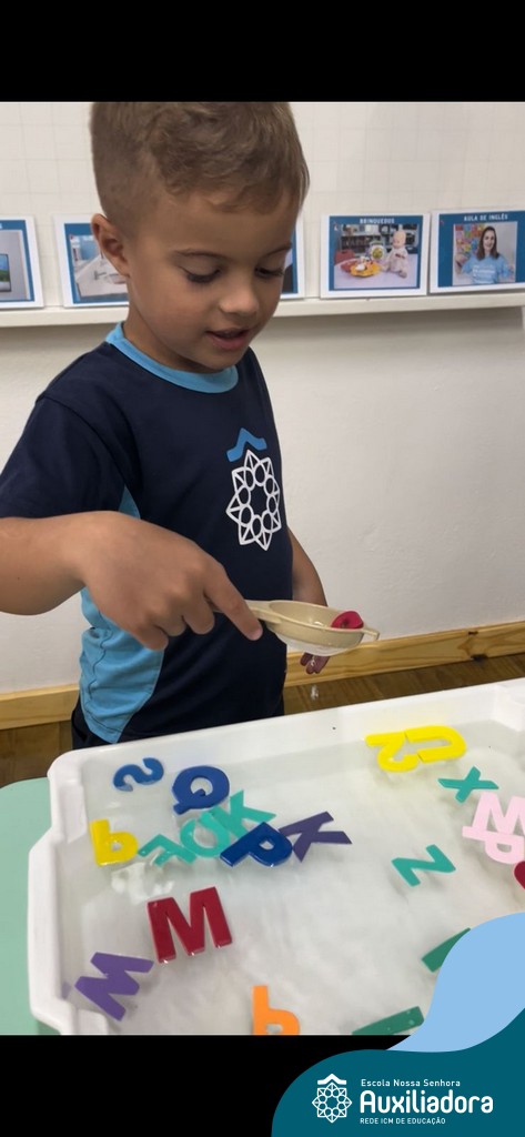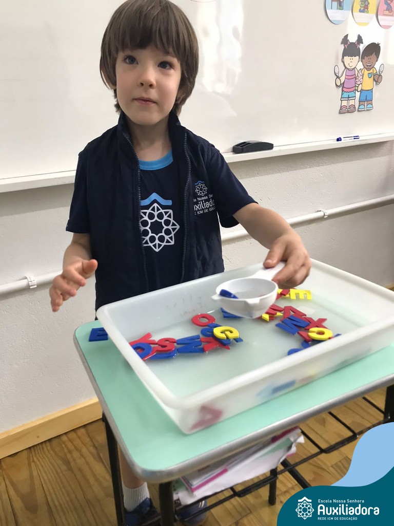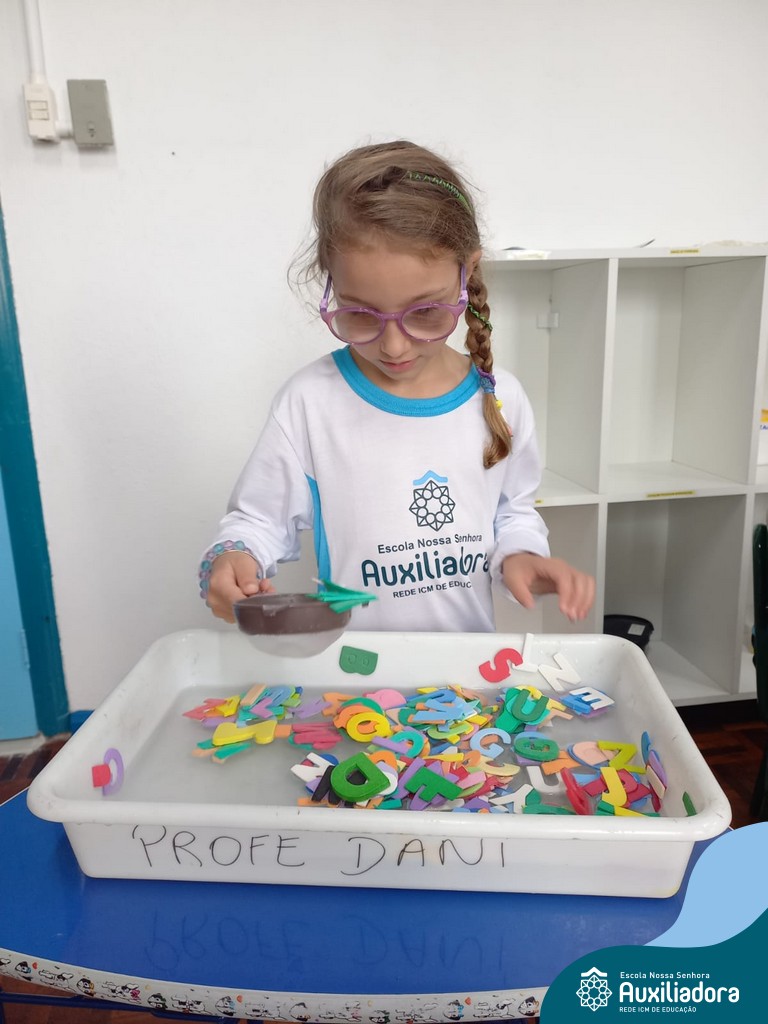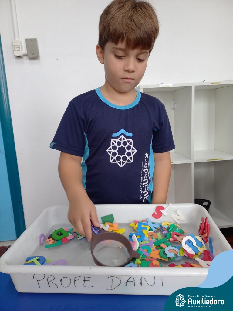 A partir da história “A escolinha do mar” a galerinha do Pré 2 conheceu vários peixinhos. As crianças trabalharam sobre a letra “P” da palavra peixe e uma das atividades realizadas foi a pesca das letras com auxílio de uma peneira.