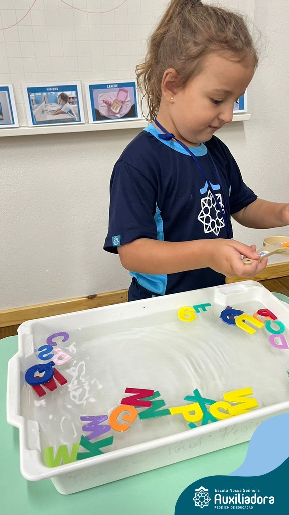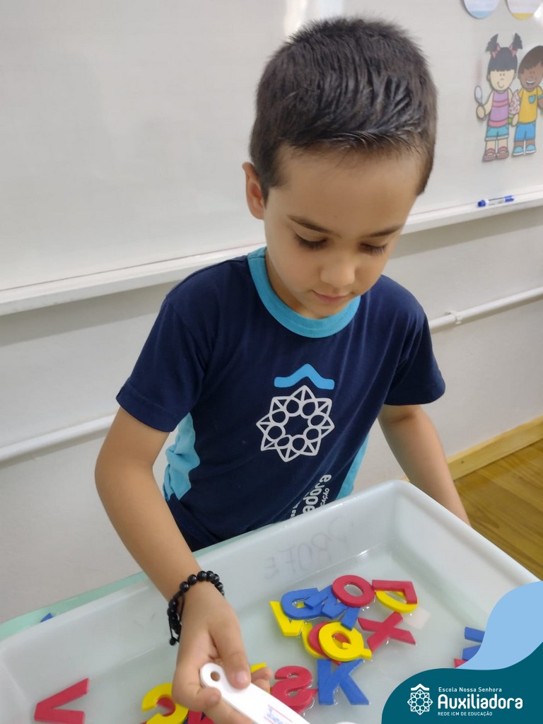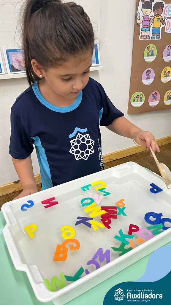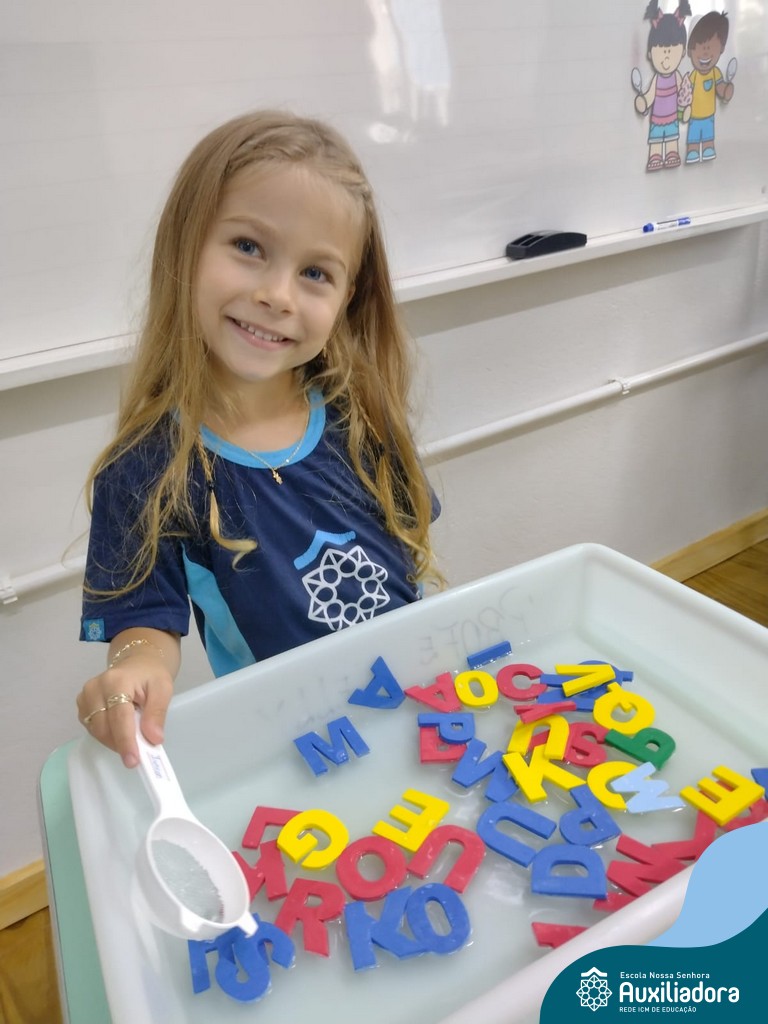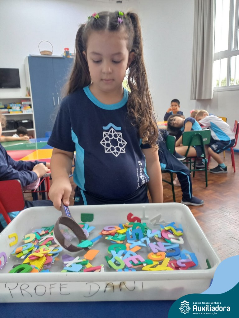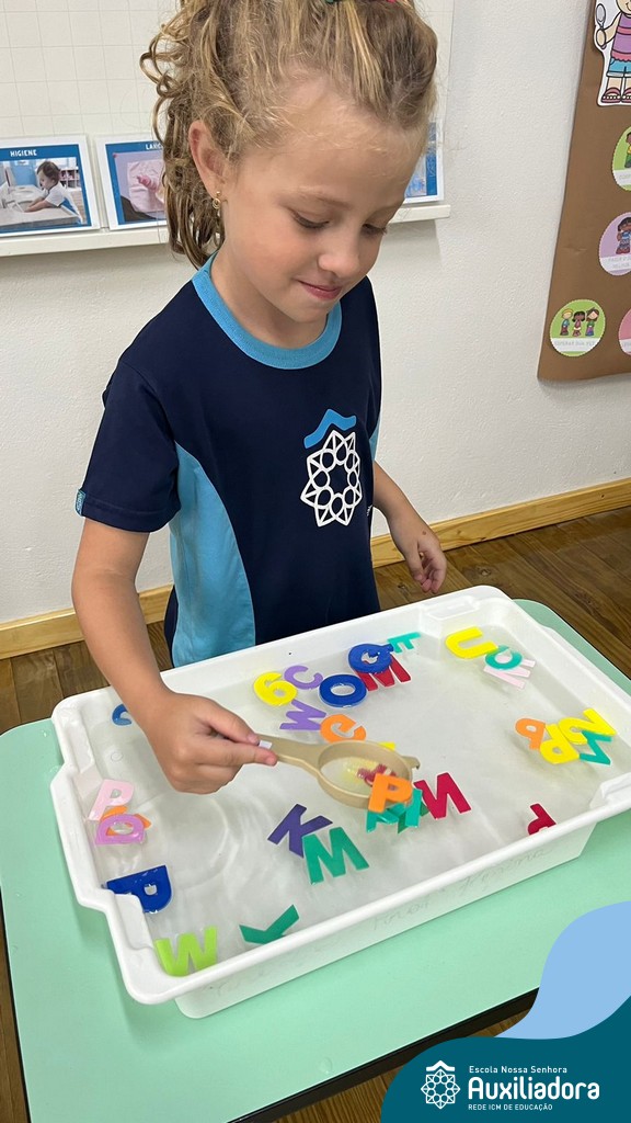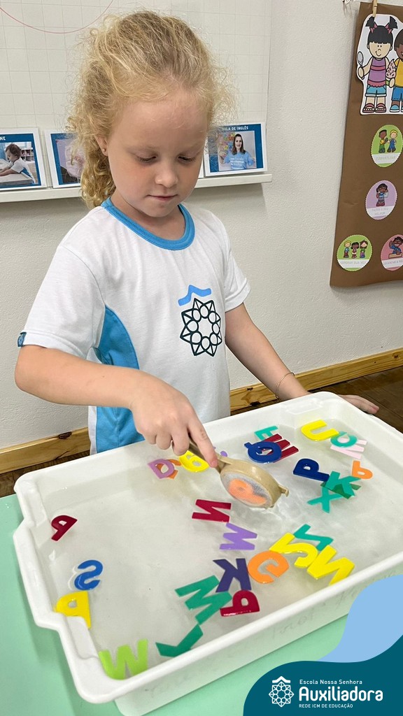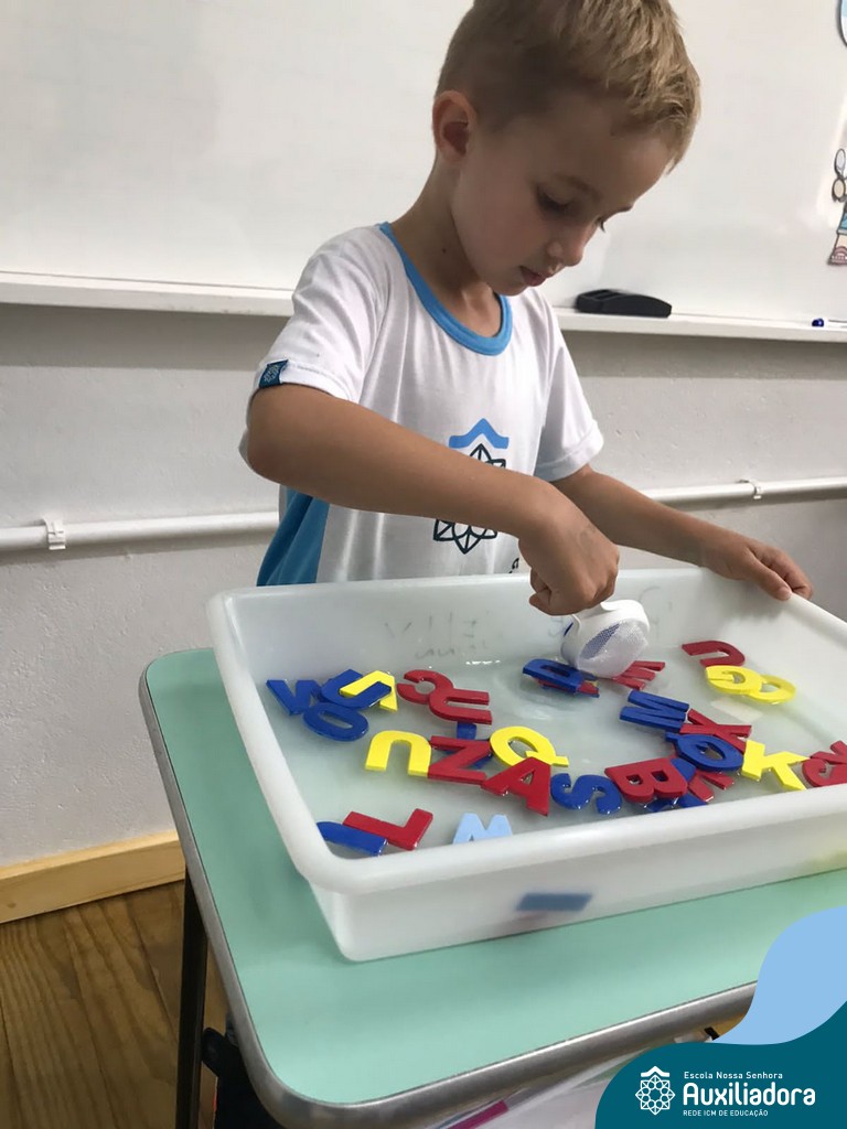 A partir da história “A escolinha do mar” a galerinha do Pré 2 conheceu vários peixinhos. As crianças trabalharam sobre a letra “P” da palavra peixe e uma das atividades realizadas foi a pesca das letras com auxílio de uma peneira.