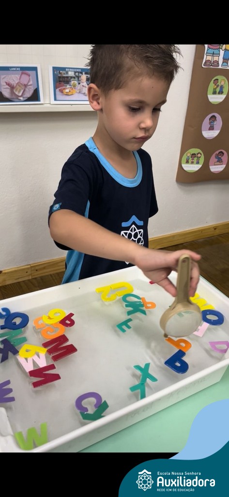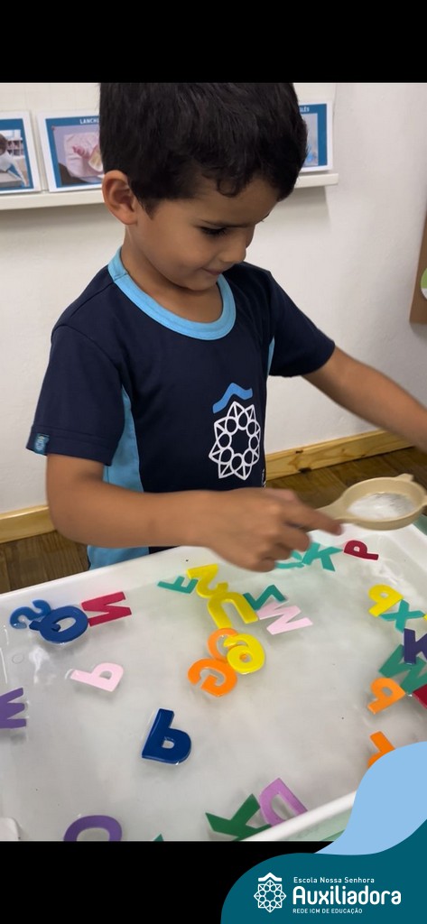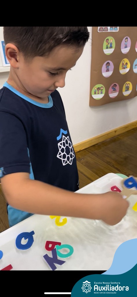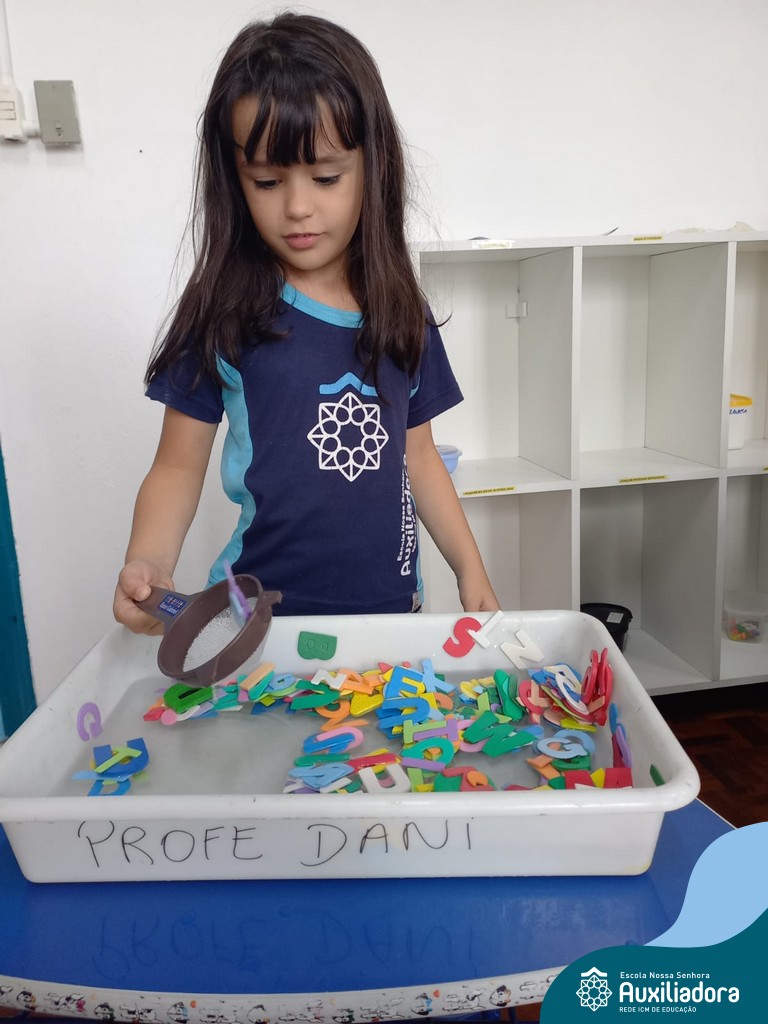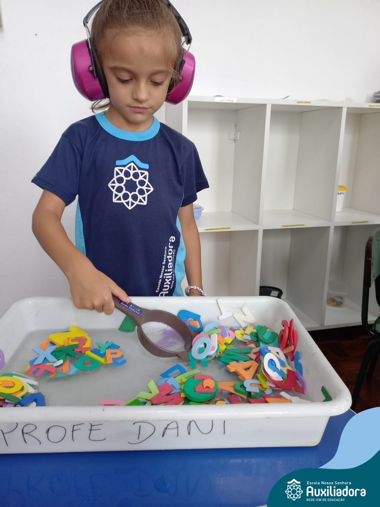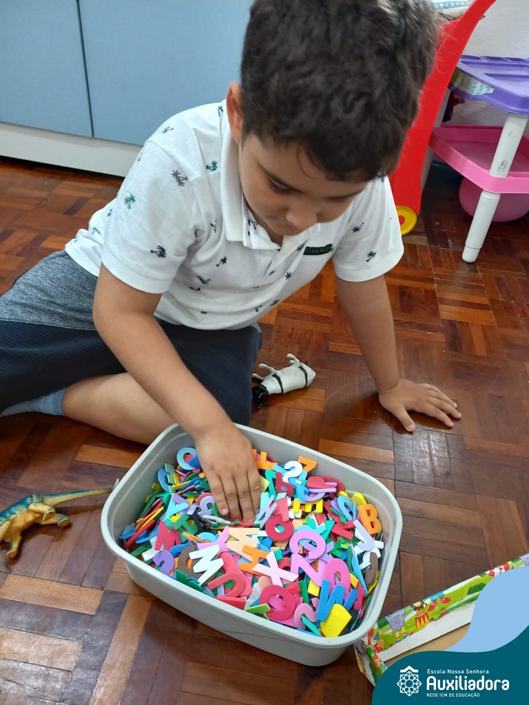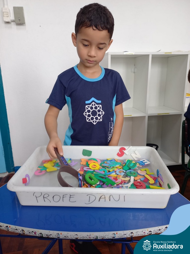 Foi um momento de exercitar a concentração, a motricidade fina, explorar diferentes texturas, além de estabelecer relações com outras palavras que iniciam com essa letra.