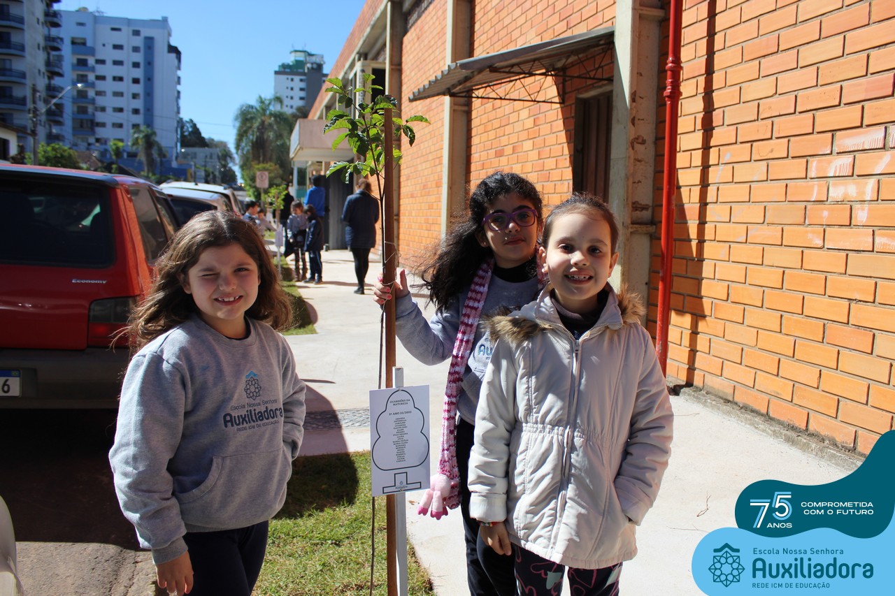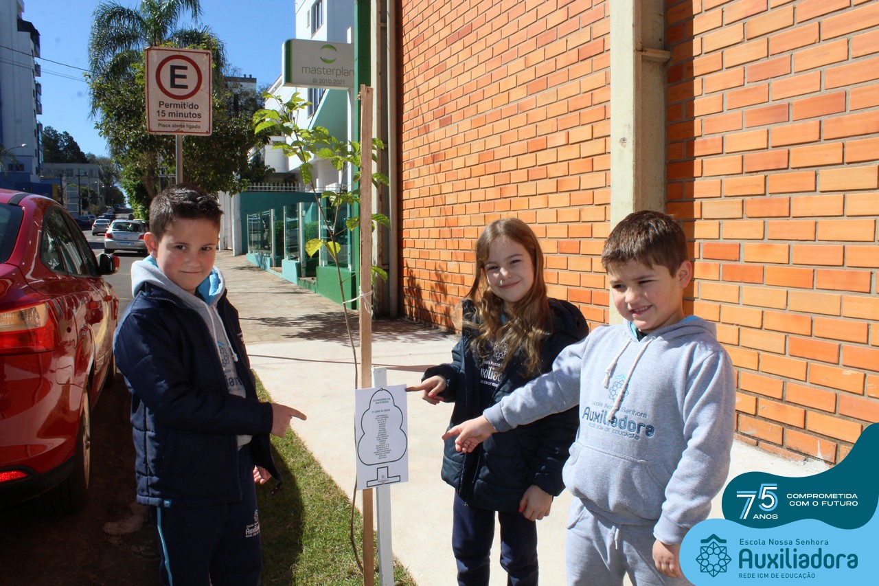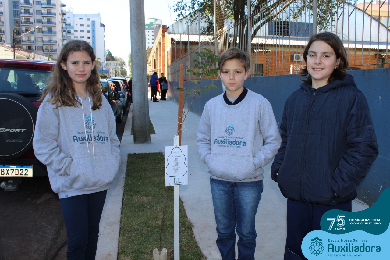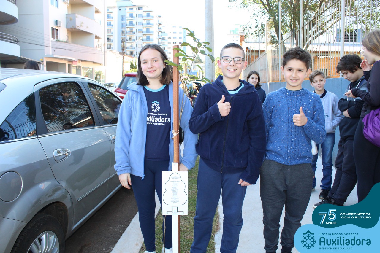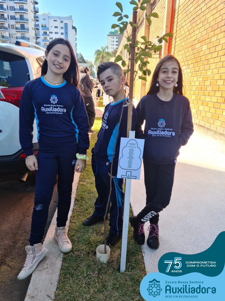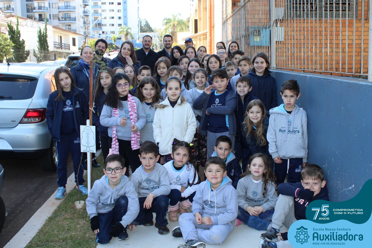 A ocasião contou com a presença dos alunos da Escola Nossa Senhora Auxiliadora, do 1° ao 5° ano, que “adotaram” as árvores plantadas.