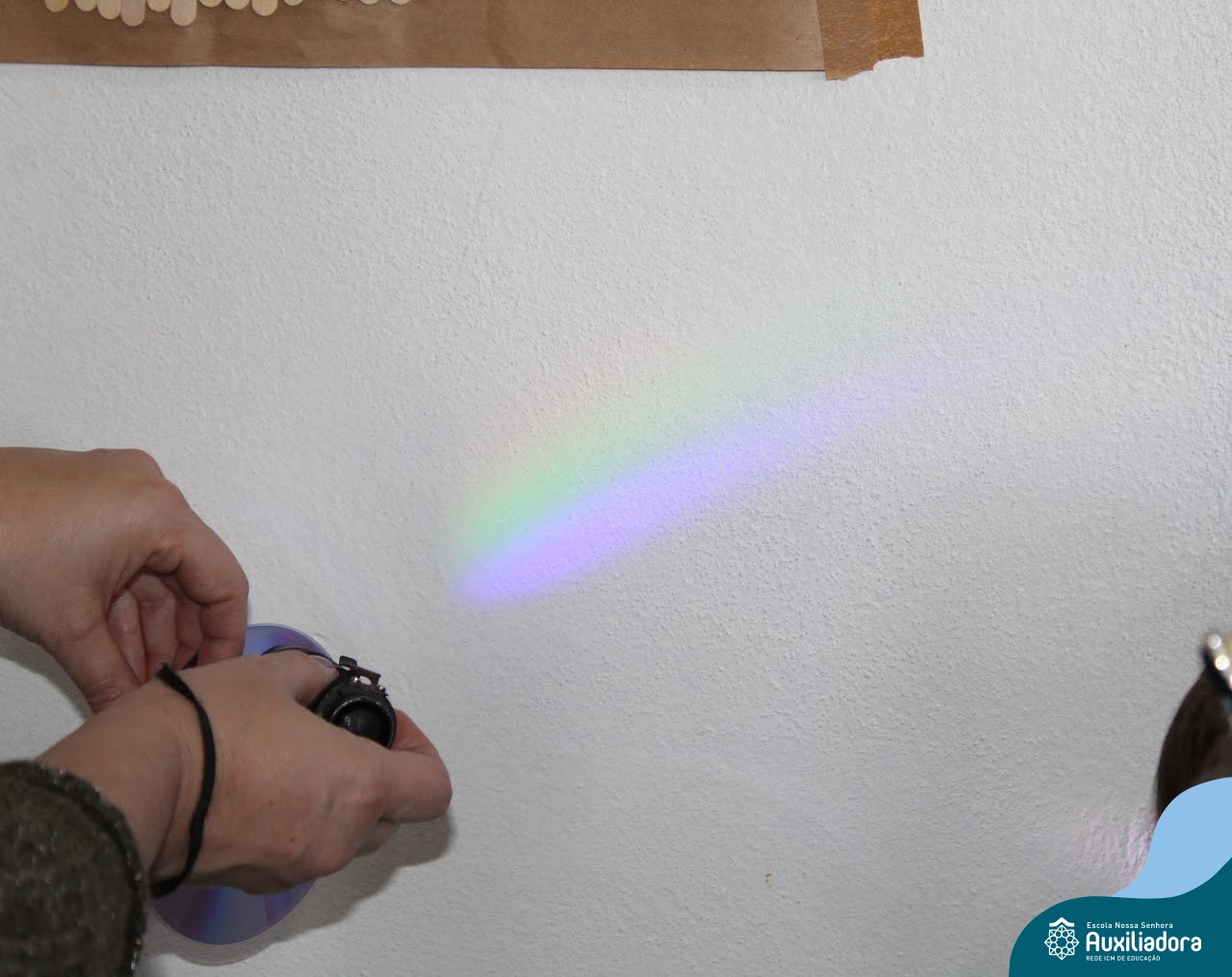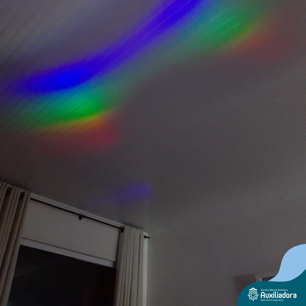 Deste modo, ativamos nosso conhecimento prévio deste fenômeno natural através de um questionamento; realizamos experimentos para ver quais eram suas cores e do que ele era feito; além de provar que era possível criar um arco-íris.