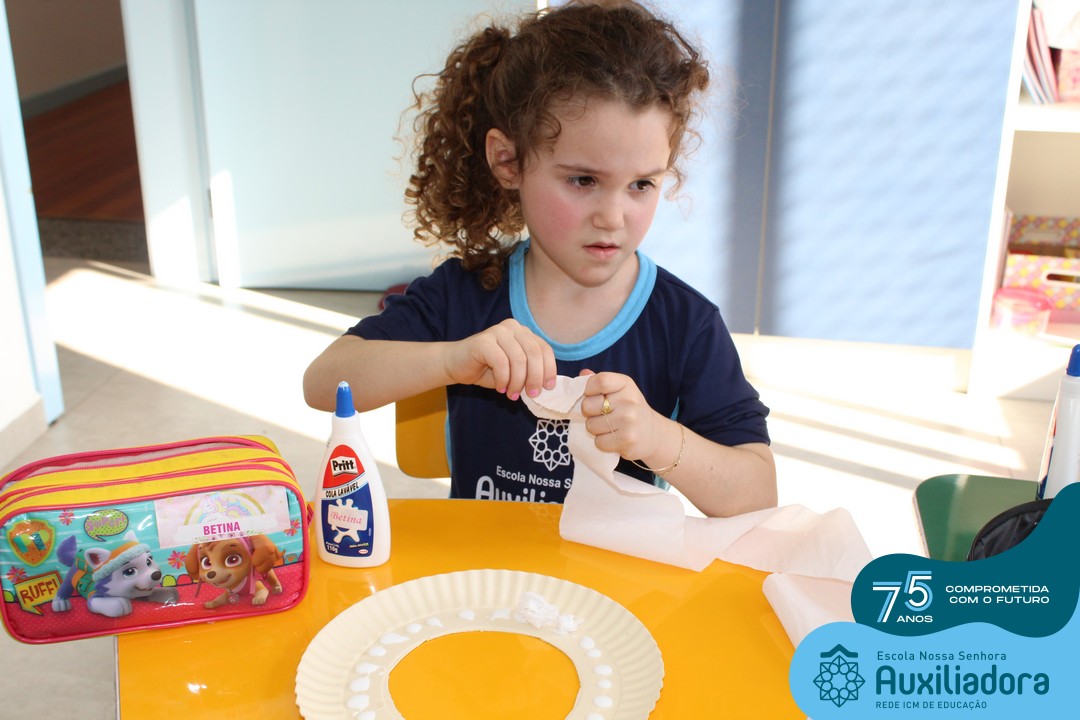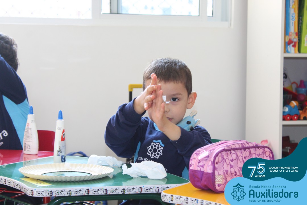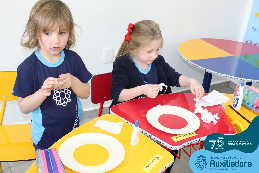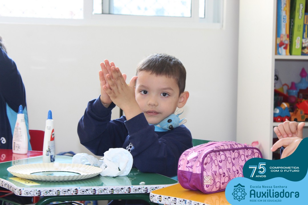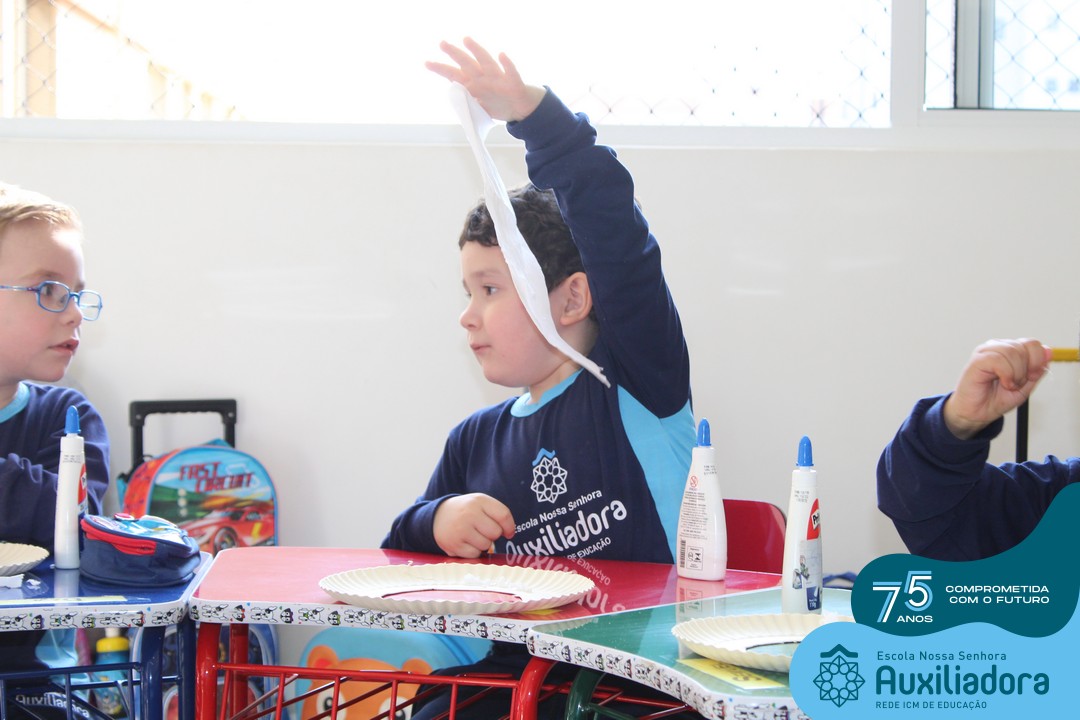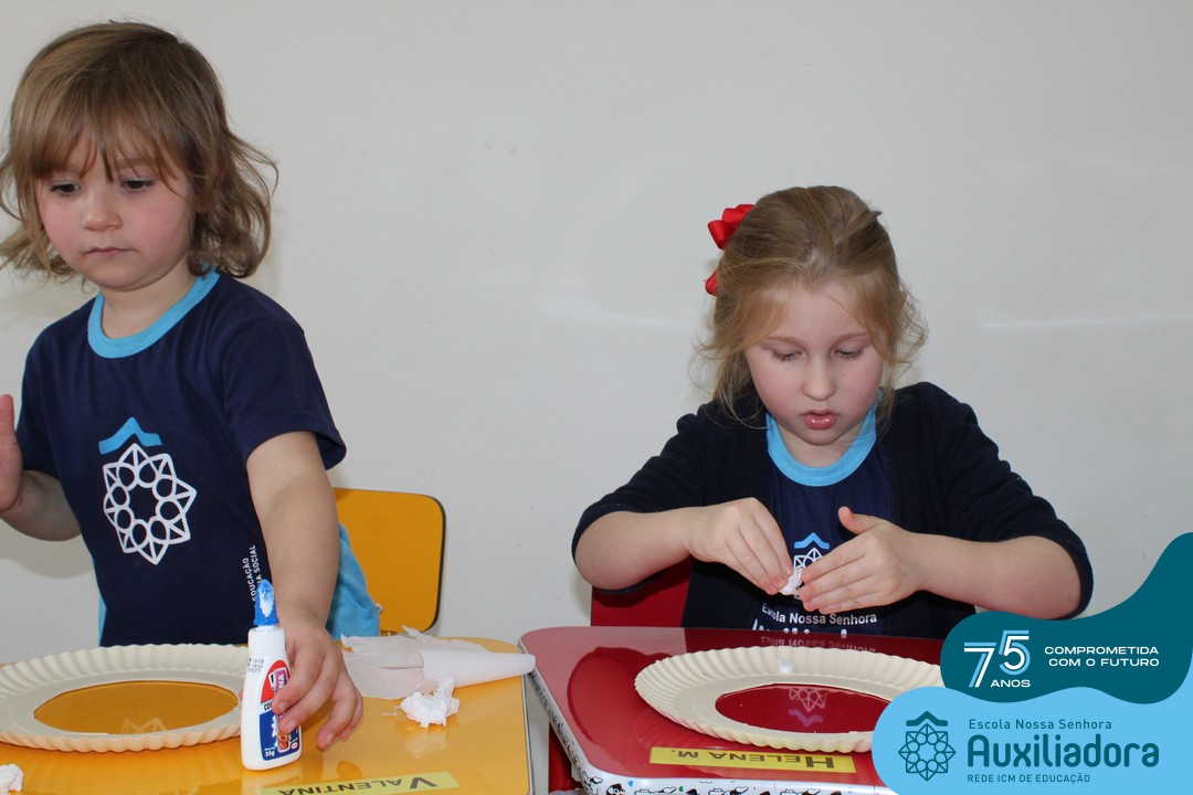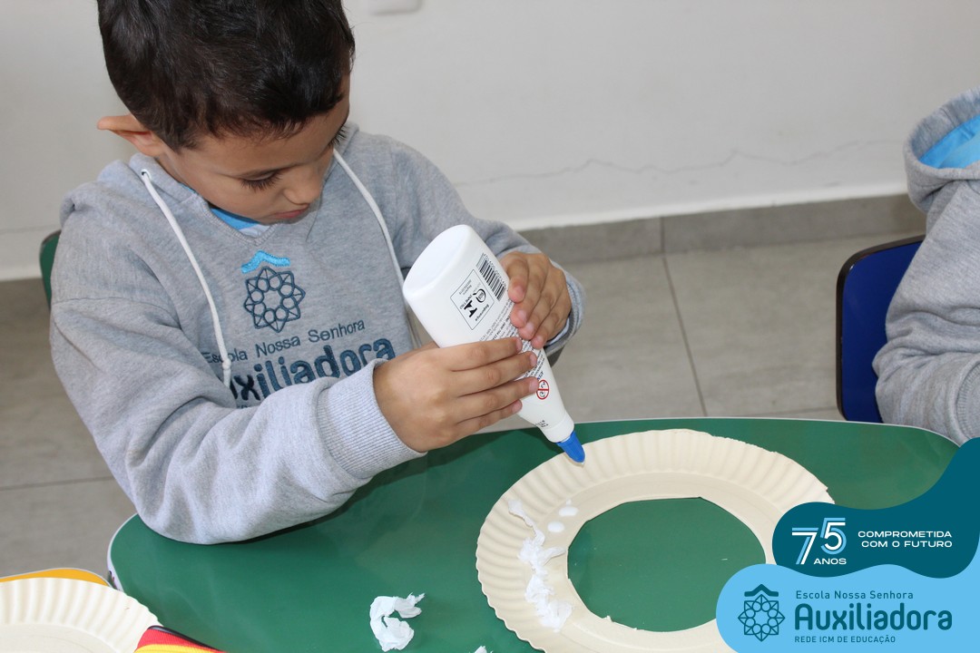 Durante a atividade, exercitamos o vocabulário, a coordenação motora e a ludicidade, pois aprendemos como nomear o animal em Inglês, fizemos bolinhas de papel para preencher a máscara deixando-a com a textura fofa como a lã da ovelha e também, nos divertimos imitando o bichinho.