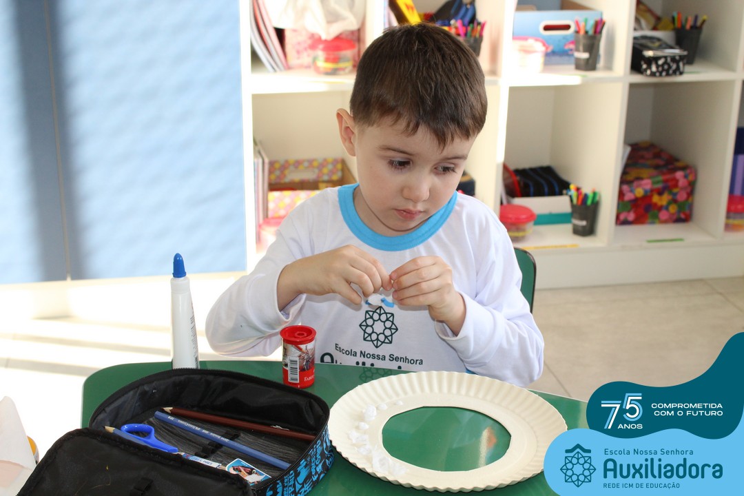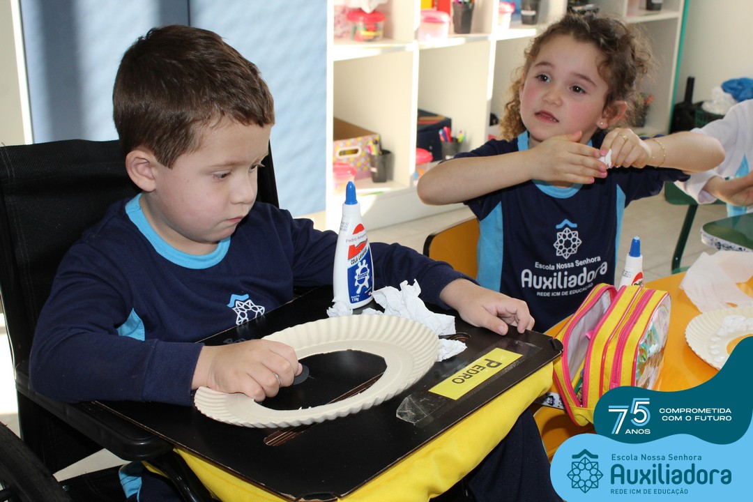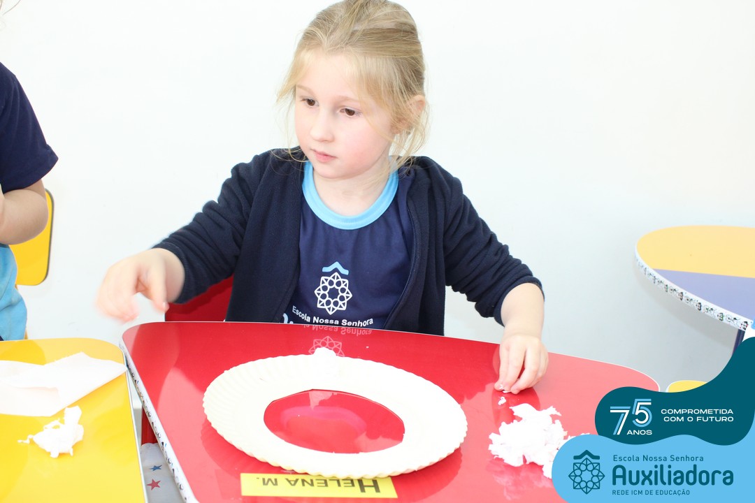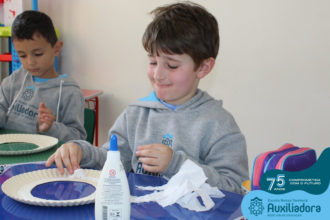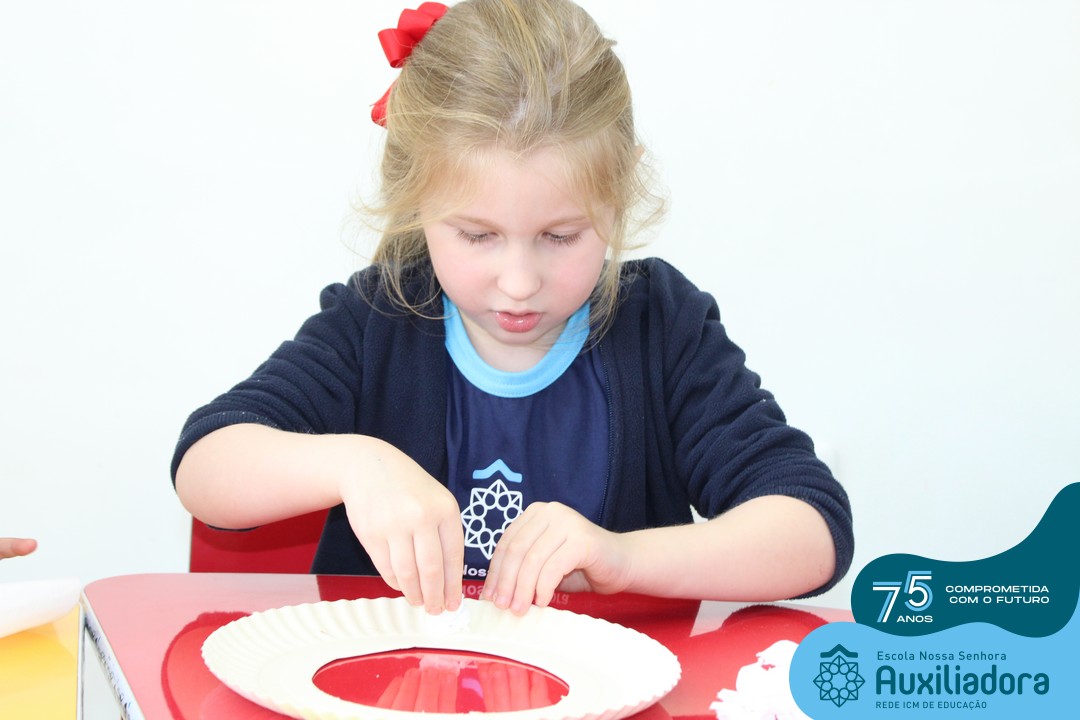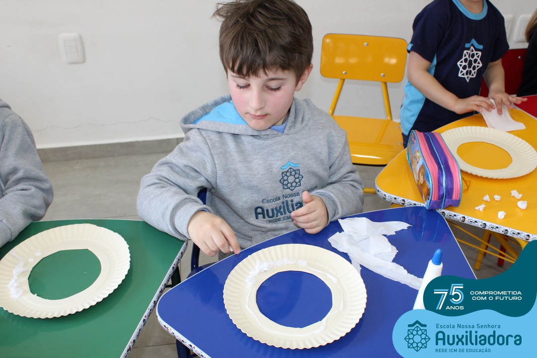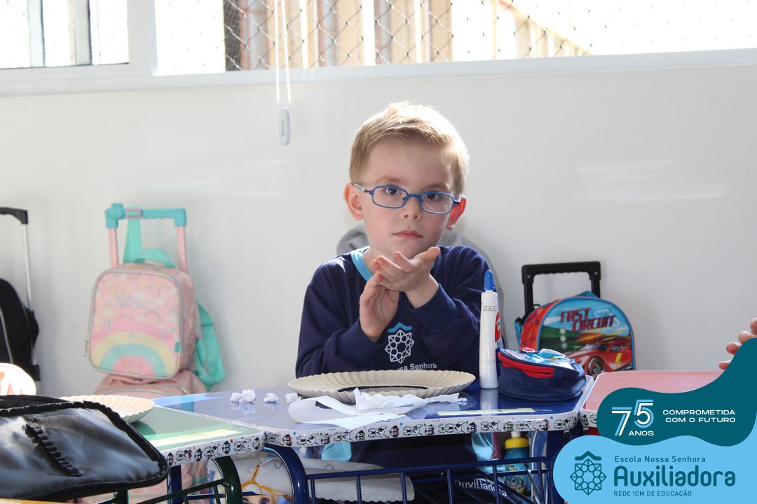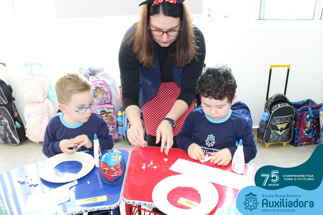 Durante a atividade, exercitamos o vocabulário, a coordenação motora e a ludicidade, pois aprendemos como nomear o animal em Inglês, fizemos bolinhas de papel para preencher a máscara deixando-a com a textura fofa como a lã da ovelha e também, nos divertimos imitando o bichinho.