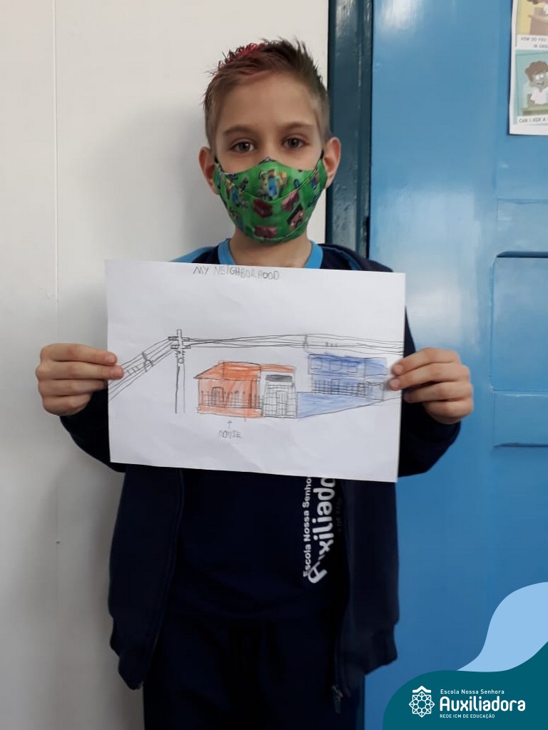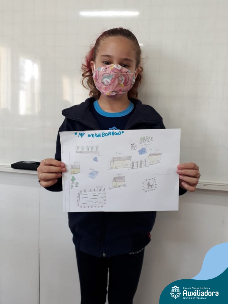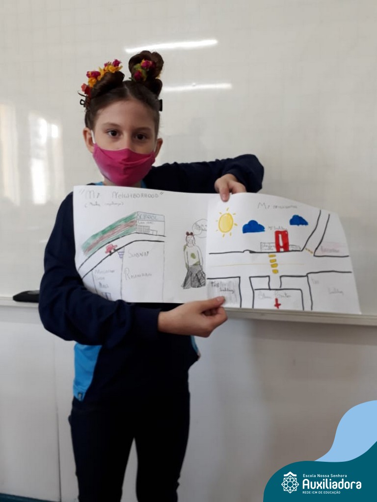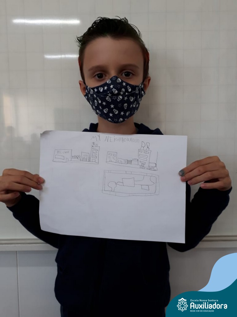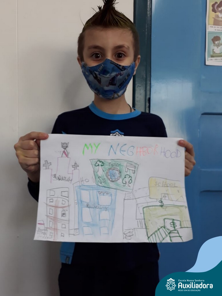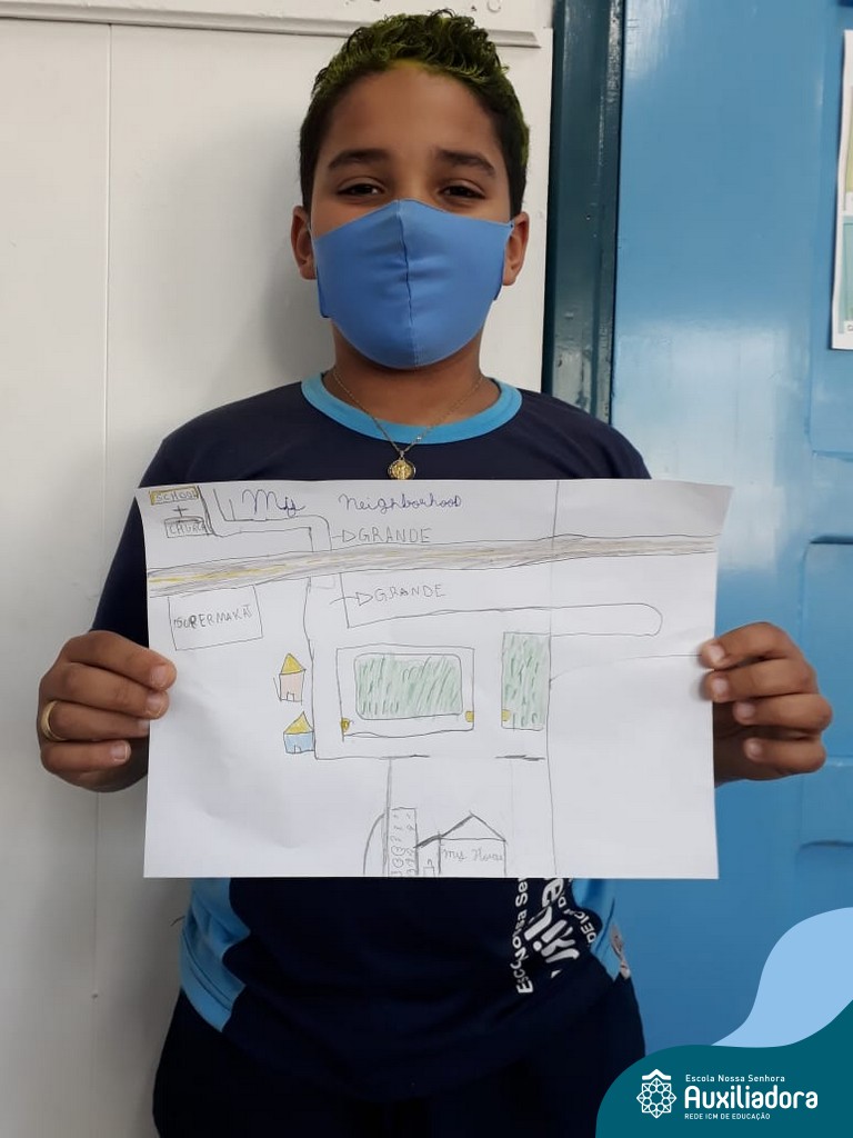 As turmas 31 e 32, na disciplina de Inglês, com o teacher Diego, fizeram atividades sobre “My neighborhood” – Minha vizinhança. Como forma de aprender o nome dos espaços que compõem a cidade, os alunos desenharam o lugar onde vivem e os nomearam em Inglês.