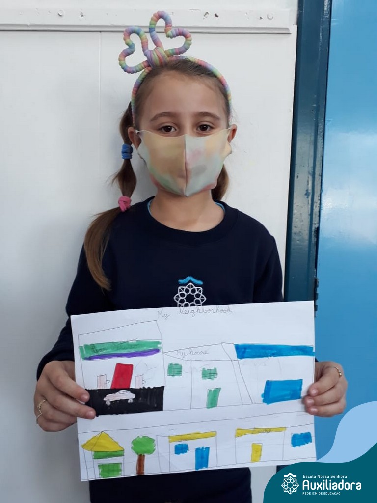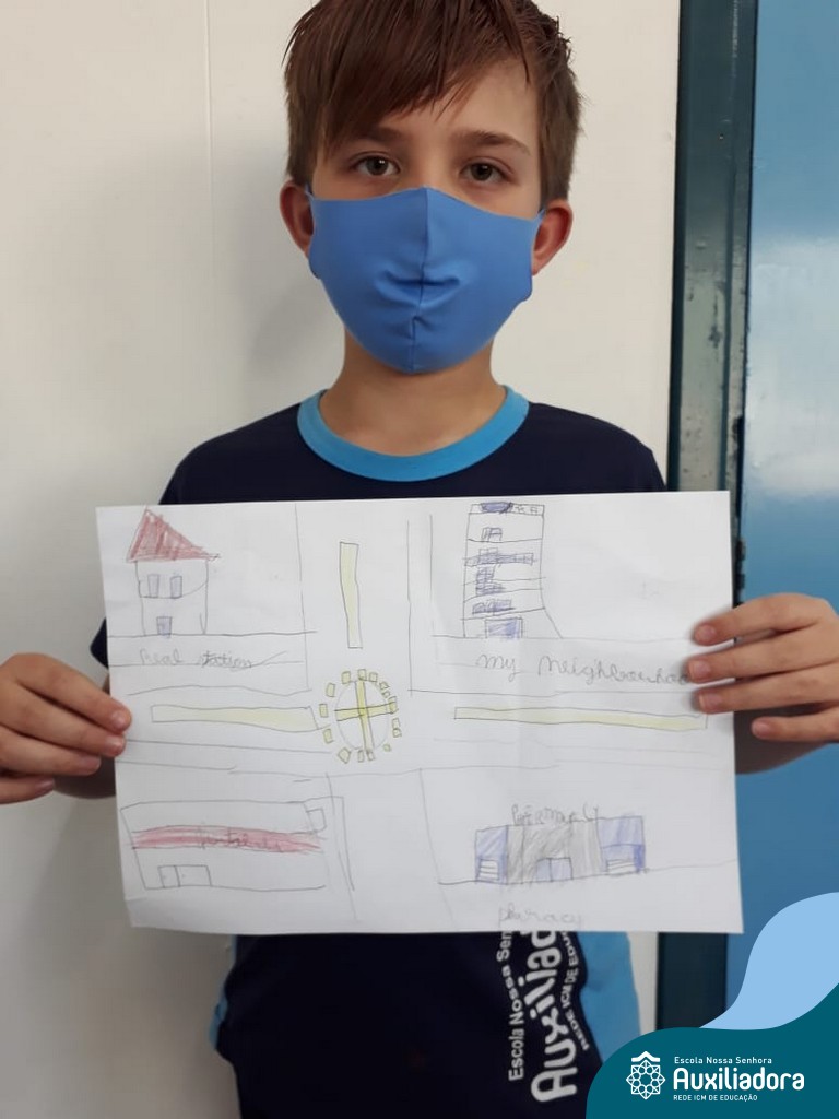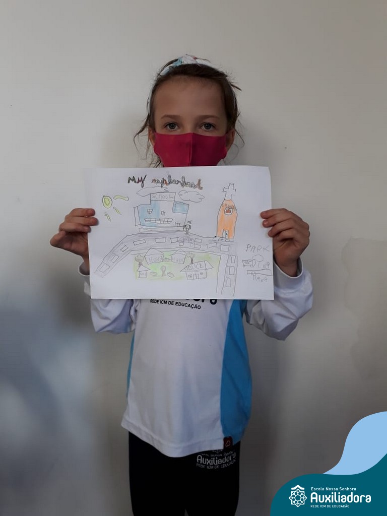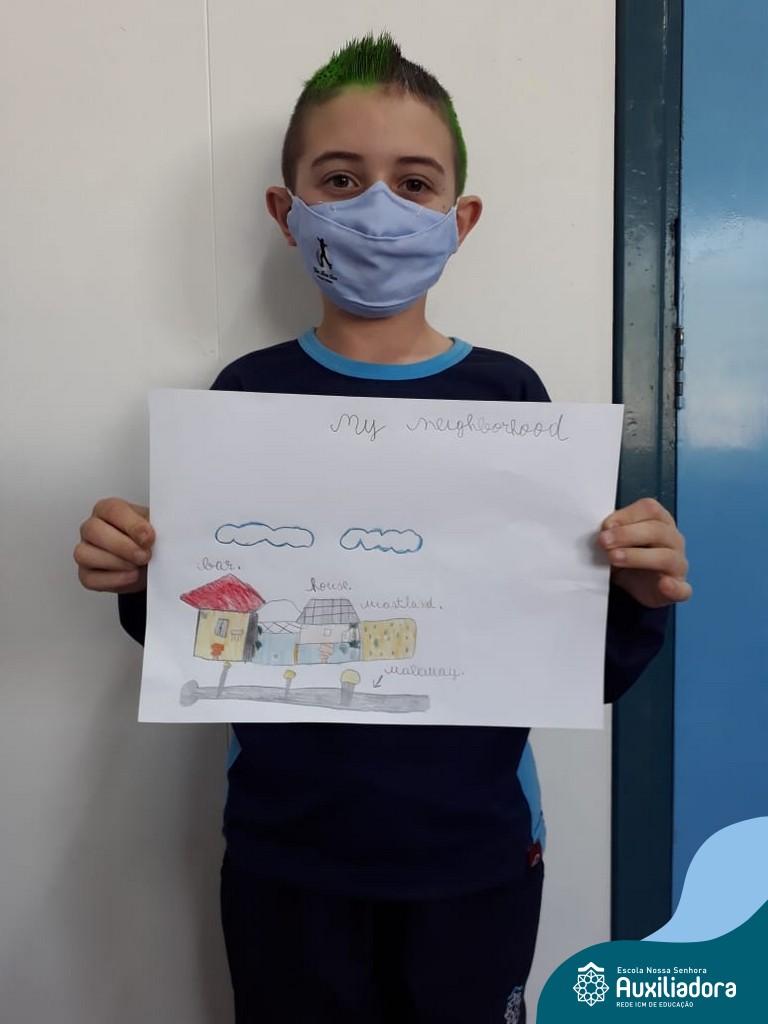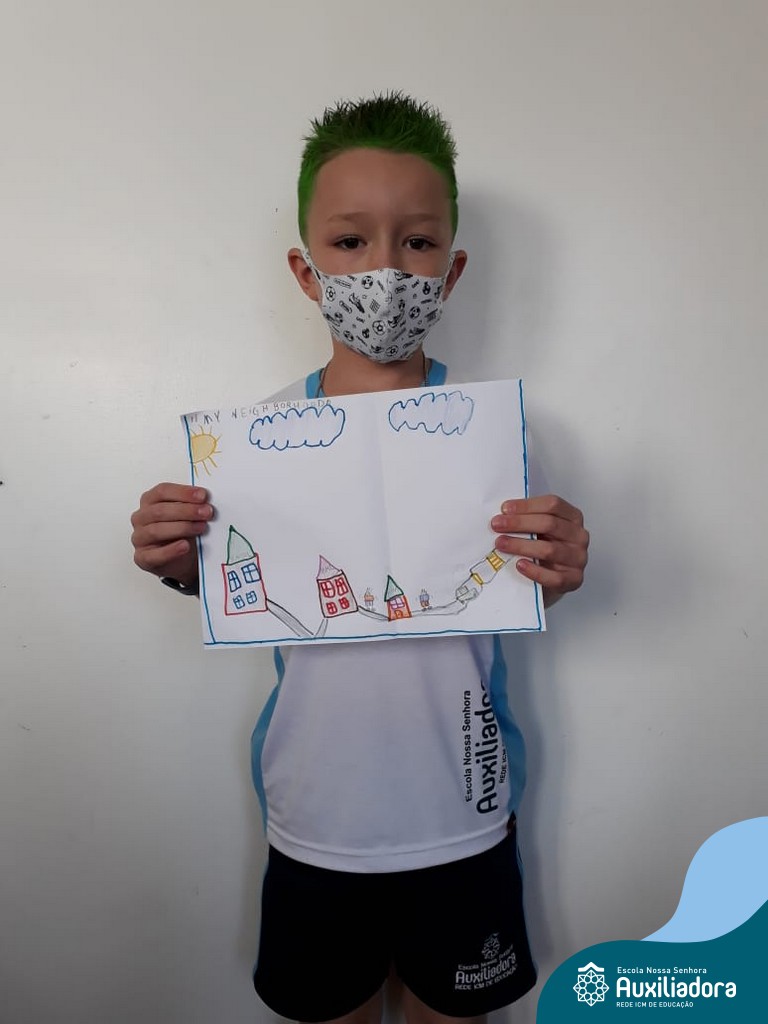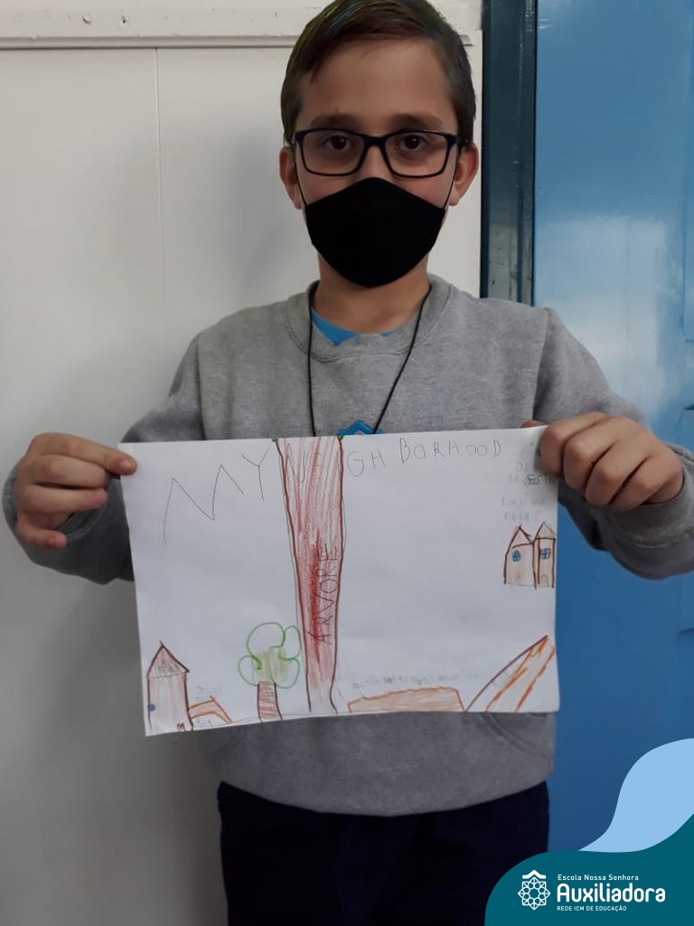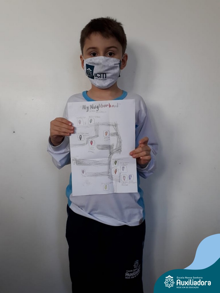 As turmas 31 e 32, na disciplina de Inglês, com o teacher Diego, fizeram atividades sobre “My neighborhood” – Minha vizinhança. Como forma de aprender o nome dos espaços que compõem a cidade, os alunos desenharam o lugar onde vivem e os nomearam em Inglês.