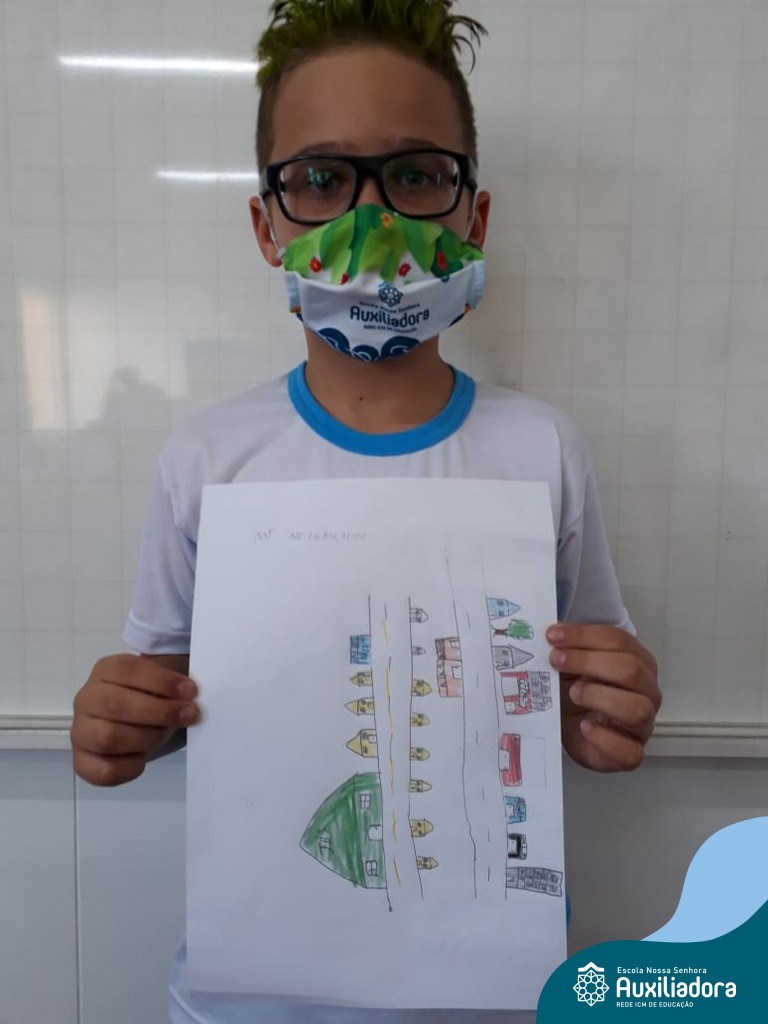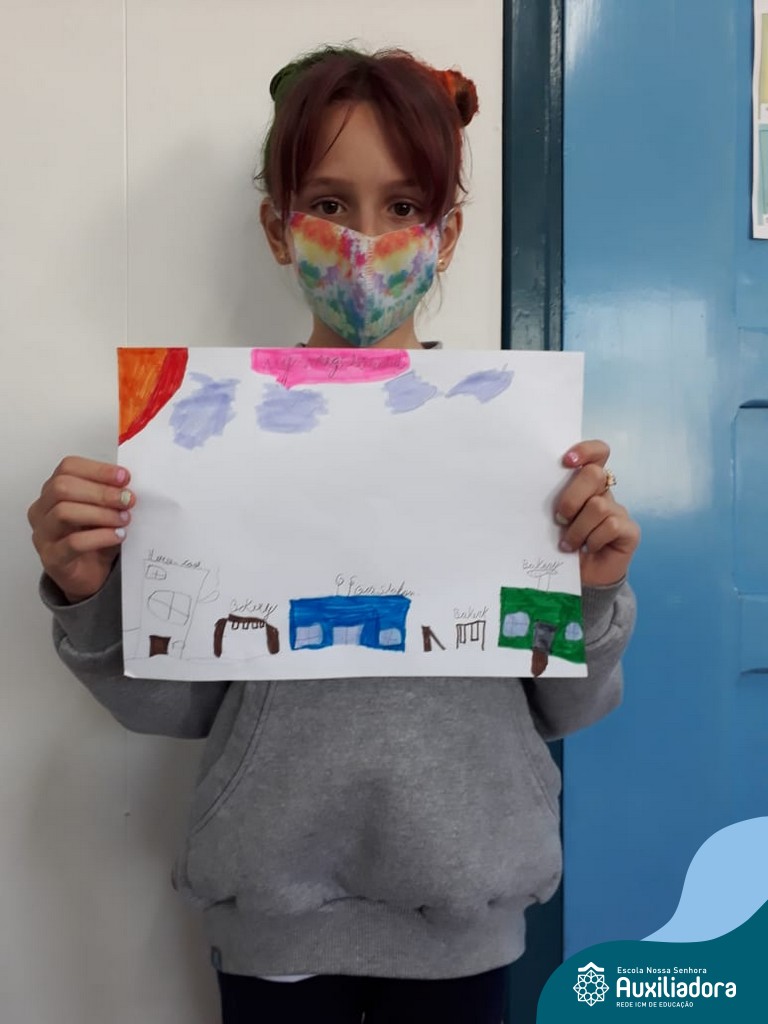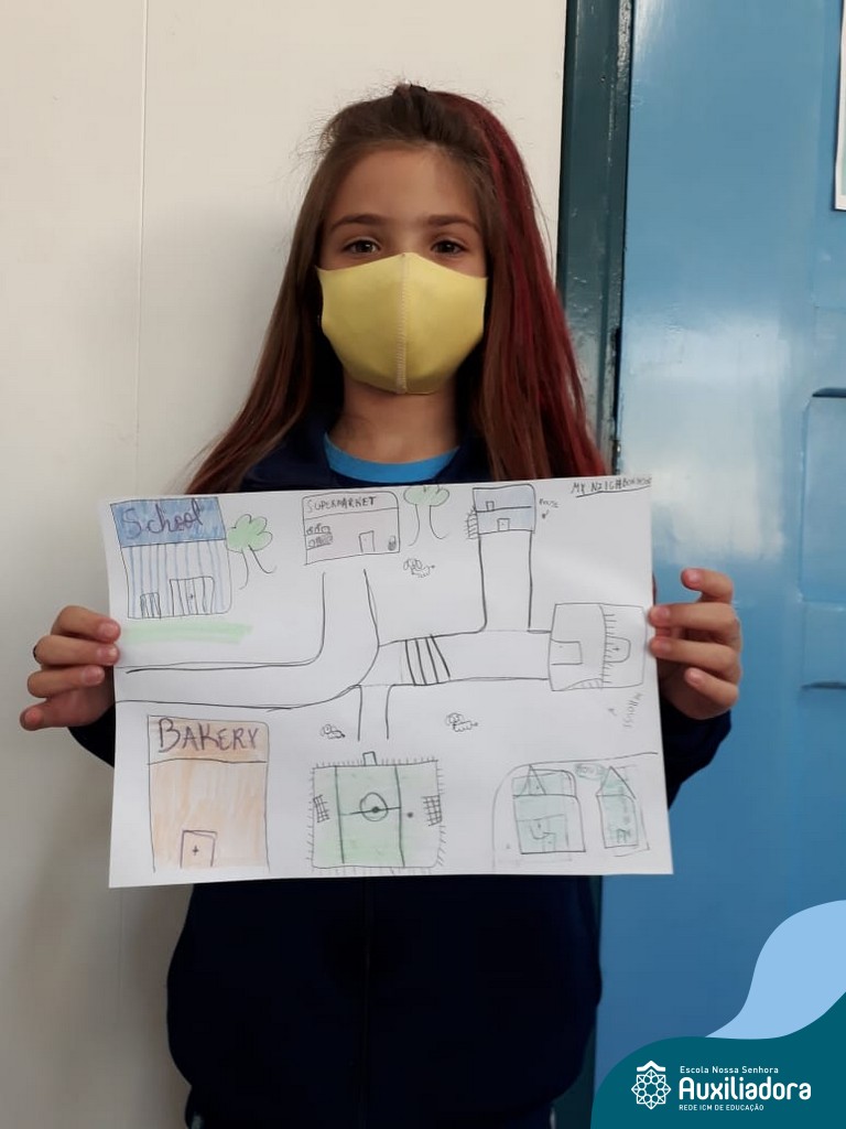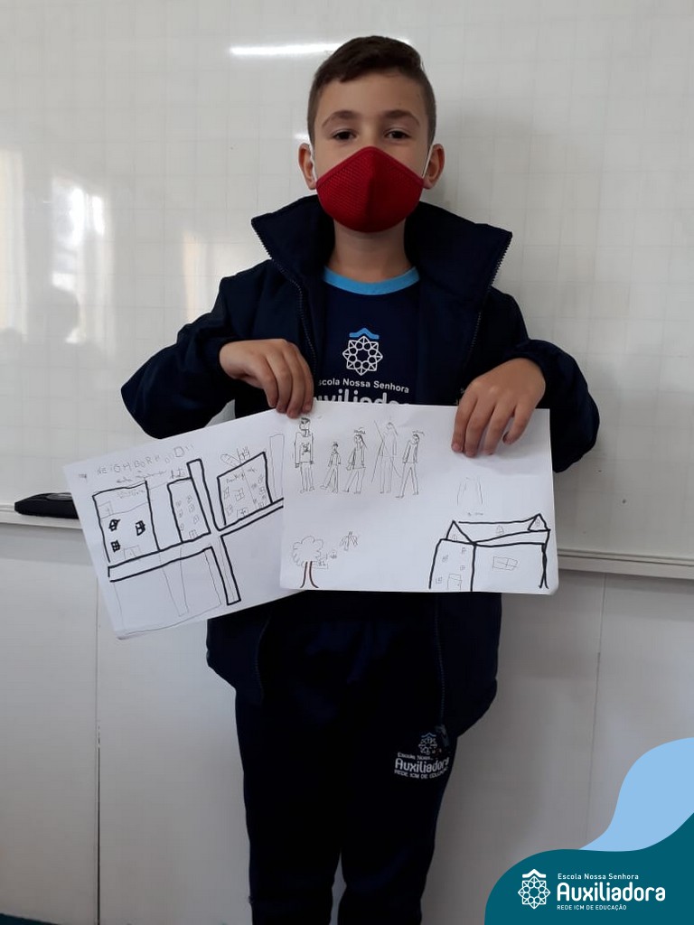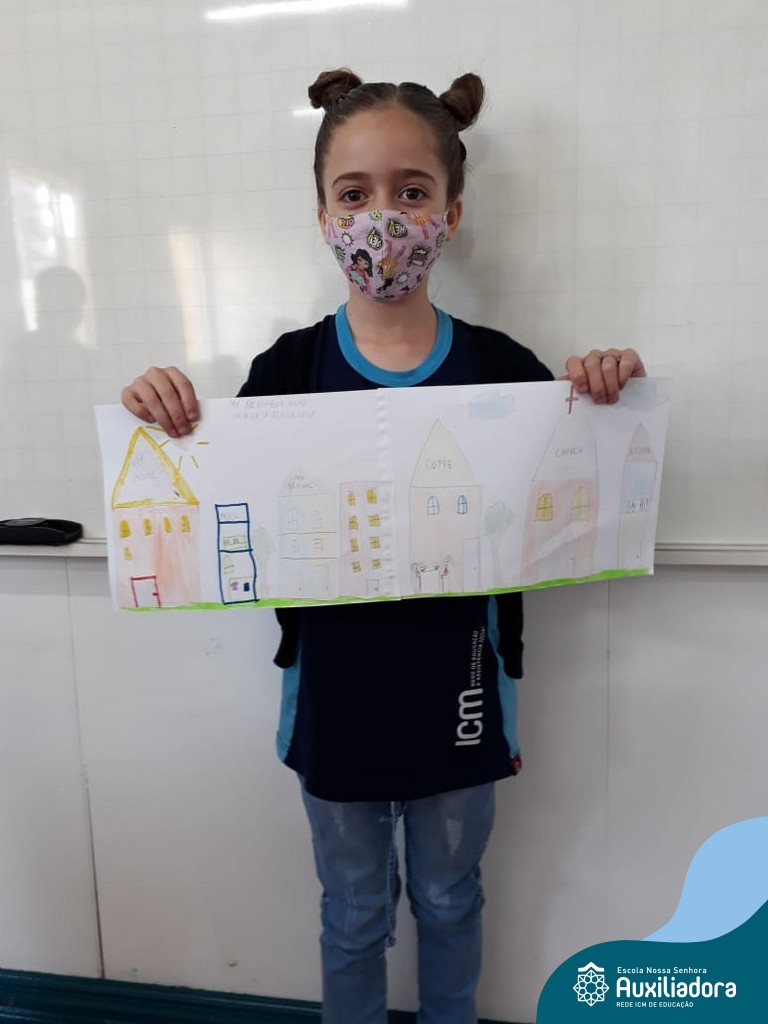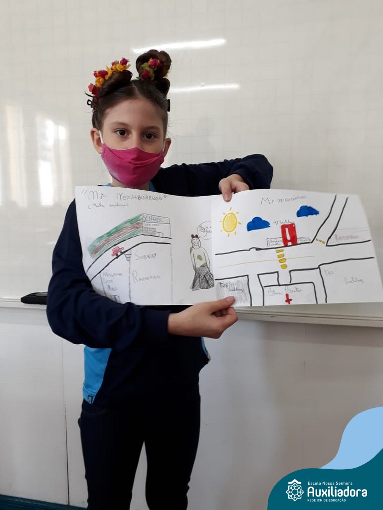 As turmas 31 e 32, na disciplina de Inglês, com o teacher Diego, fizeram atividades sobre “My neighborhood” – Minha vizinhança. Como forma de aprender o nome dos espaços que compõem a cidade, os alunos desenharam o lugar onde vivem e os nomearam em Inglês.