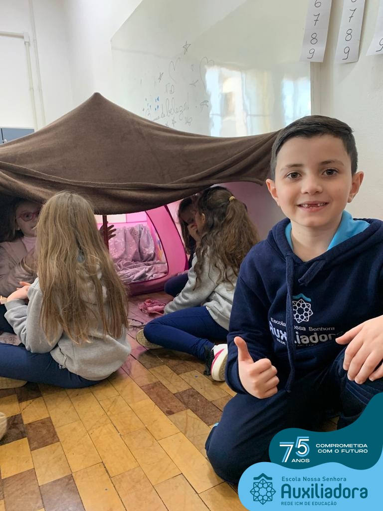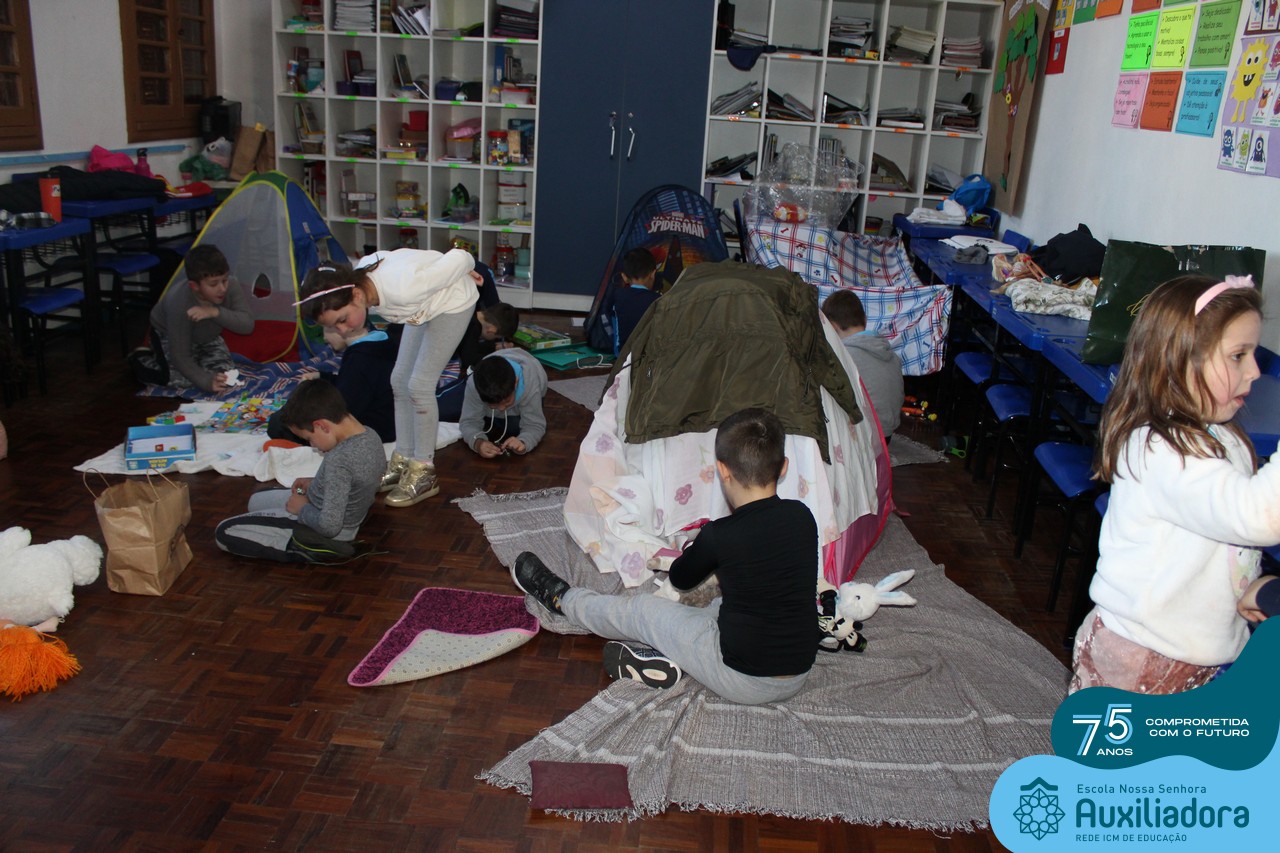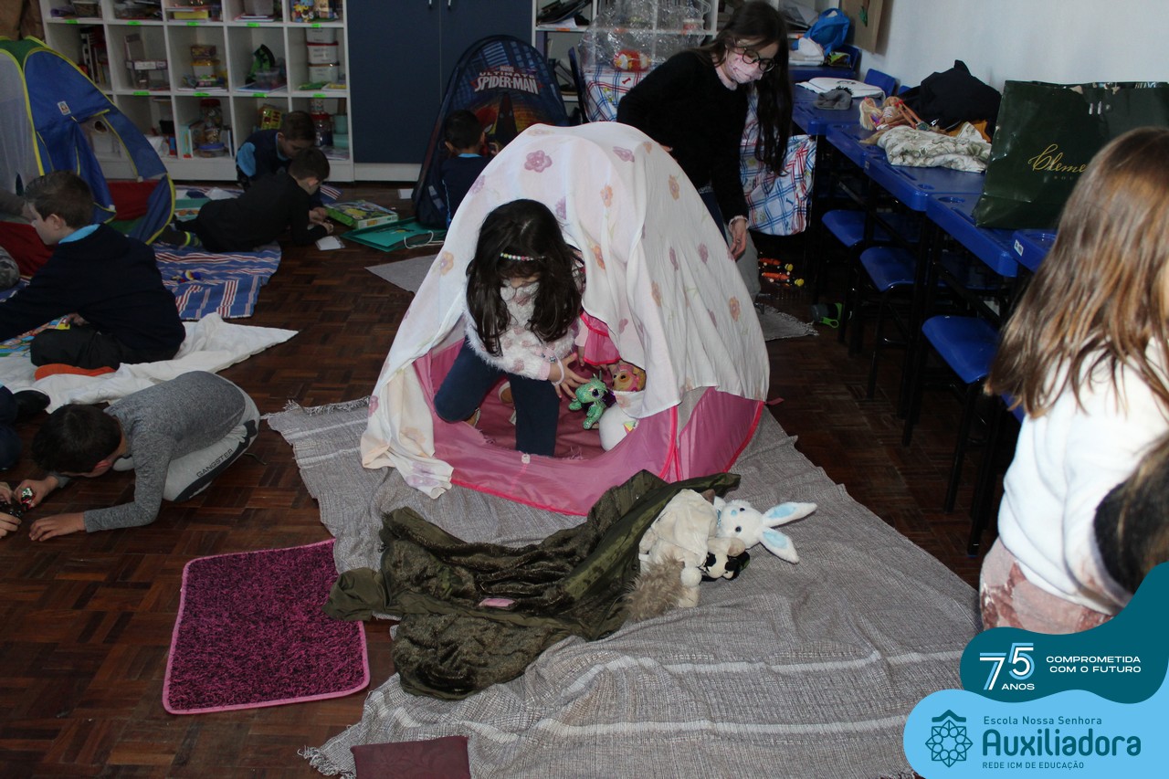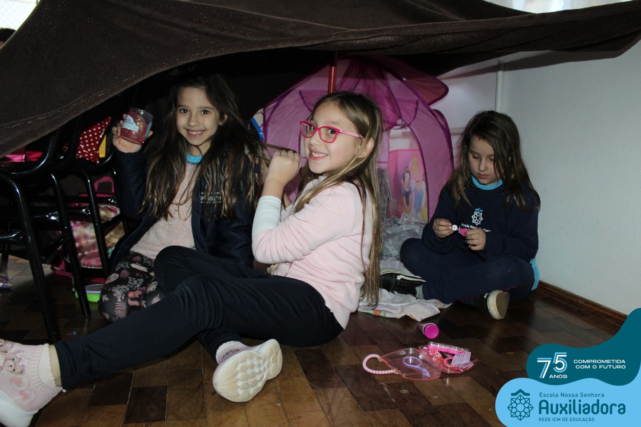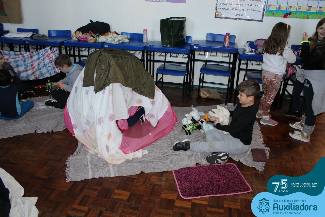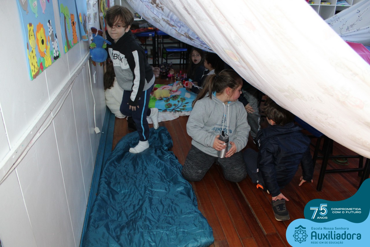 Também, de encerramento, as turmas de 1ºs e 2ºs anos tiveram um “ACAMPADENTRO TEMÁTICO”⛺️ na sala, em que as crianças trouxeram lençóis, tocas e brinquedos escolhidos em grupos para montarem cada espaço e desfrutarem da diversão com os amigos.