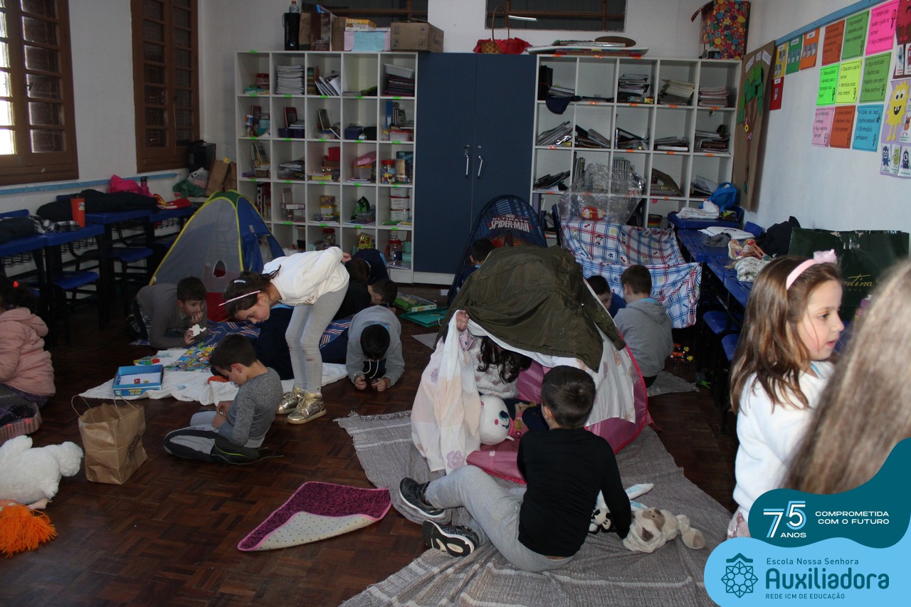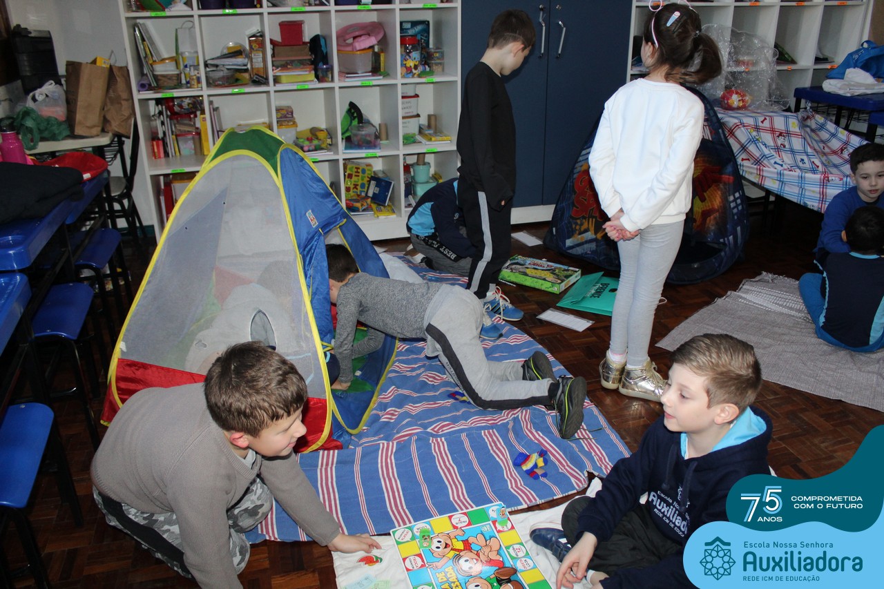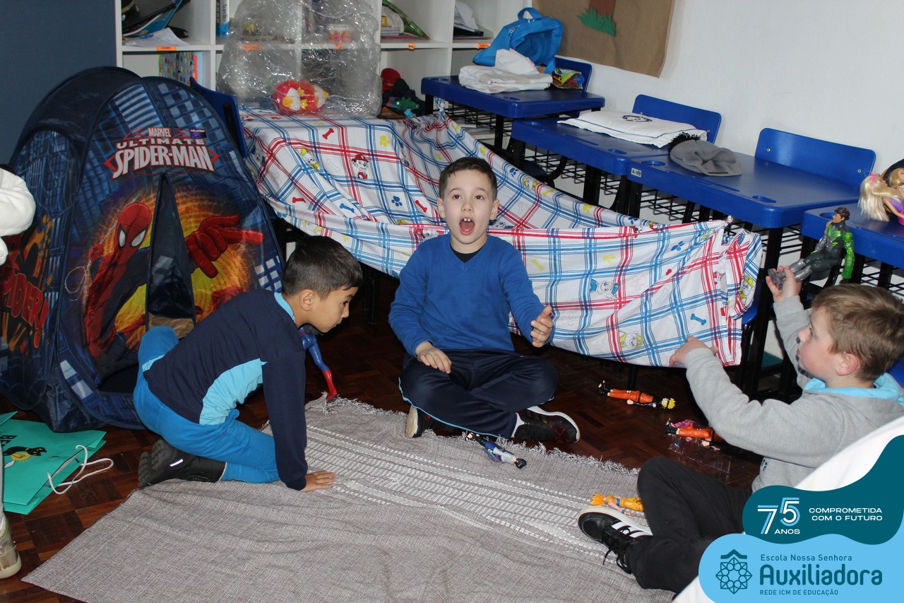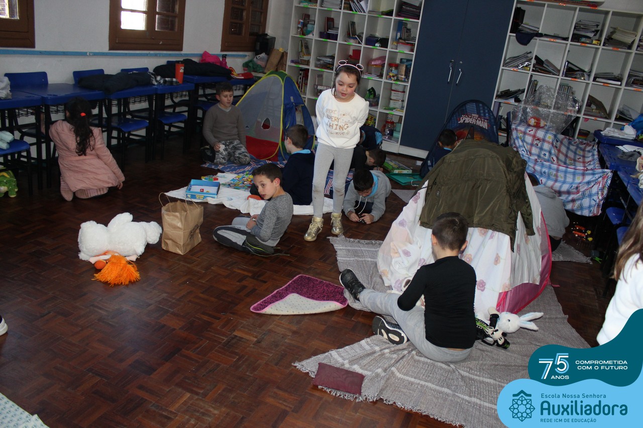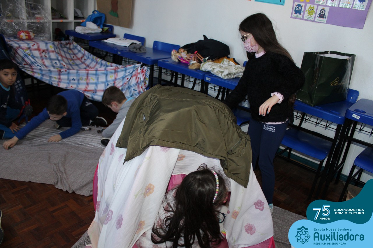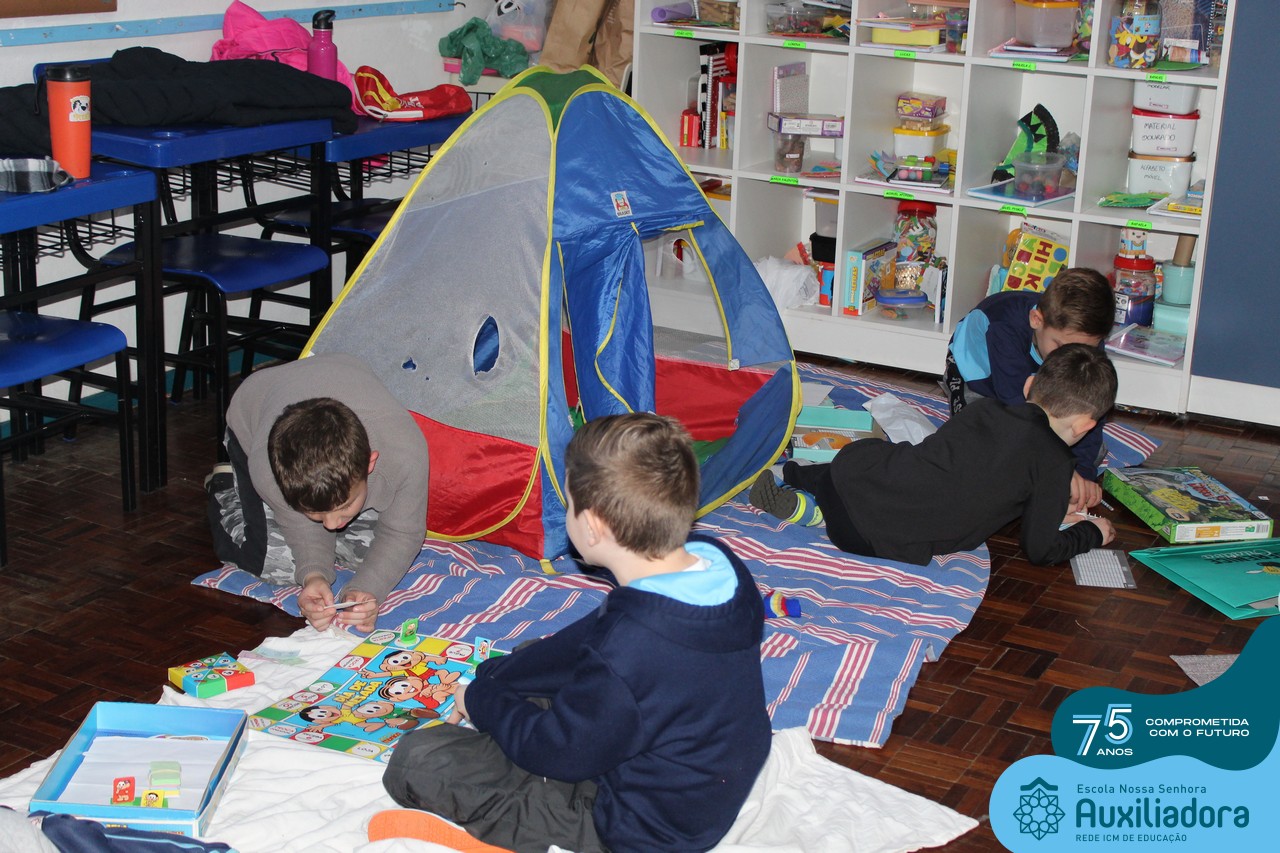Também, de encerramento, as turmas de 1ºs e 2ºs anos tiveram um “ACAMPADENTRO TEMÁTICO”⛺️ na sala, em que as crianças trouxeram lençóis, tocas e brinquedos escolhidos em grupos para montarem cada espaço e desfrutarem da diversão com os amigos.