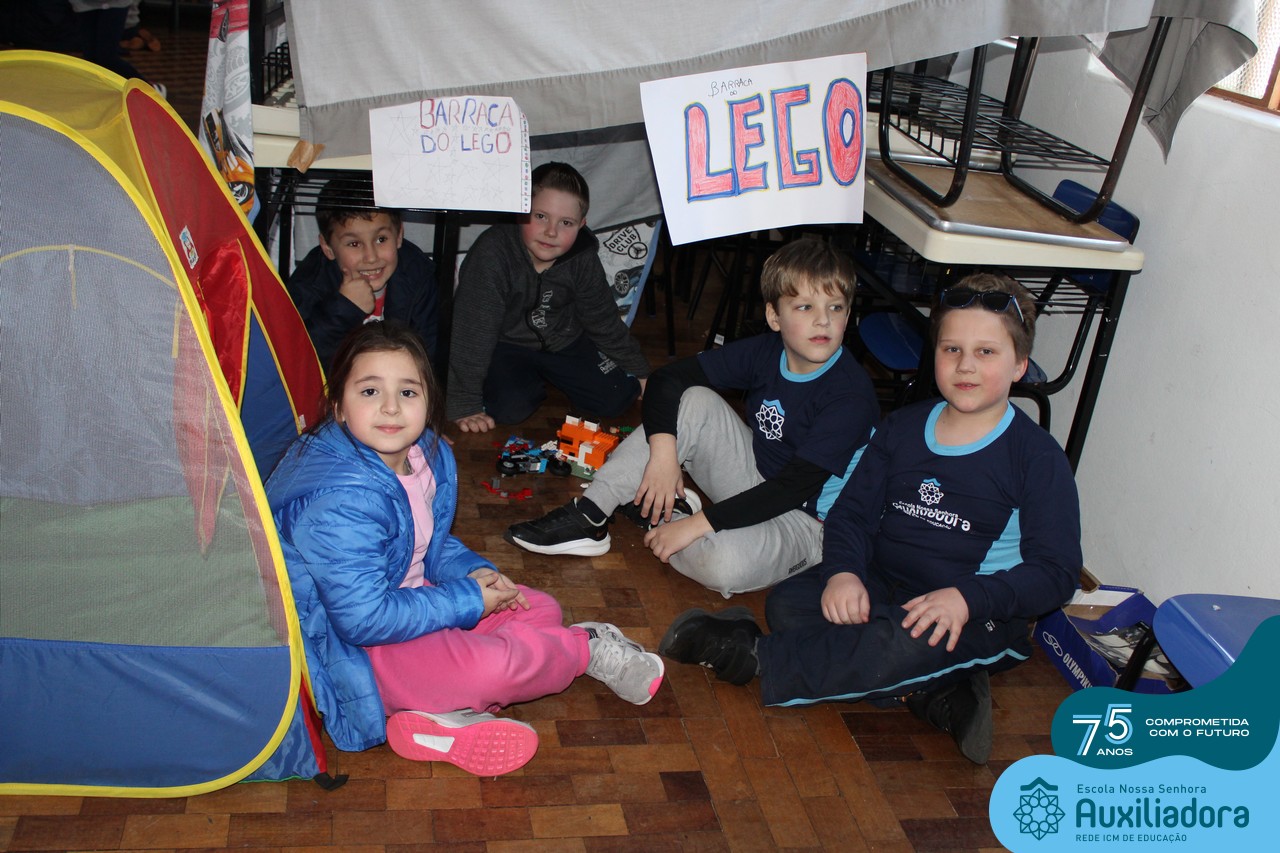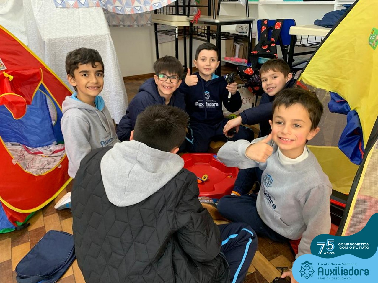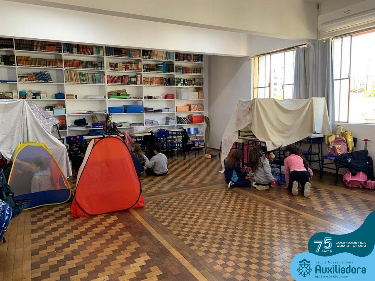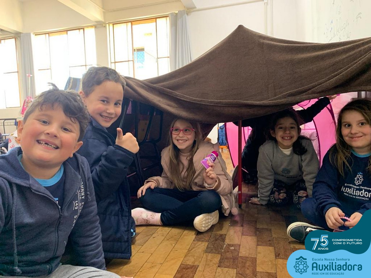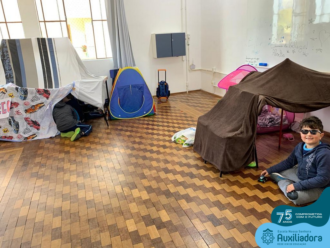 Também, de encerramento, as turmas de 1ºs e 2ºs anos tiveram um “ACAMPADENTRO TEMÁTICO”⛺️ na sala, em que as crianças trouxeram lençóis, tocas e brinquedos escolhidos em grupos para montarem cada espaço e desfrutarem da diversão com os amigos.