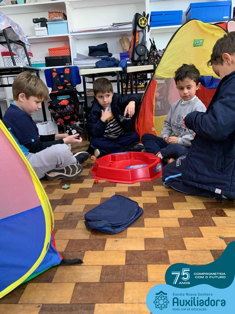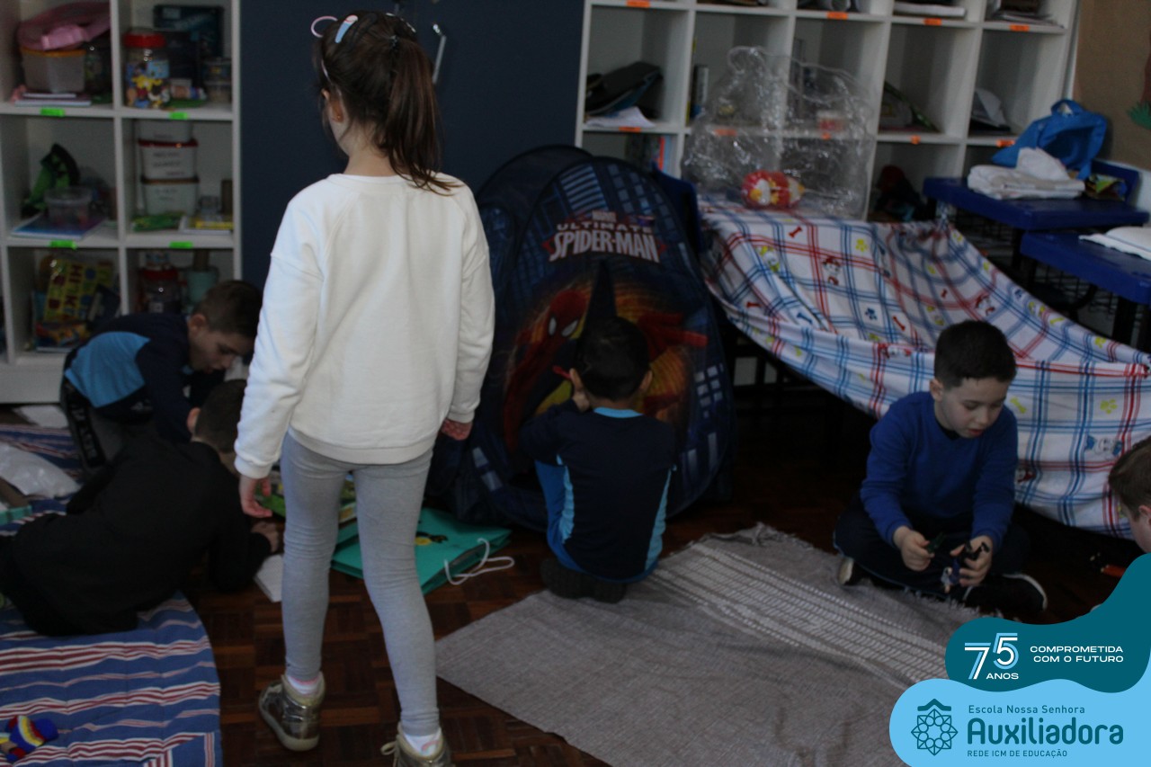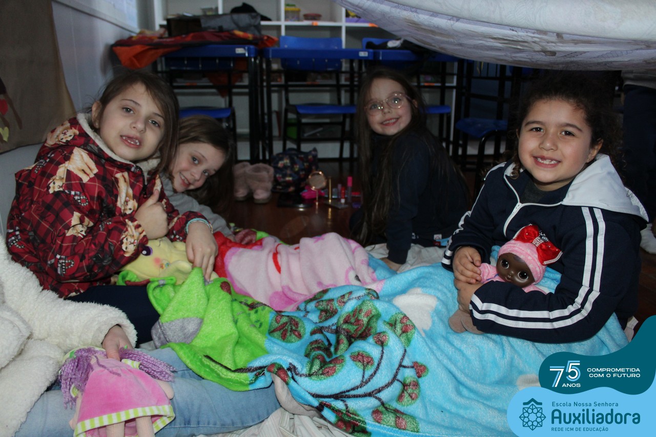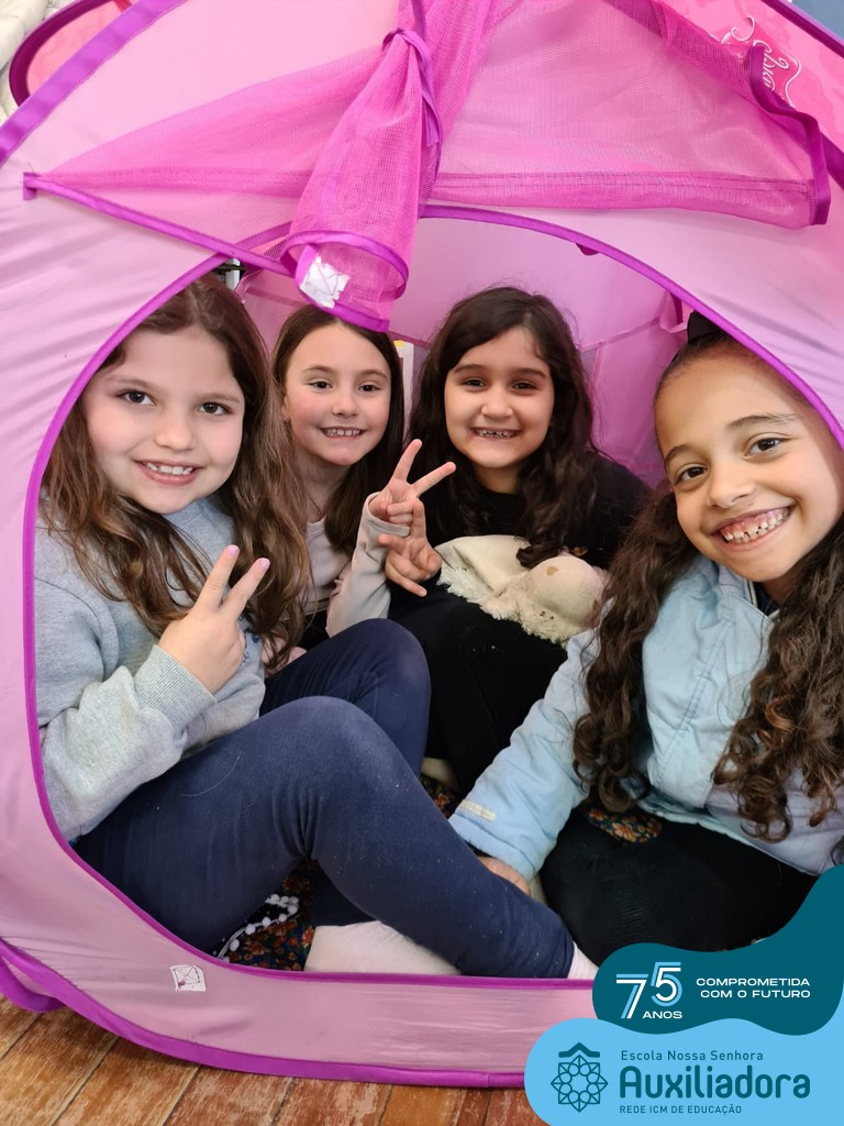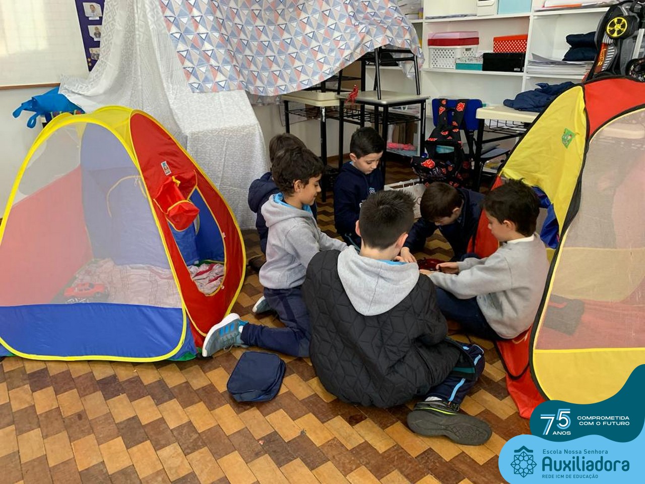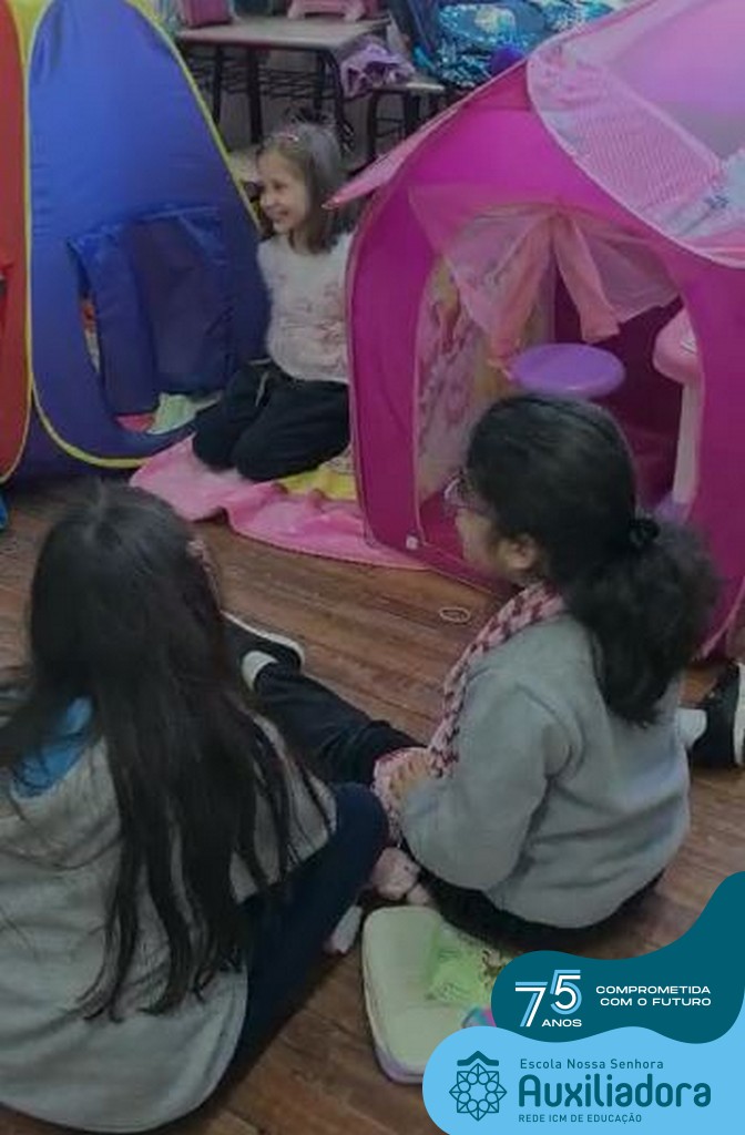 Também, de encerramento, as turmas de 1ºs e 2ºs anos tiveram um “ACAMPADENTRO TEMÁTICO”⛺️ na sala, em que as crianças trouxeram lençóis, tocas e brinquedos escolhidos em grupos para montarem cada espaço e desfrutarem da diversão com os amigos.