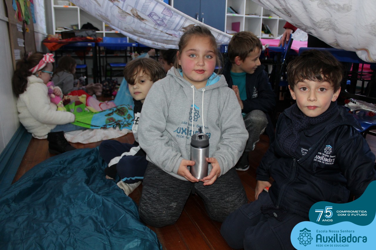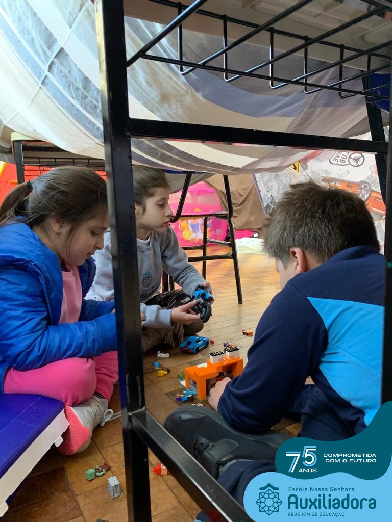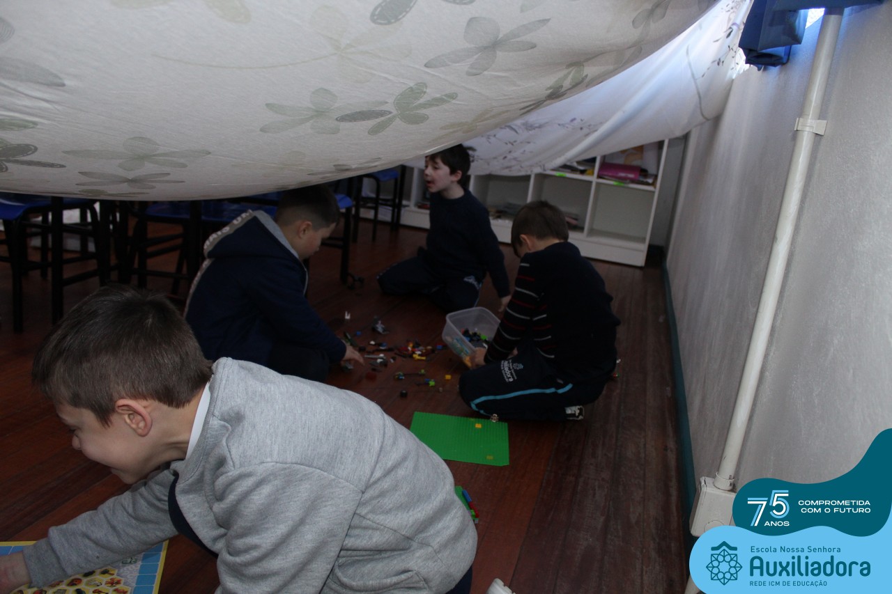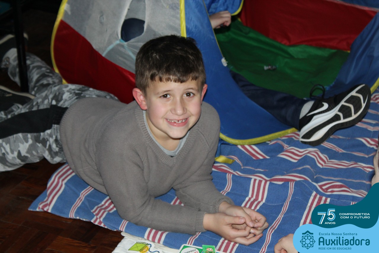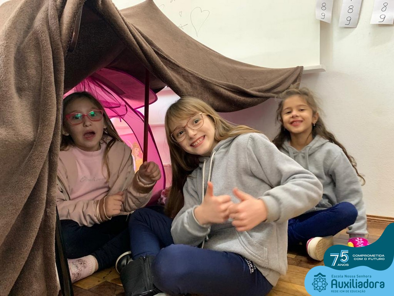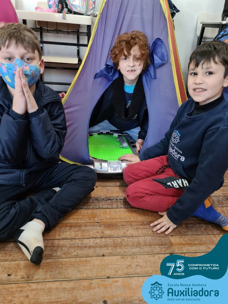 Também, de encerramento, as turmas de 1ºs e 2ºs anos tiveram um “ACAMPADENTRO TEMÁTICO”⛺️ na sala, em que as crianças trouxeram lençóis, tocas e brinquedos escolhidos em grupos para montarem cada espaço e desfrutarem da diversão com os amigos.