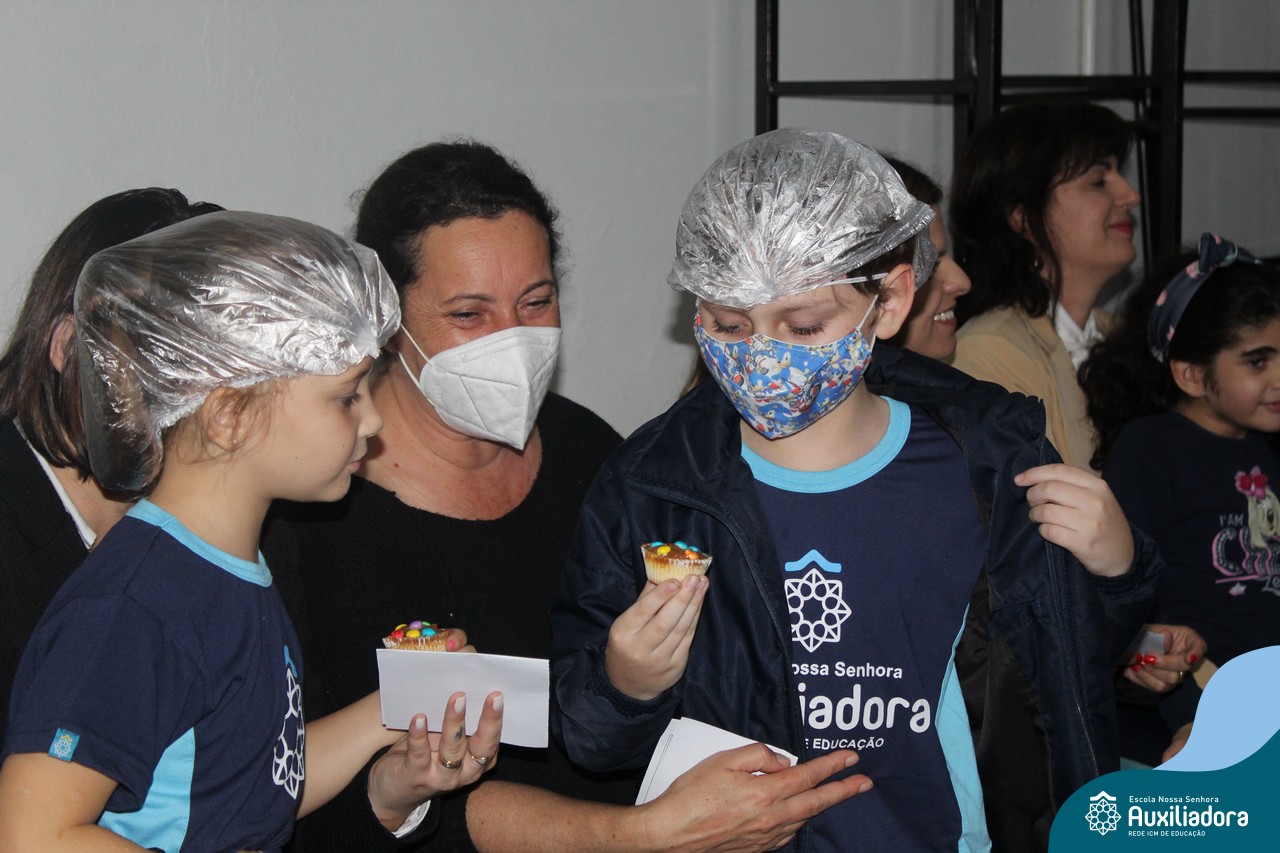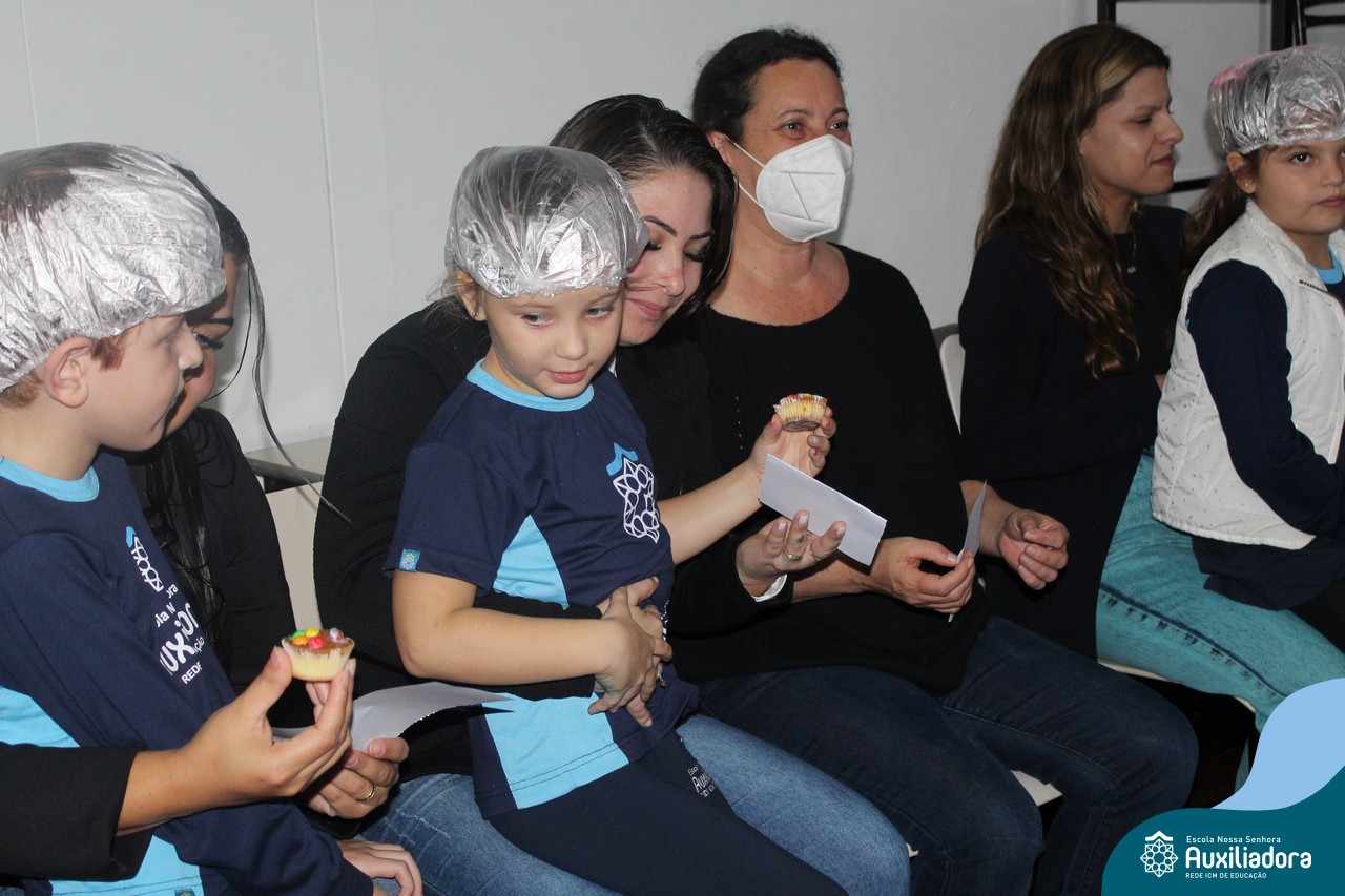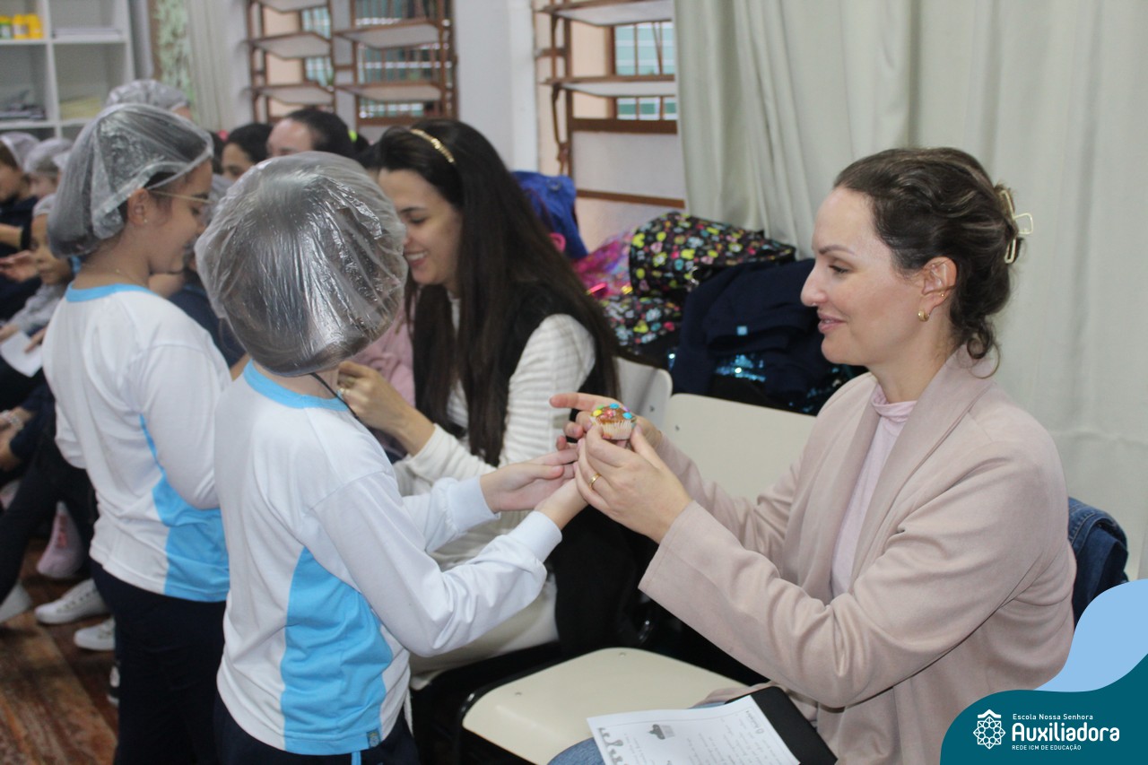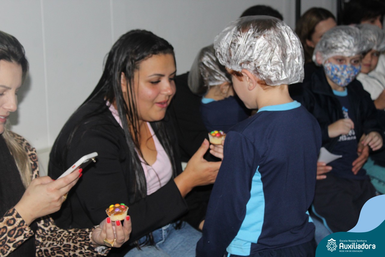 Cada criança presenteou sua mamãe com um cupcake, depois cantaram juntos a música “como é grande o meu amor”.
