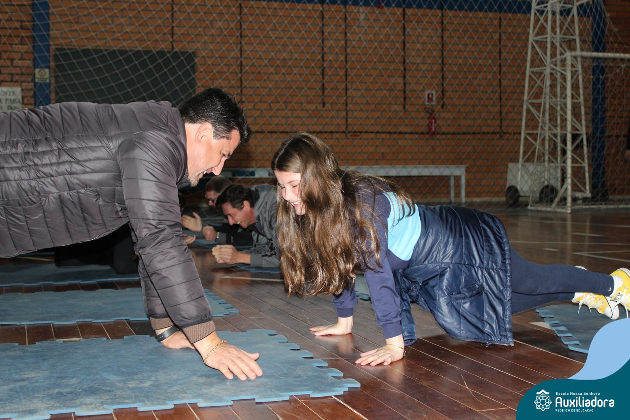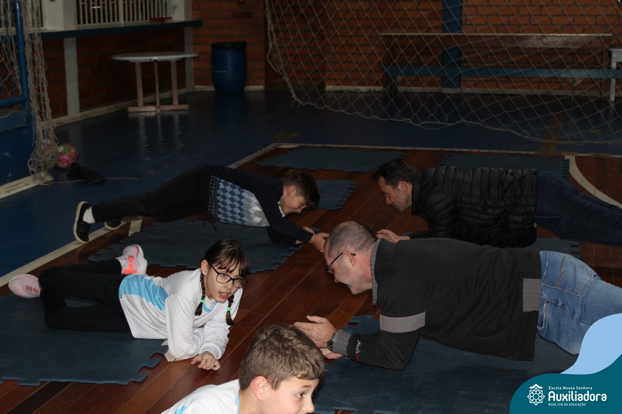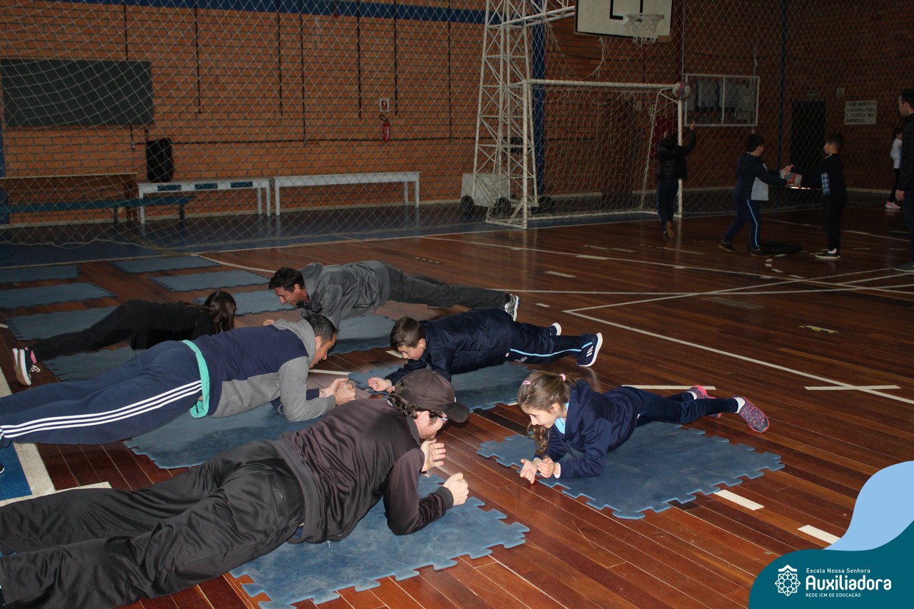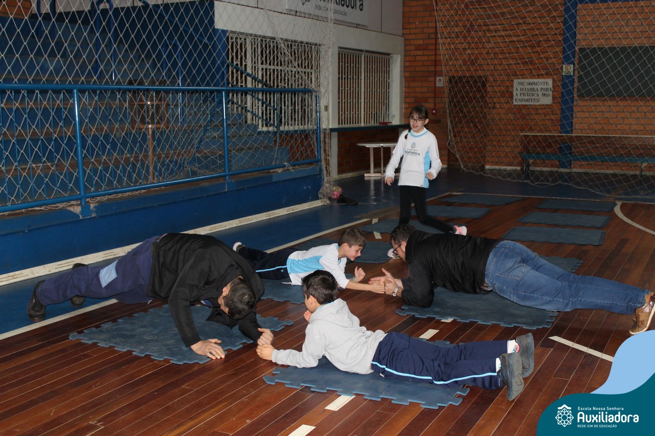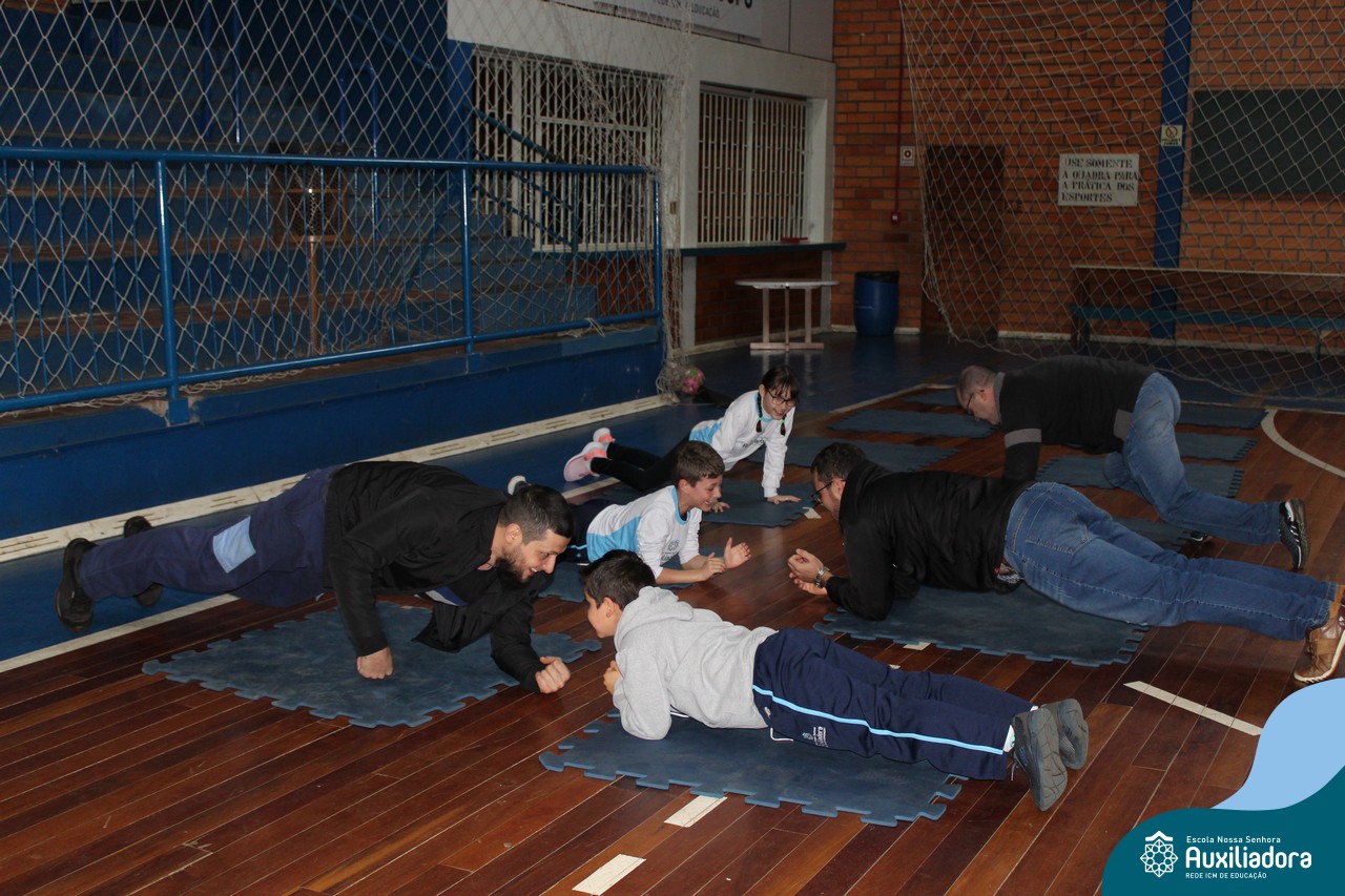 Os filhos fizeram uma oração pelos pais e depois todos participaram de um circuito de atividades físicas!