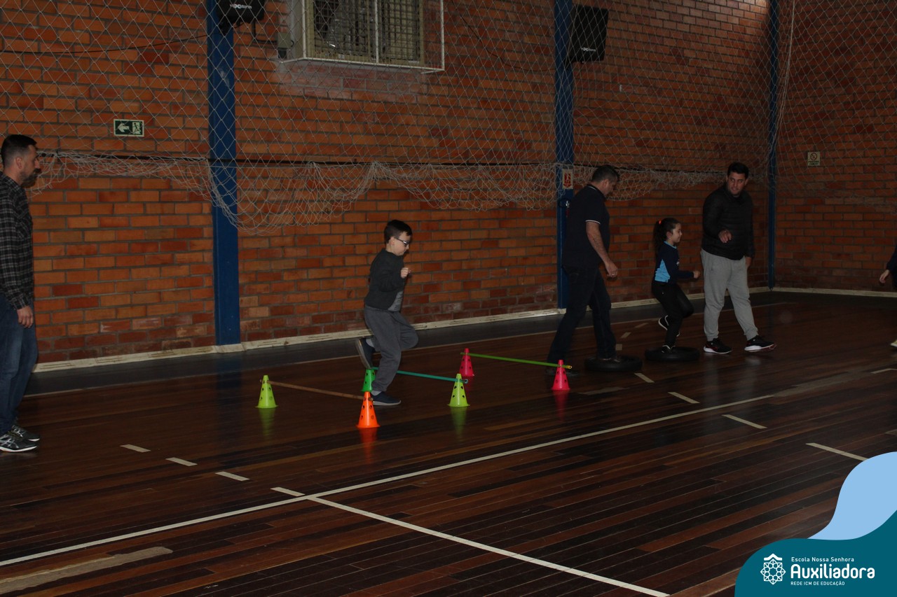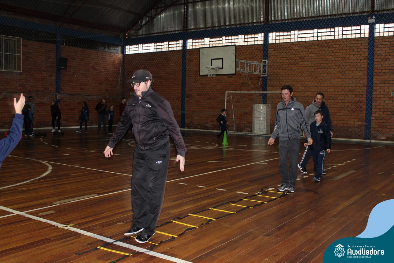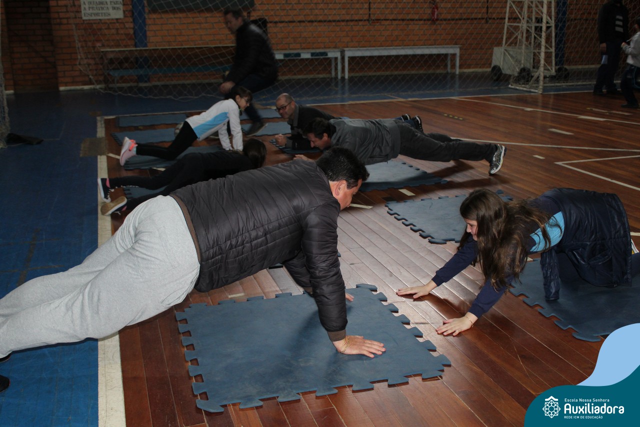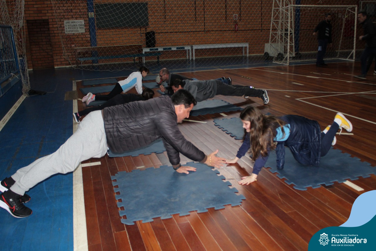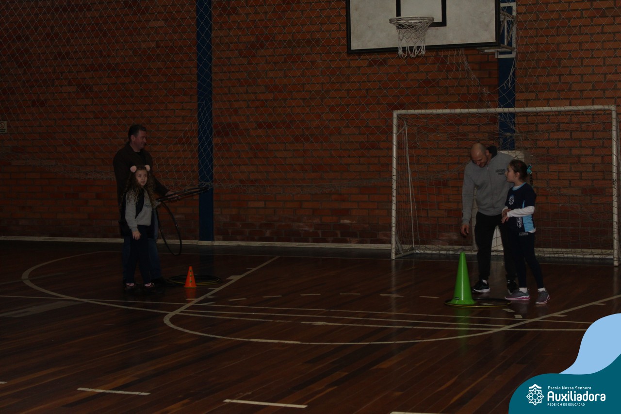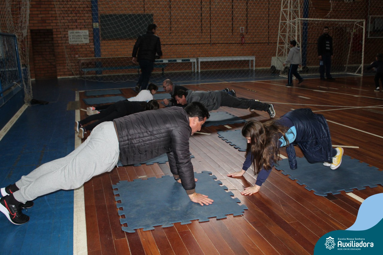 Os filhos fizeram uma oração pelos pais e depois todos participaram de um circuito de atividades físicas!