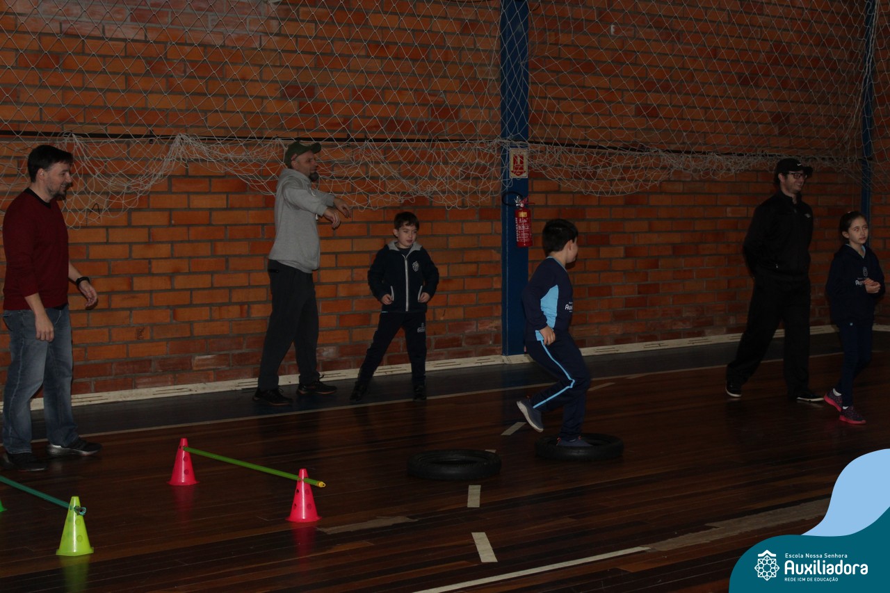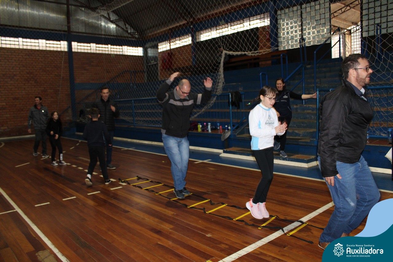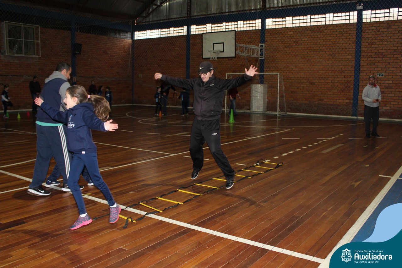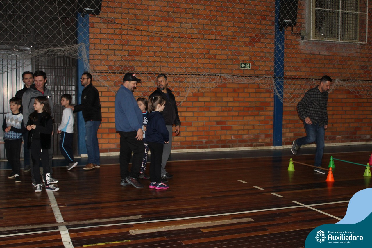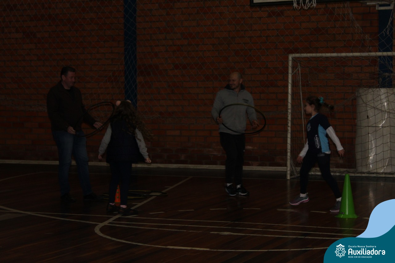 Os filhos fizeram uma oração pelos pais e depois todos participaram de um circuito de atividades físicas!