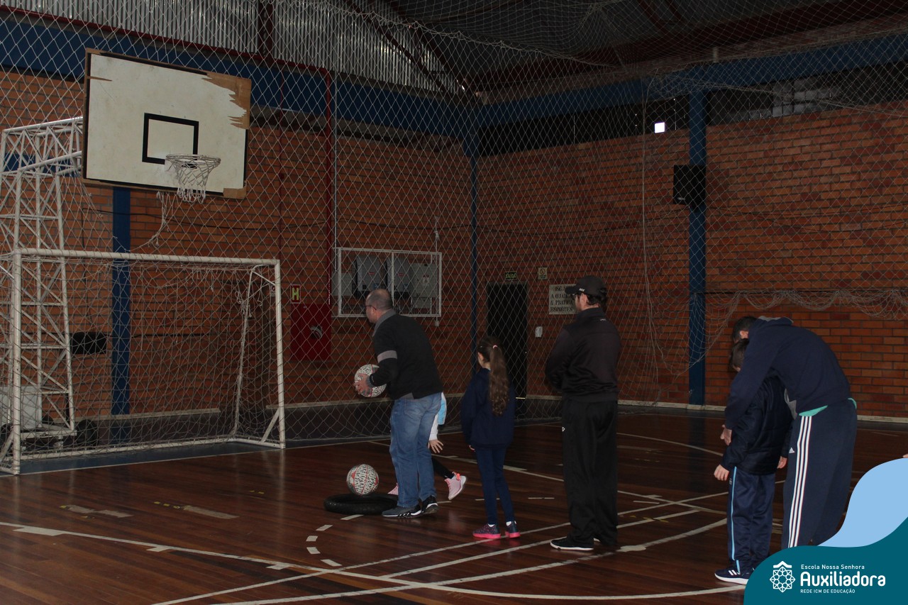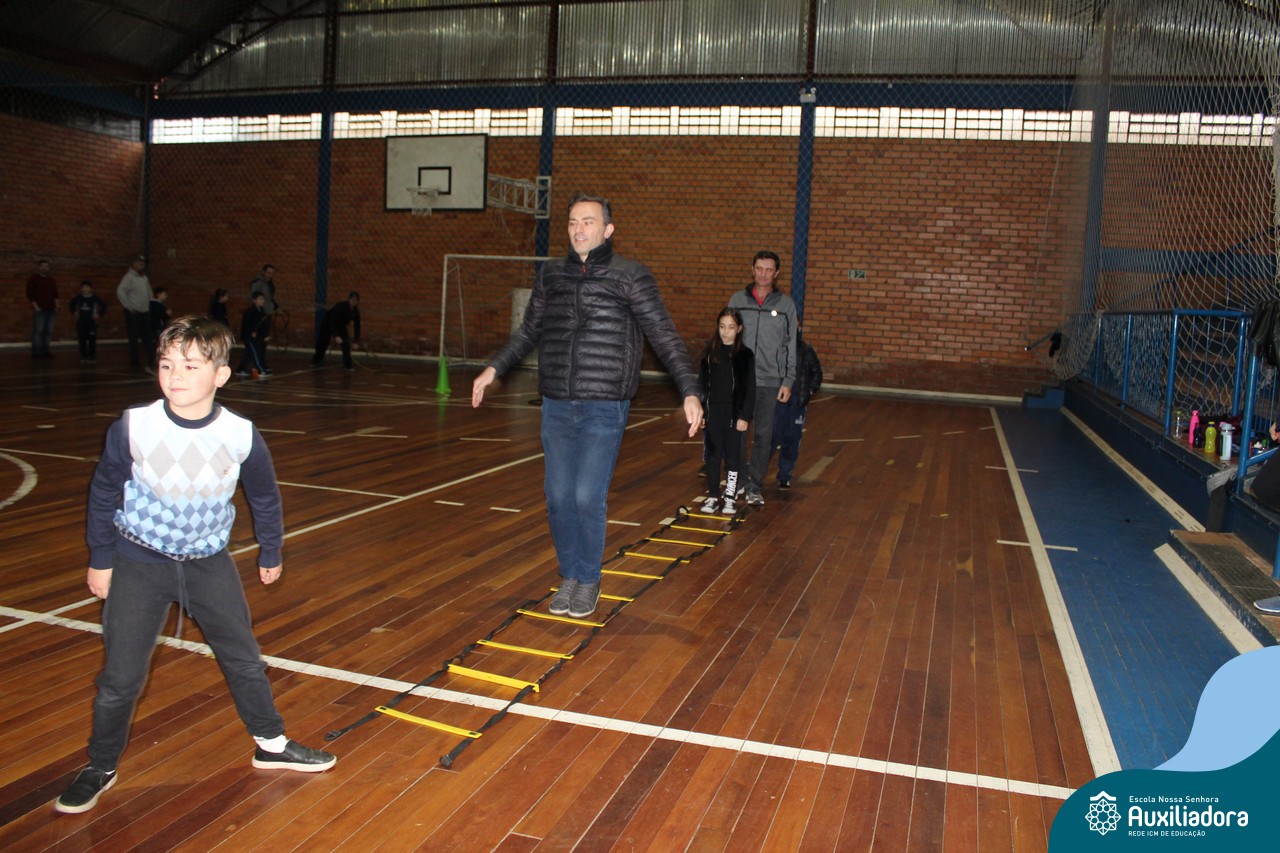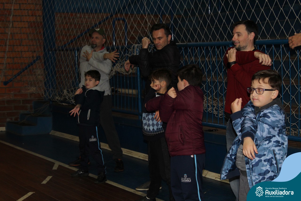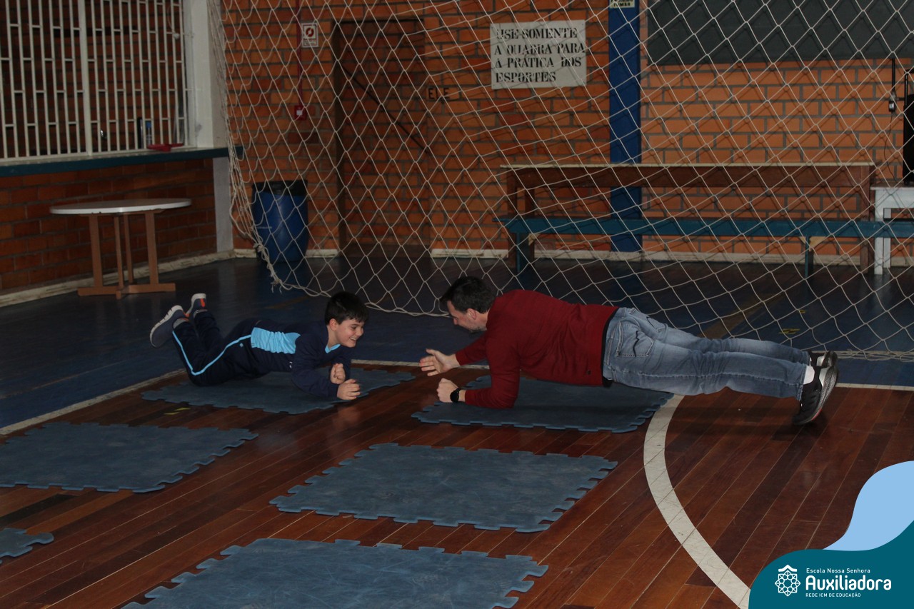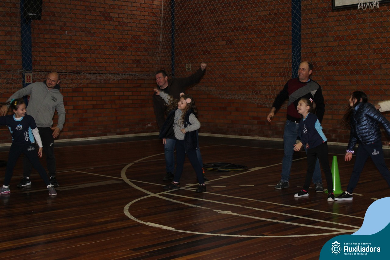 Os filhos fizeram uma oração pelos pais e depois todos participaram de um circuito de atividades físicas!