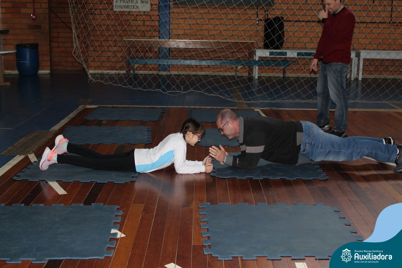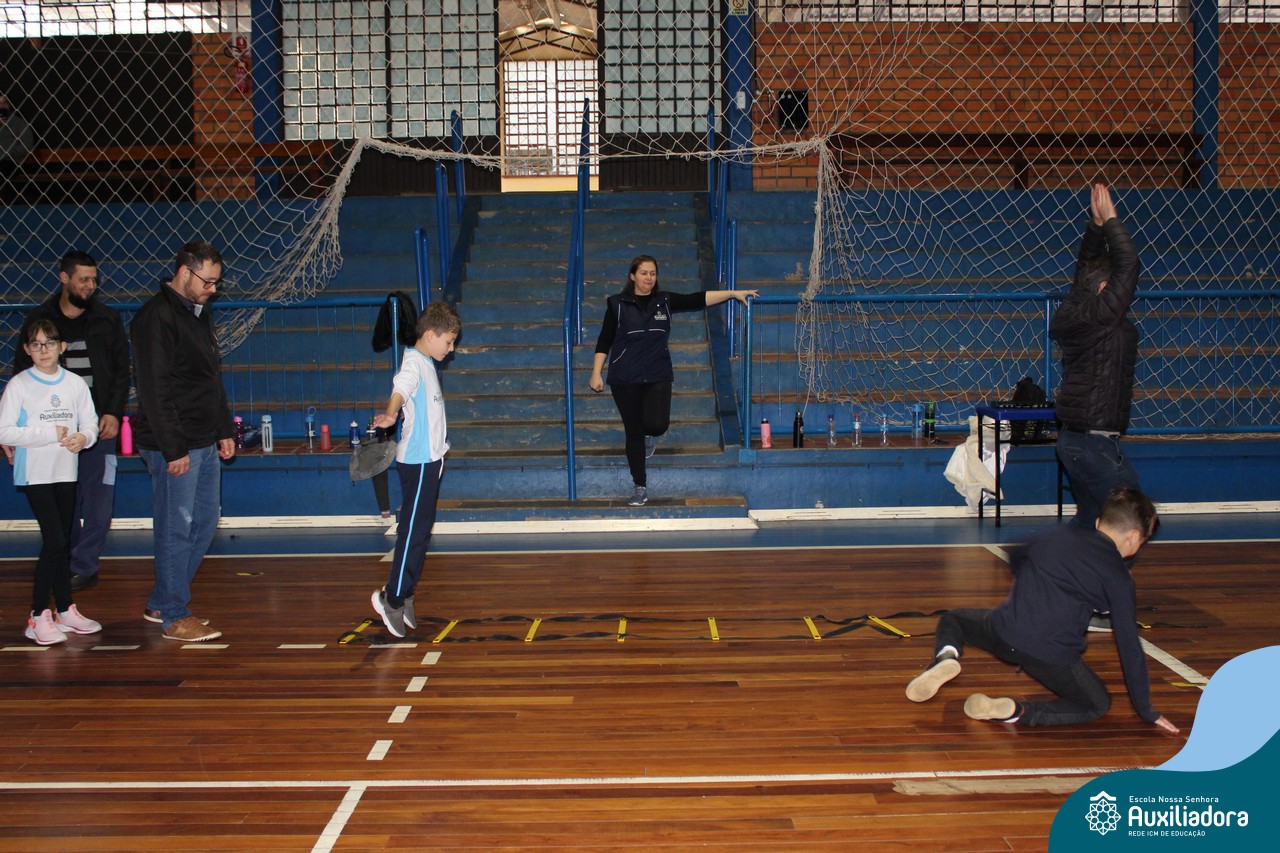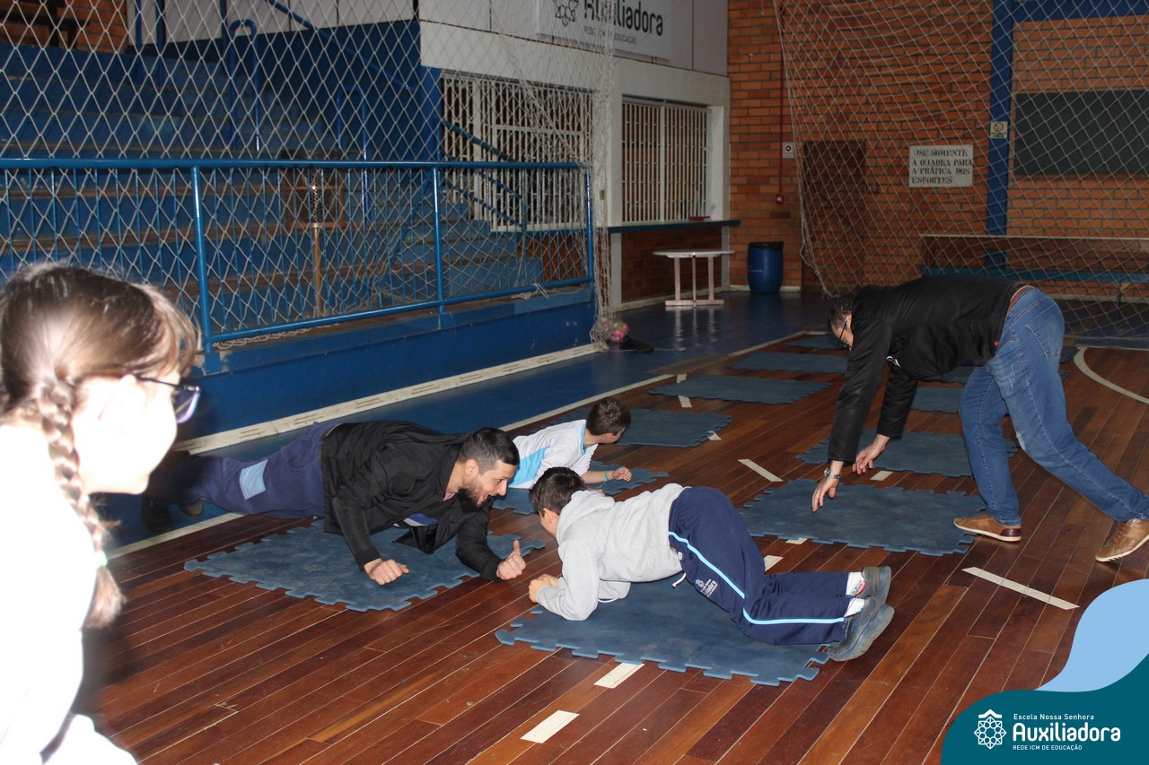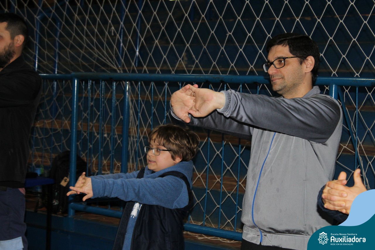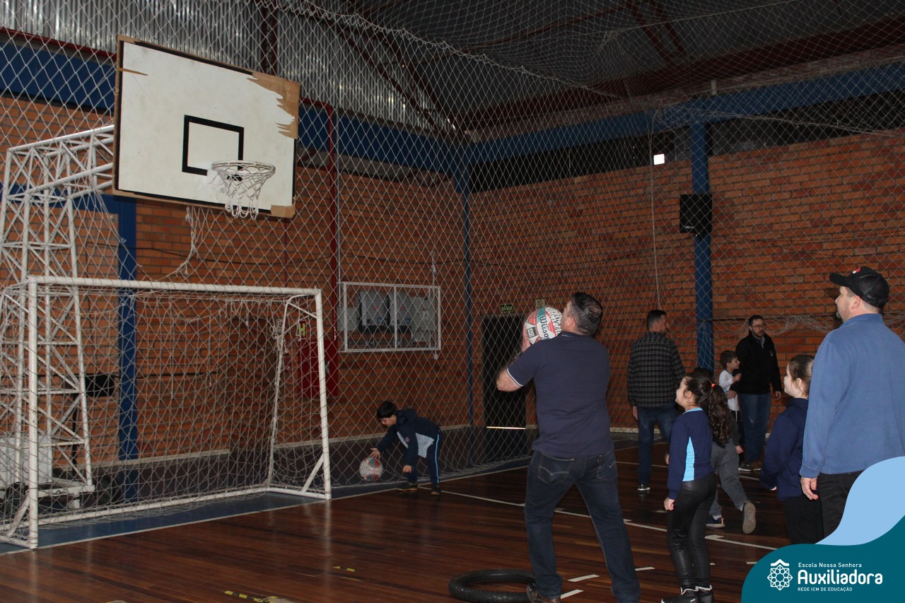Os filhos fizeram uma oração pelos pais e depois todos participaram de um circuito de atividades físicas!