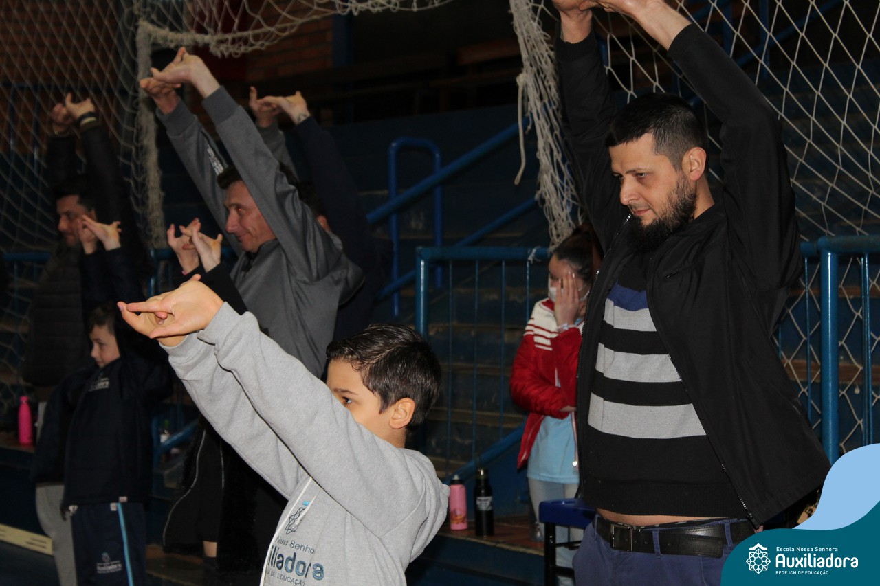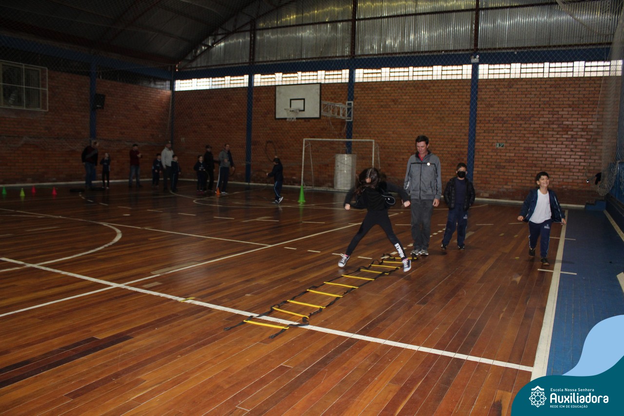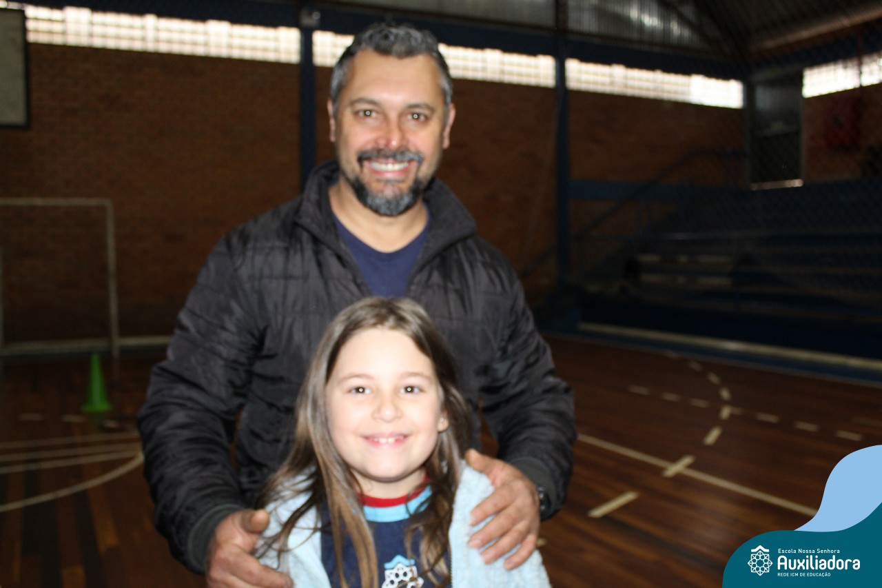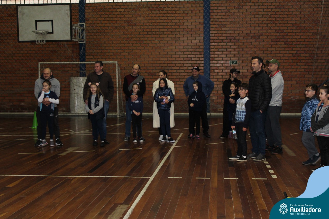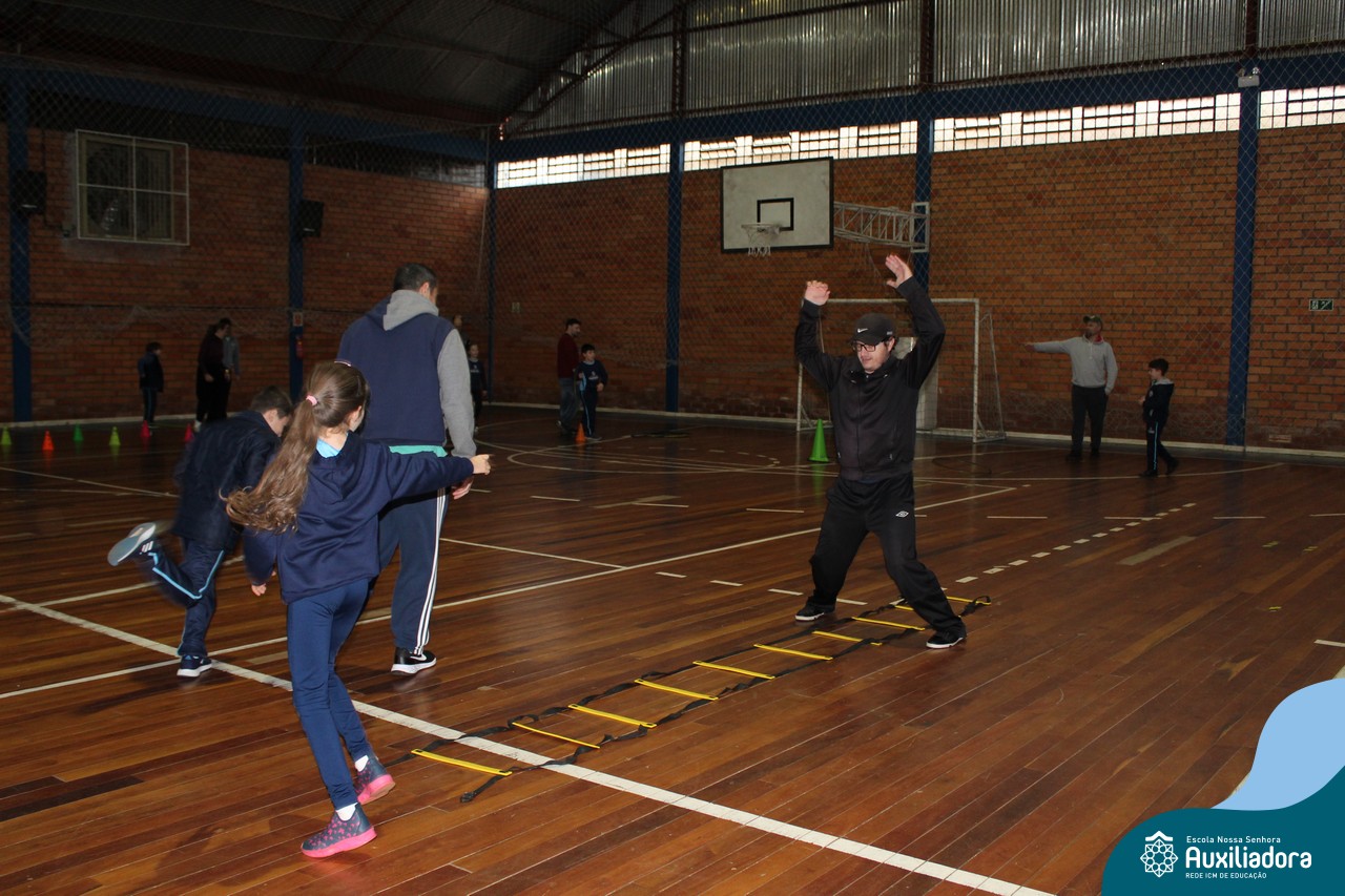 Os filhos fizeram uma oração pelos pais e depois todos participaram de um circuito de atividades físicas!