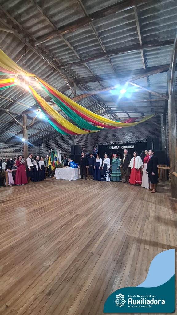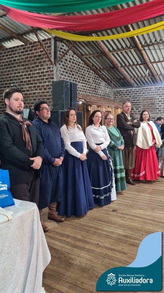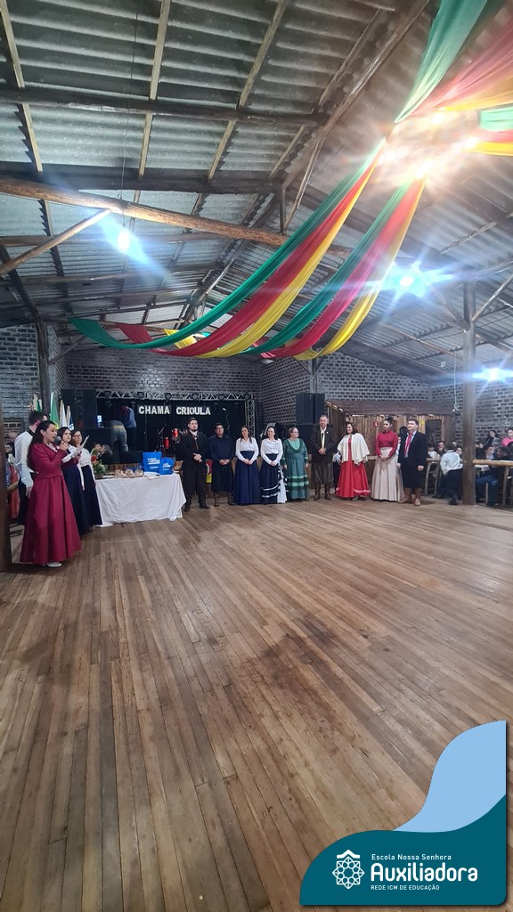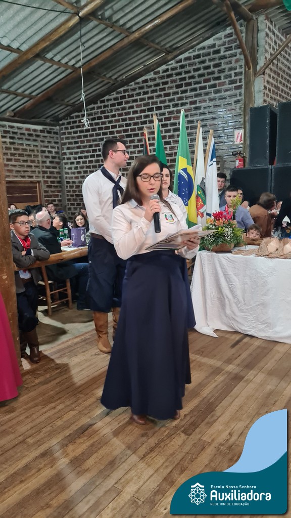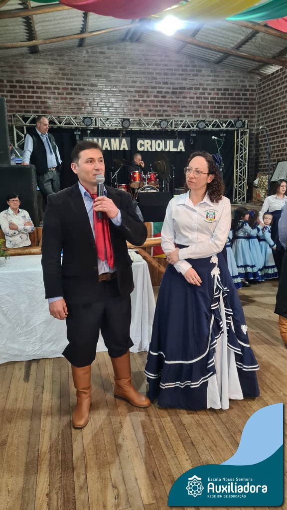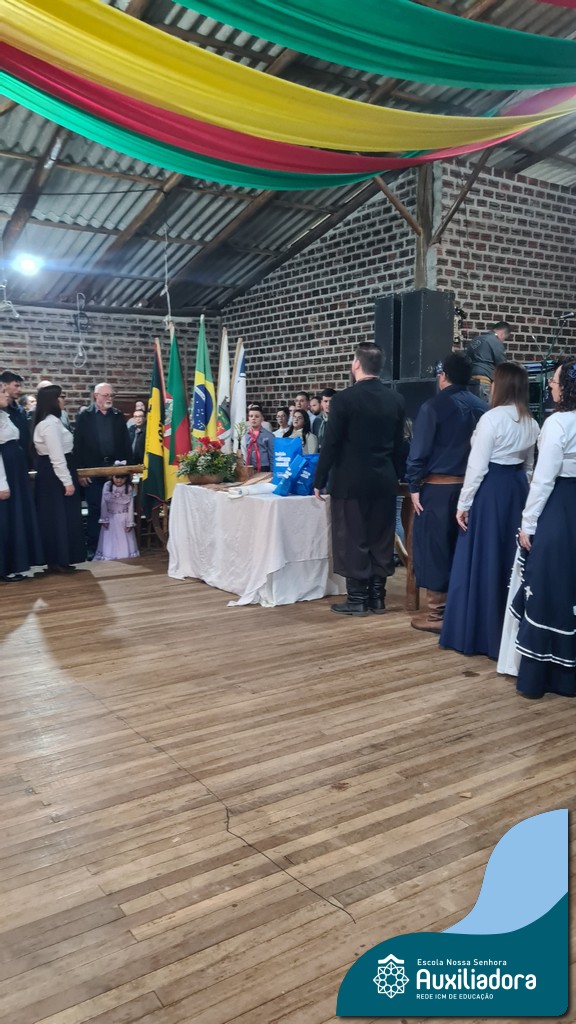 O Jantar Fandango do último 12 de julho, realizado no Piquete Alto Alegre, celebrou com emoção e orgulho a apresentação oficial do DTG Sentinela da Auxiliadora. O evento reuniu famílias, tradicionalistas e autoridades em uma noite de reencontro com as raízes. Marcaram presença o Patrão do Piquete, Silvio Cesar Rossatto; o Conselheiro do MTG, Luís Paulo Franken; a Coordenadora da 28ª RT, Mirtes Terezinha Quadros; e a diretora da Escola Nossa Senhora Auxiliadora, Luciane Bonfanti, além de professores, pais e representantes da comunidade escolar.