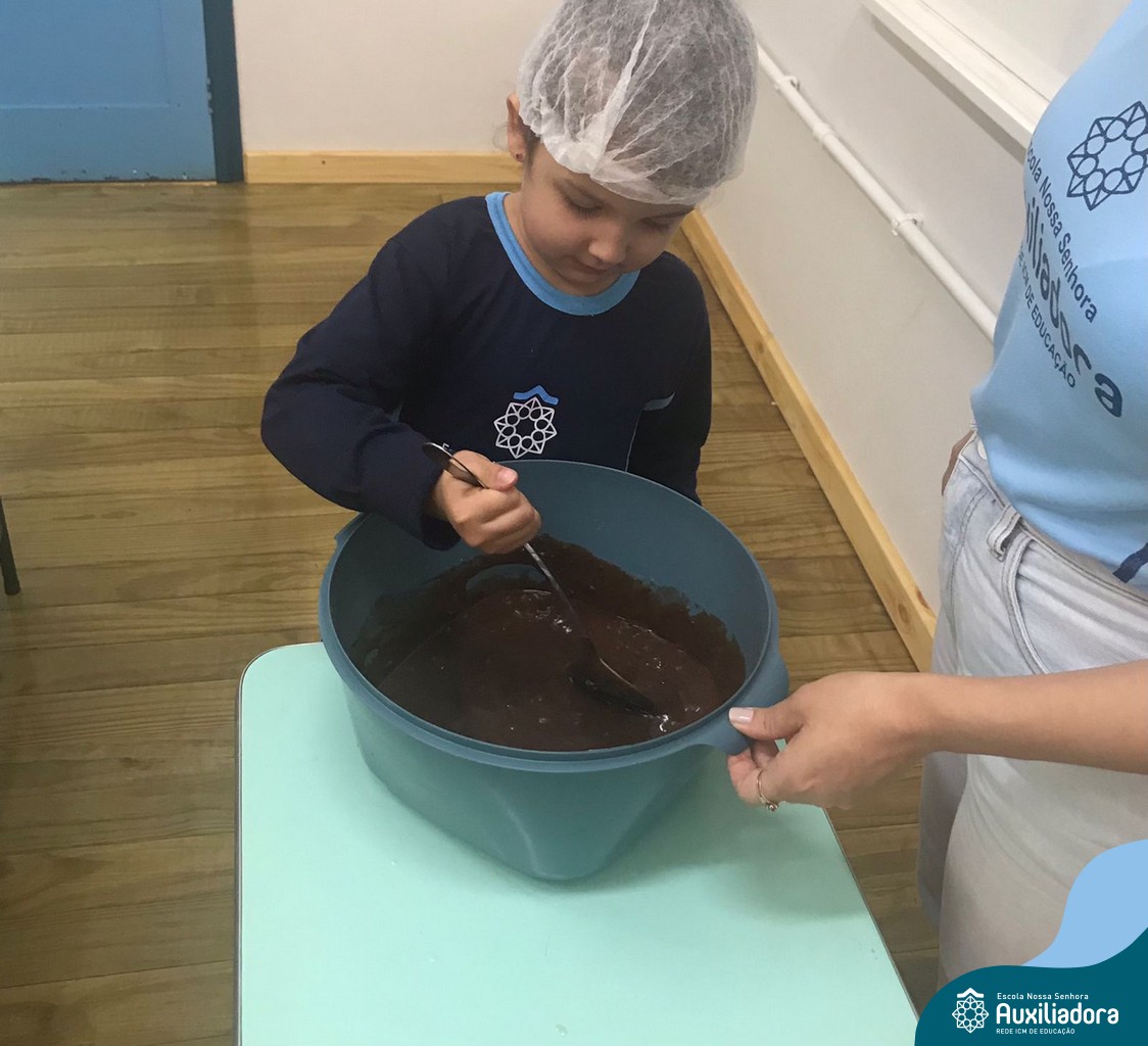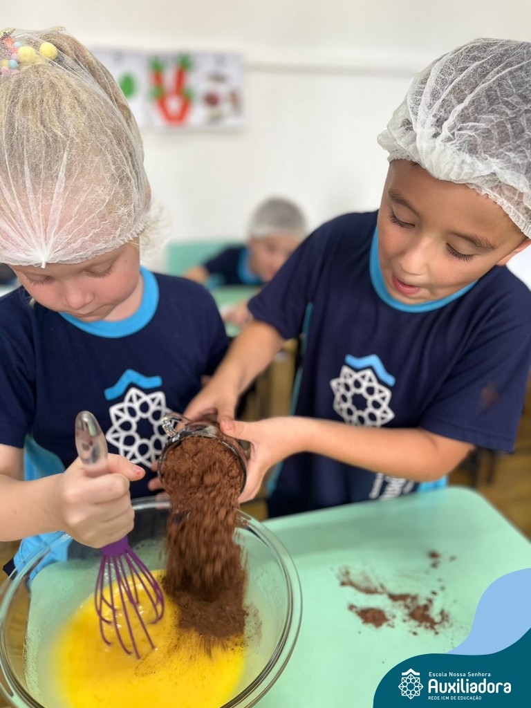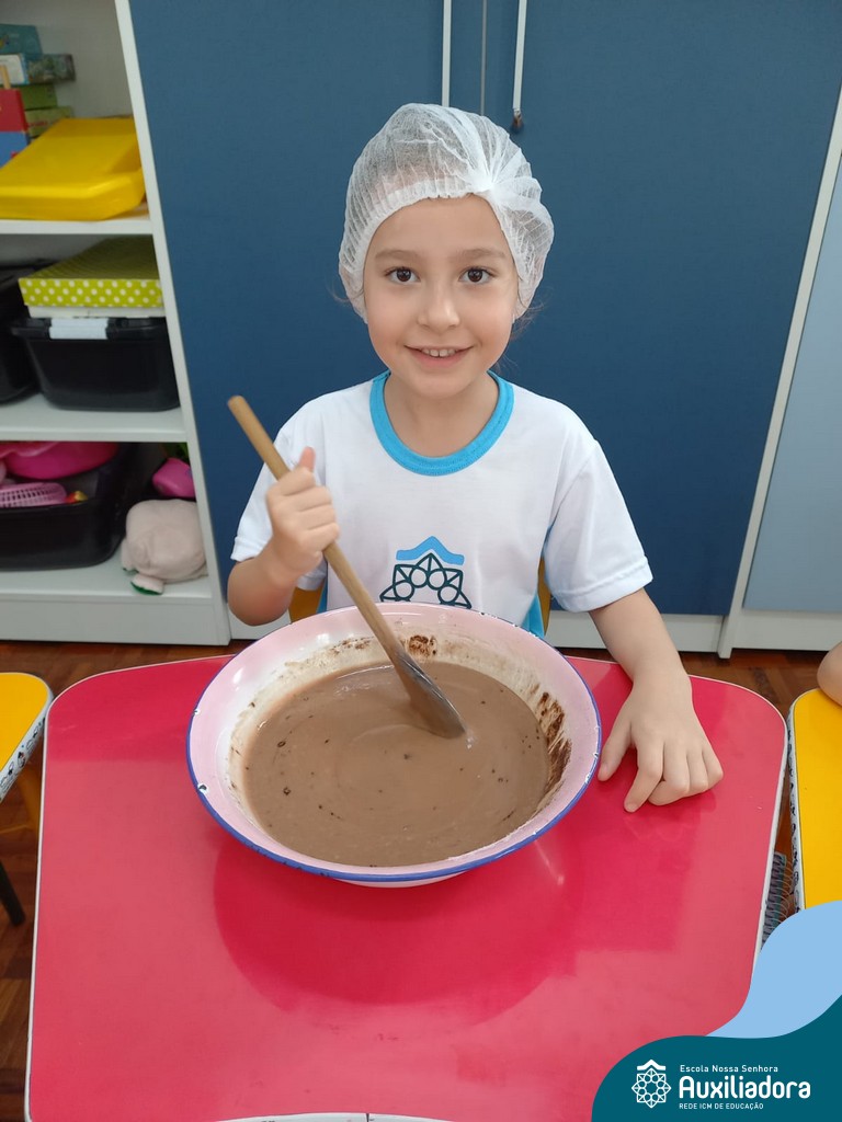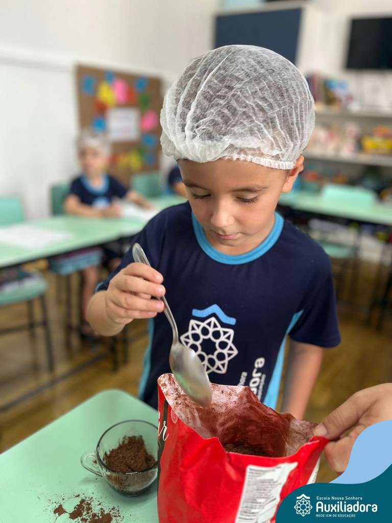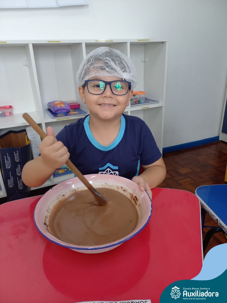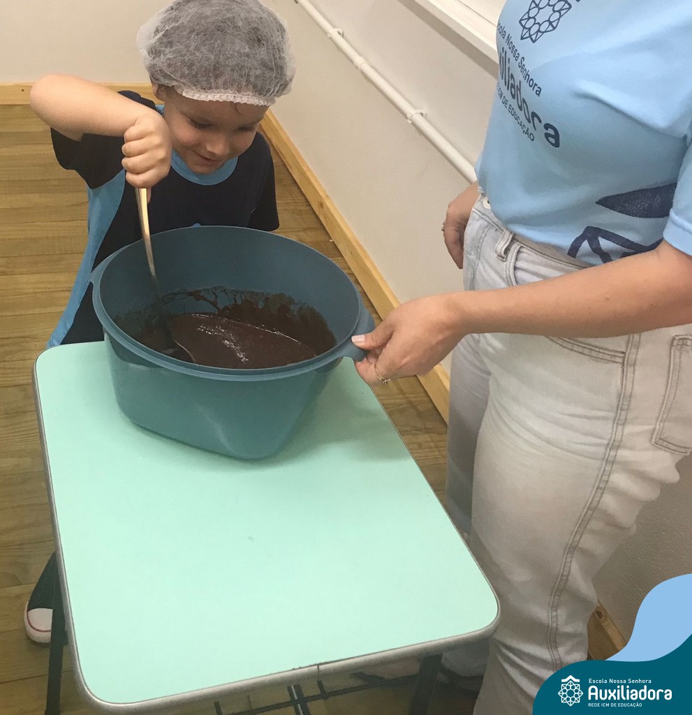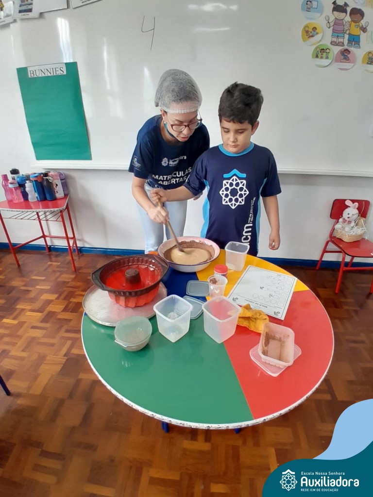 Em clima de Páscoa e confraternização, as crianças se envolveram em uma experiência de culinária muito significativa, fazendo um delicioso bolo de Cacau! Esta atividade não só ensina habilidades culinárias básicas, como também promove a criatividade e a colaboração. Realizaram a exploração sobre o Cacau, a separação e mistura dos ingredientes e, por fim o registro da receita em folha. Cada etapa foi uma oportunidade para aprender e se divertir juntos. Além disso, o resultado final foi um saboroso bolo, uma recompensa que todos puderam desfrutar em um lanche compartilhado, afinal Páscoa é partilha, amor e carinho uns com os outros.