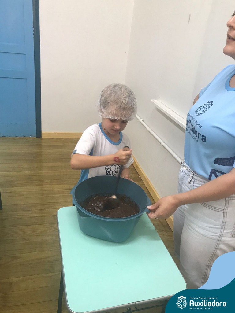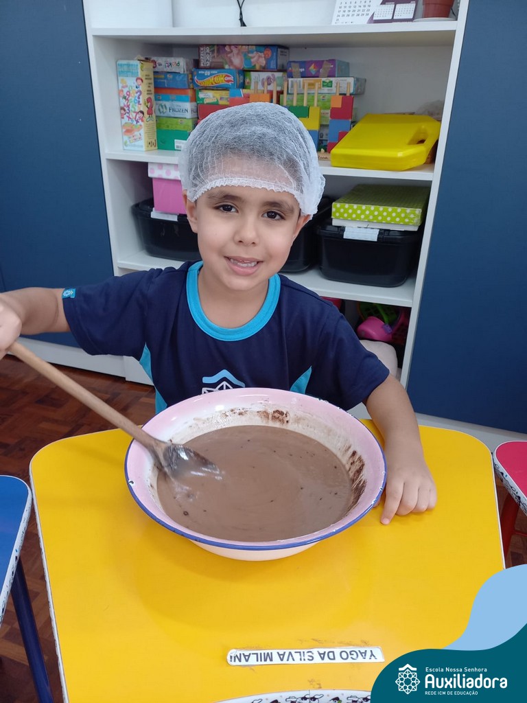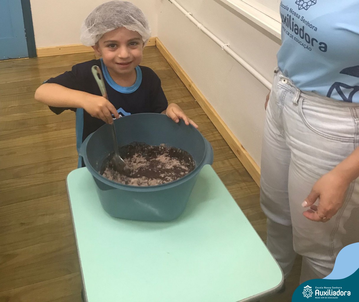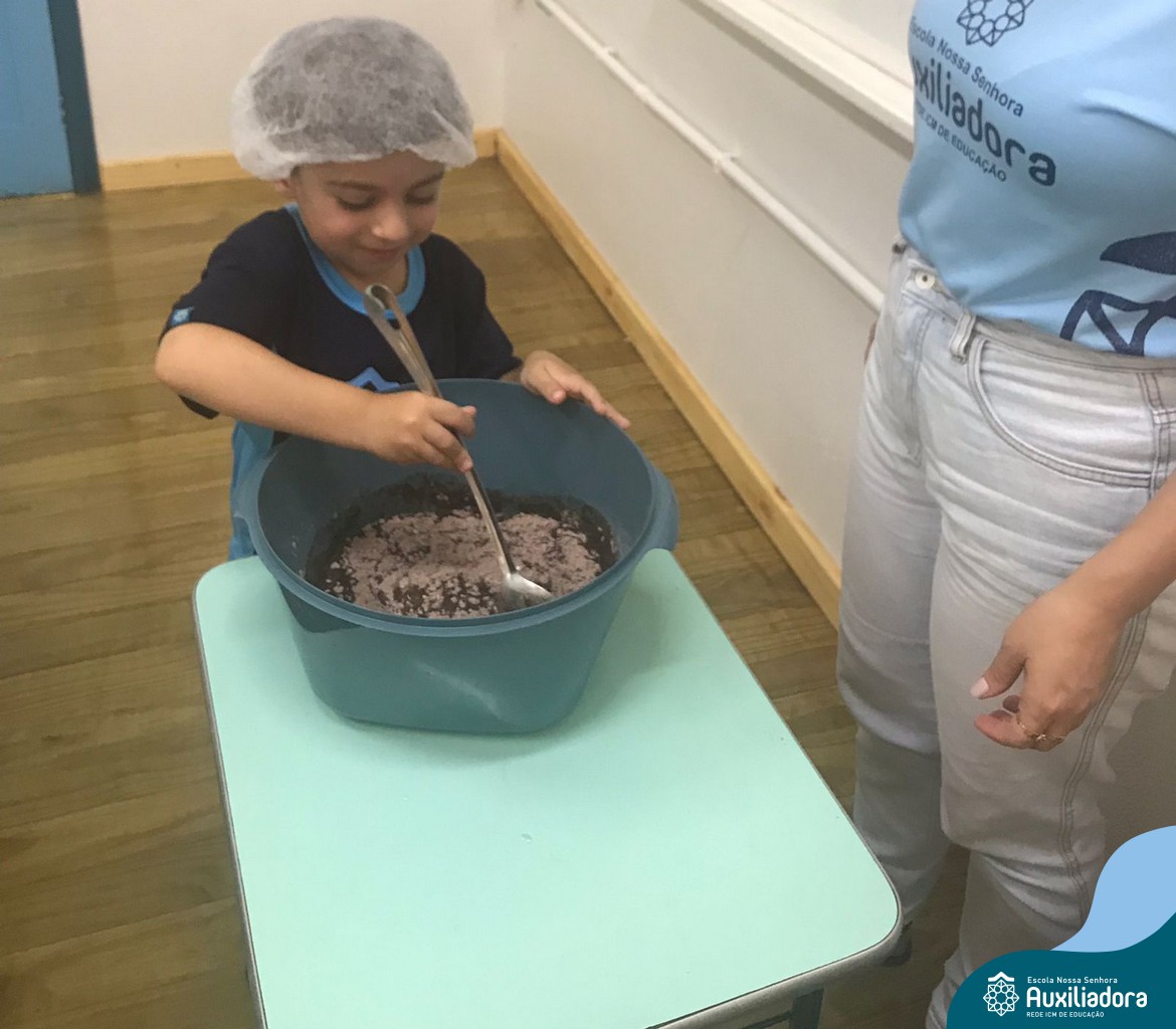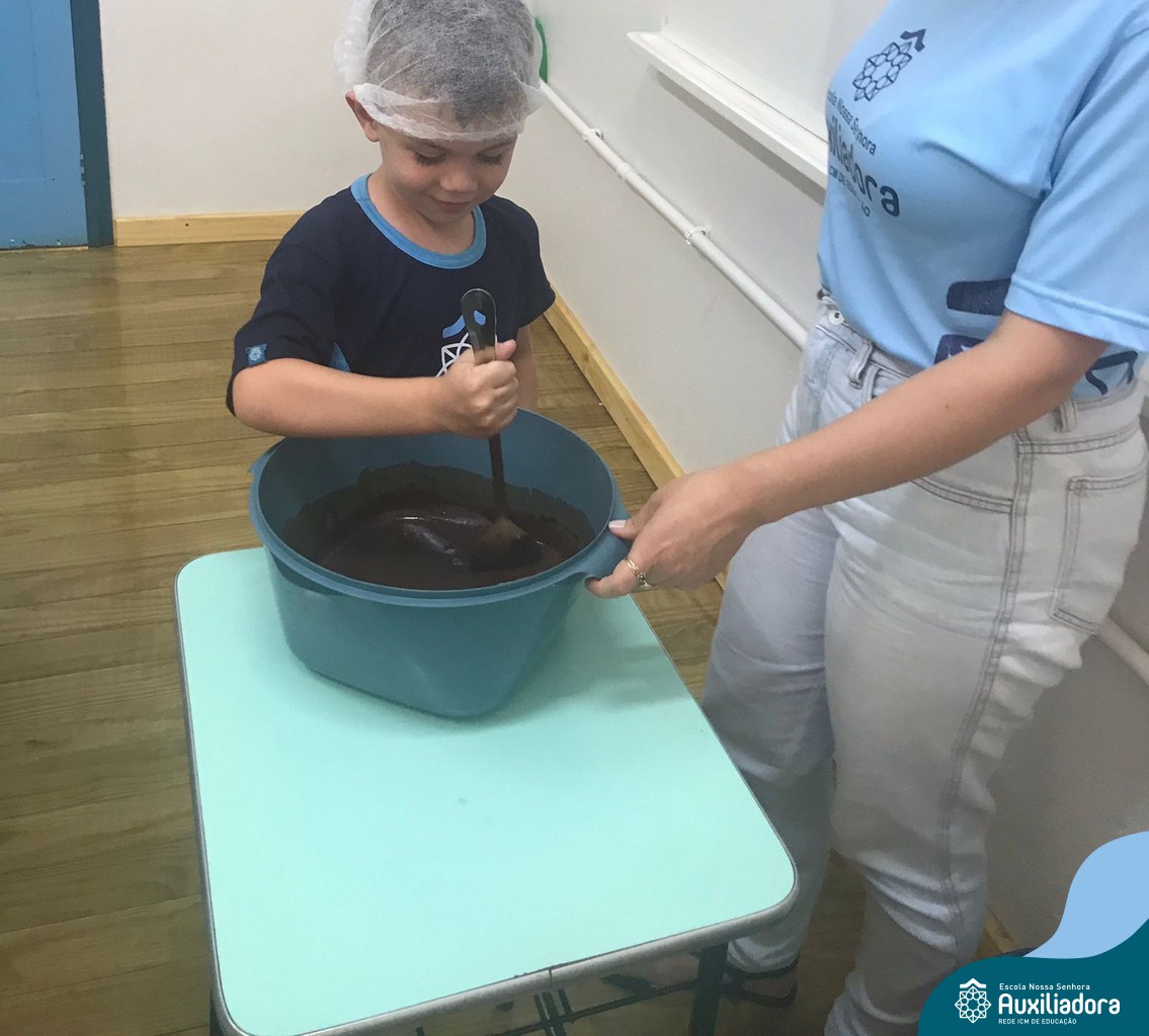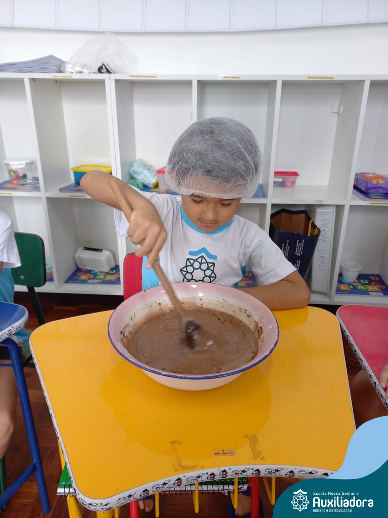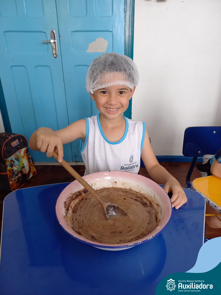 Em clima de Páscoa e confraternização, as crianças se envolveram em uma experiência de culinária muito significativa, fazendo um delicioso bolo de Cacau! Esta atividade não só ensina habilidades culinárias básicas, como também promove a criatividade e a colaboração. Realizaram a exploração sobre o Cacau, a separação e mistura dos ingredientes e, por fim o registro da receita em folha. Cada etapa foi uma oportunidade para aprender e se divertir juntos. Além disso, o resultado final foi um saboroso bolo, uma recompensa que todos puderam desfrutar em um lanche compartilhado, afinal Páscoa é partilha, amor e carinho uns com os outros.