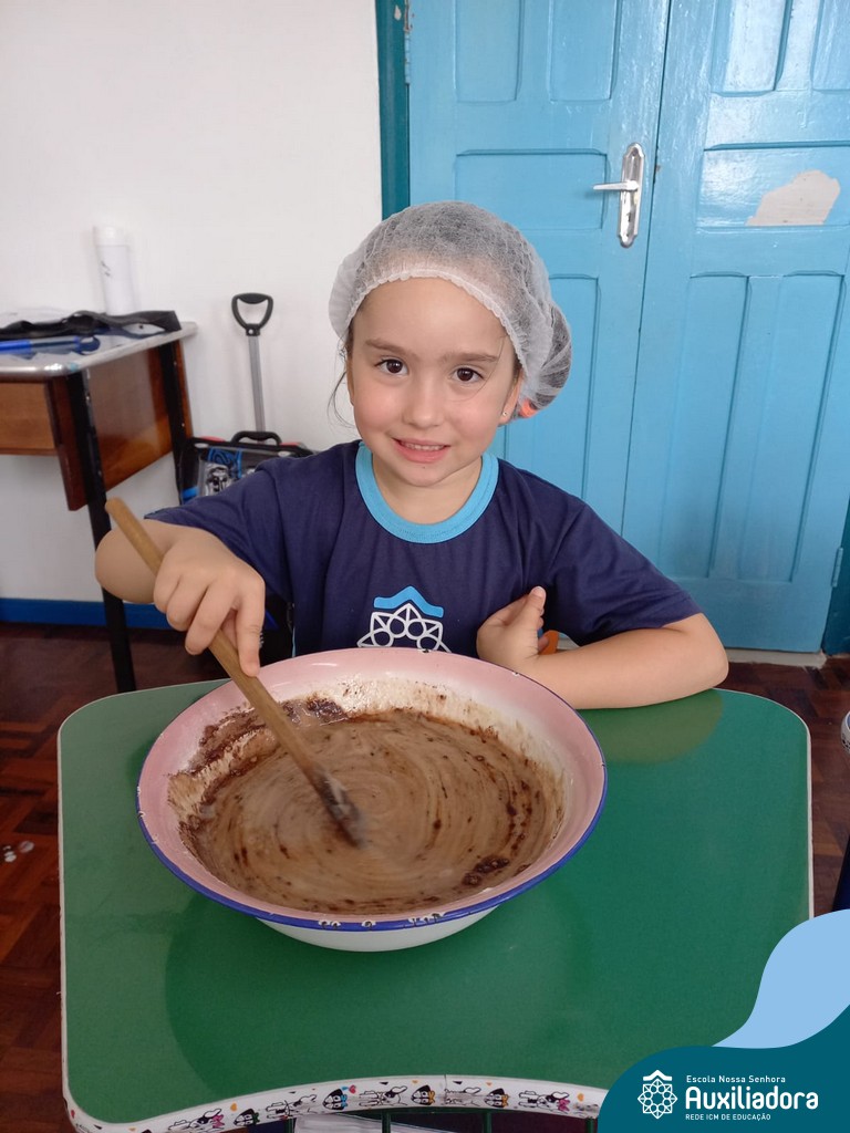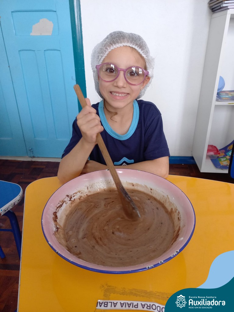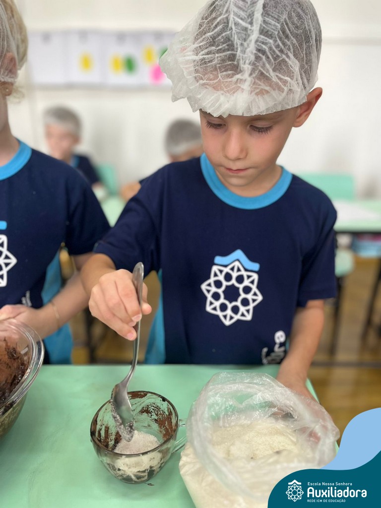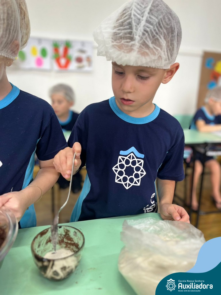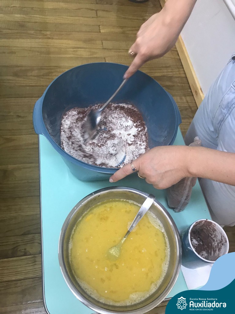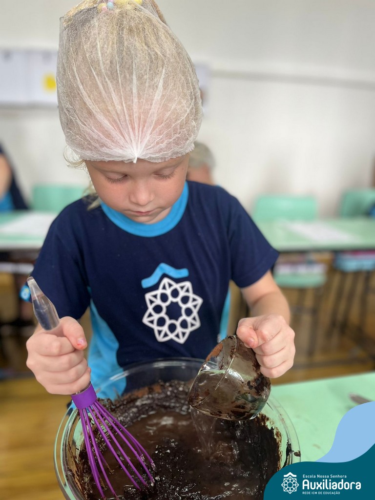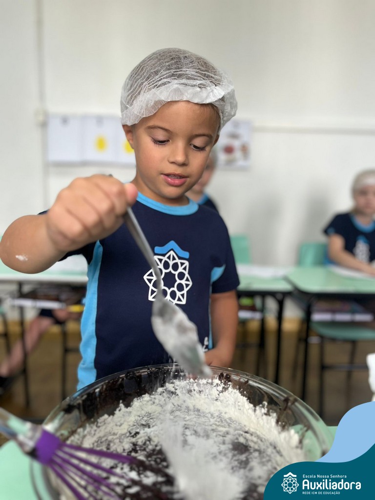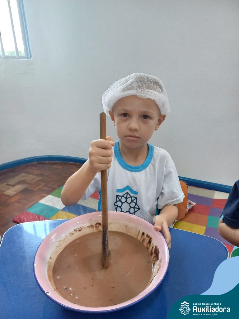 Em clima de Páscoa e confraternização, as crianças se envolveram em uma experiência de culinária muito significativa, fazendo um delicioso bolo de Cacau! Esta atividade não só ensina habilidades culinárias básicas, como também promove a criatividade e a colaboração. Realizaram a exploração sobre o Cacau, a separação e mistura dos ingredientes e, por fim o registro da receita em folha. Cada etapa foi uma oportunidade para aprender e se divertir juntos. Além disso, o resultado final foi um saboroso bolo, uma recompensa que todos puderam desfrutar em um lanche compartilhado, afinal Páscoa é partilha, amor e carinho uns com os outros.
