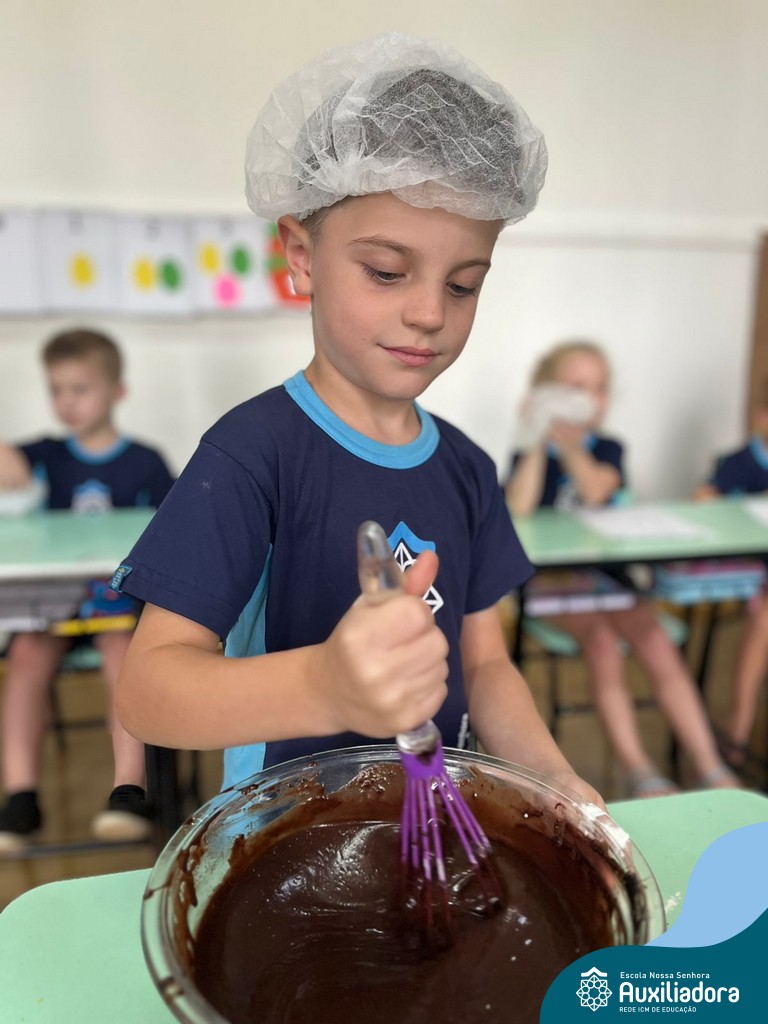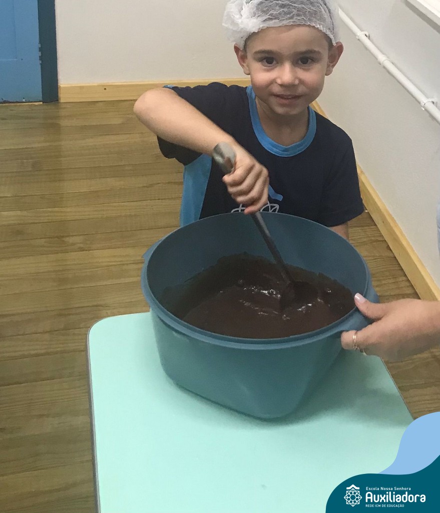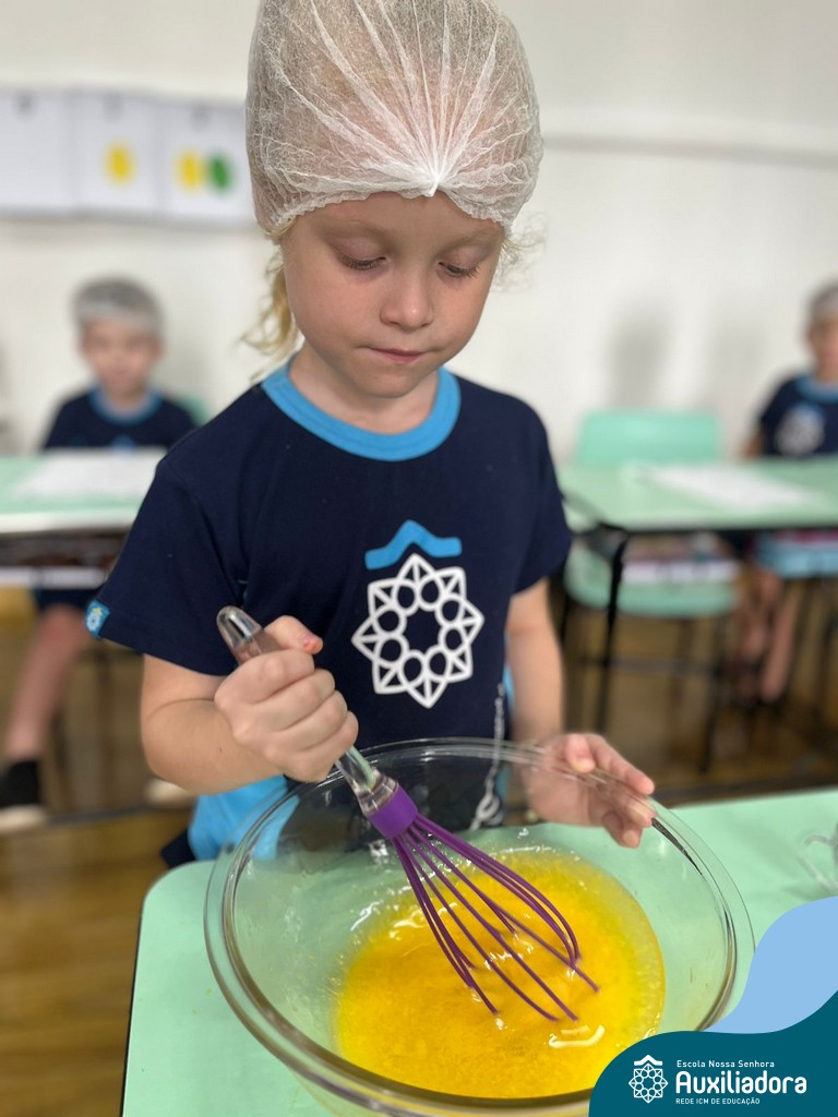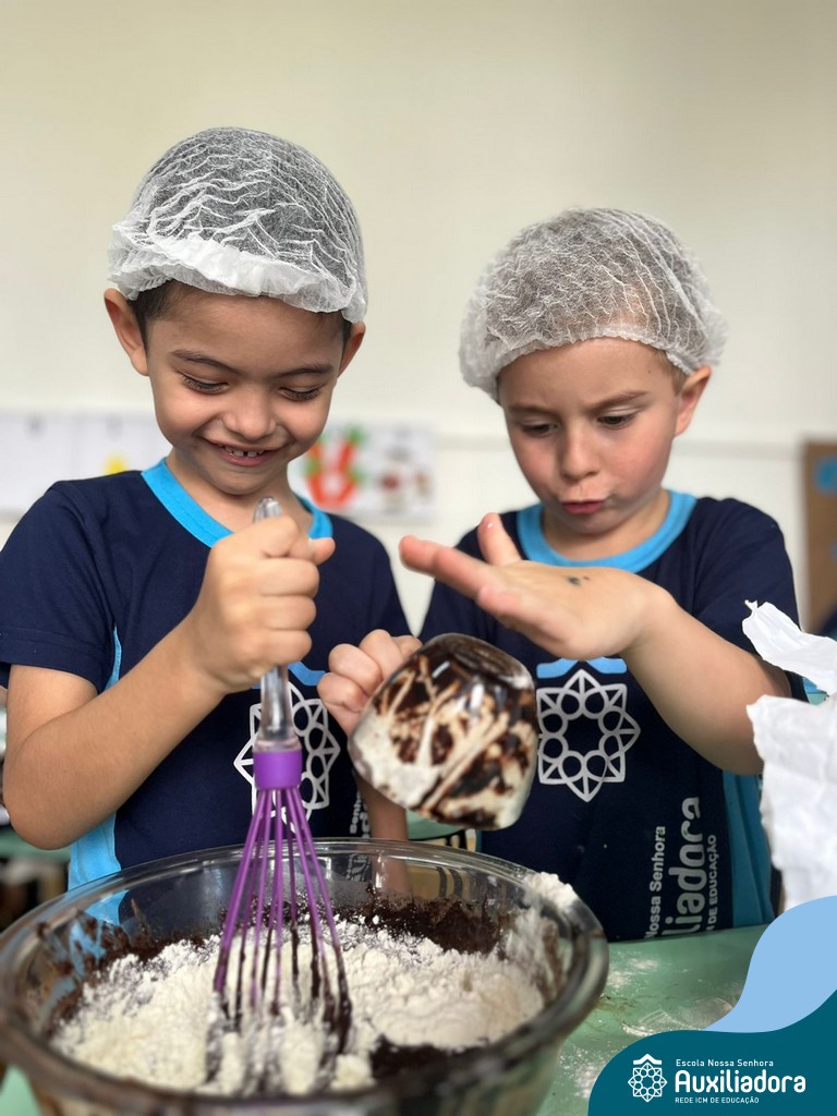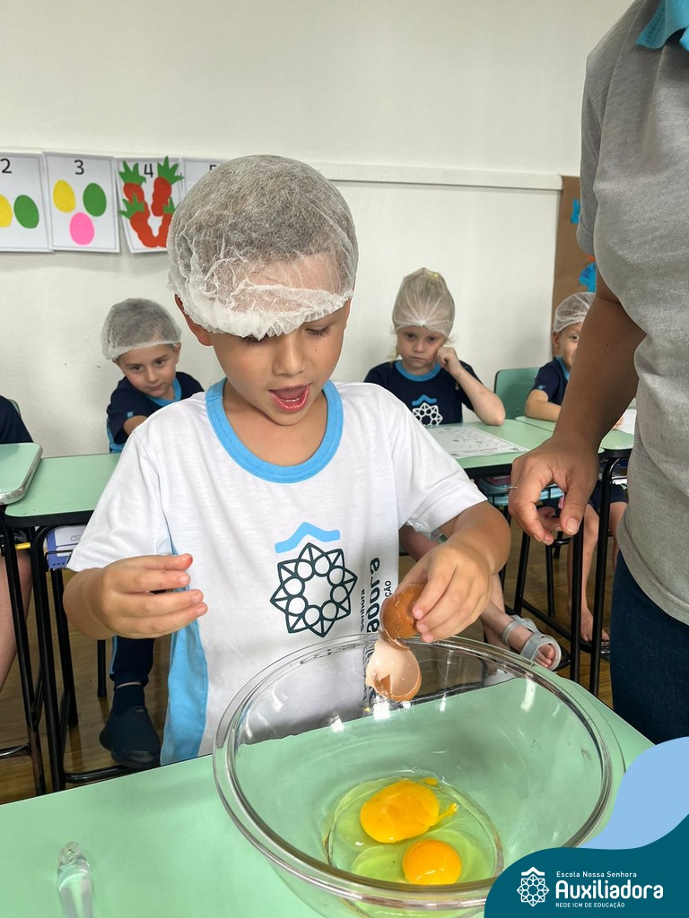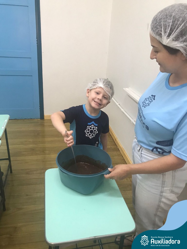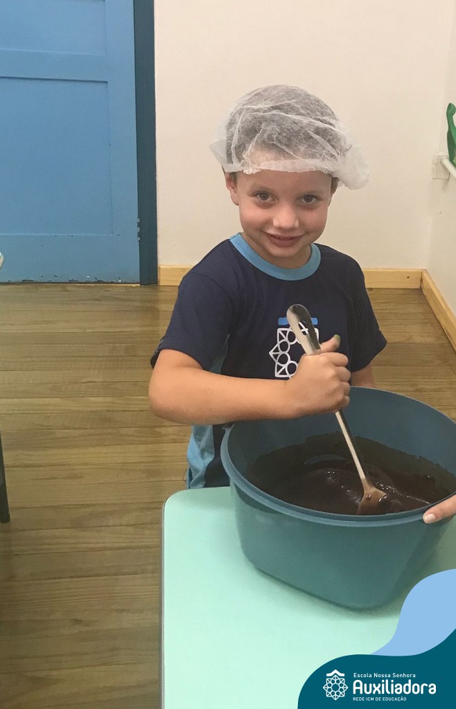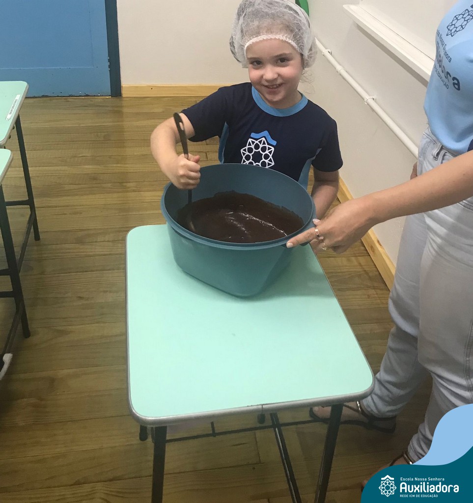 Em clima de Páscoa e confraternização, as crianças se envolveram em uma experiência de culinária muito significativa, fazendo um delicioso bolo de Cacau! Esta atividade não só ensina habilidades culinárias básicas, como também promove a criatividade e a colaboração. Realizaram a exploração sobre o Cacau, a separação e mistura dos ingredientes e, por fim o registro da receita em folha. Cada etapa foi uma oportunidade para aprender e se divertir juntos. Além disso, o resultado final foi um saboroso bolo, uma recompensa que todos puderam desfrutar em um lanche compartilhado, afinal Páscoa é partilha, amor e carinho uns com os outros.