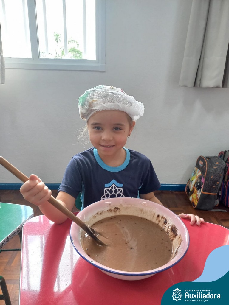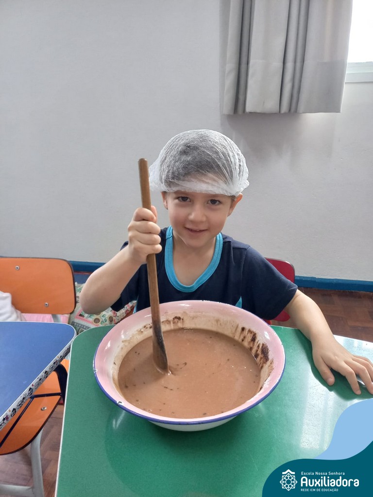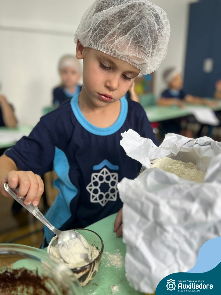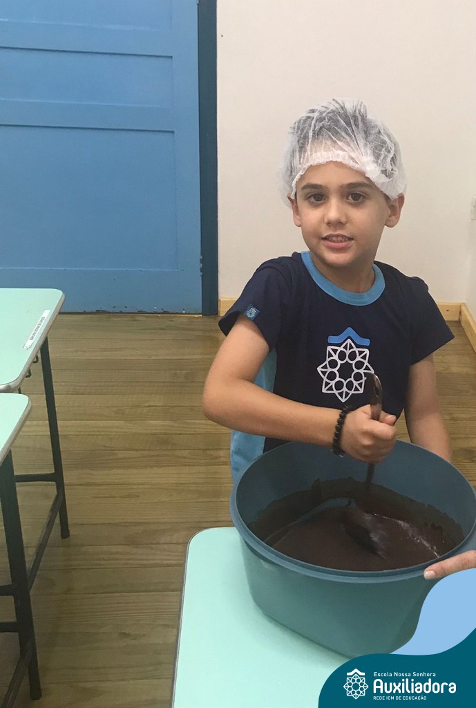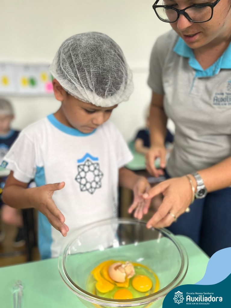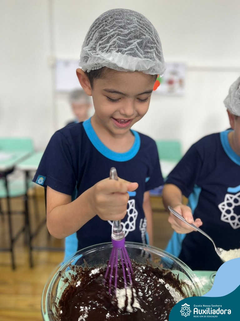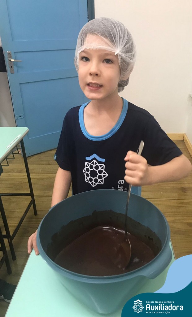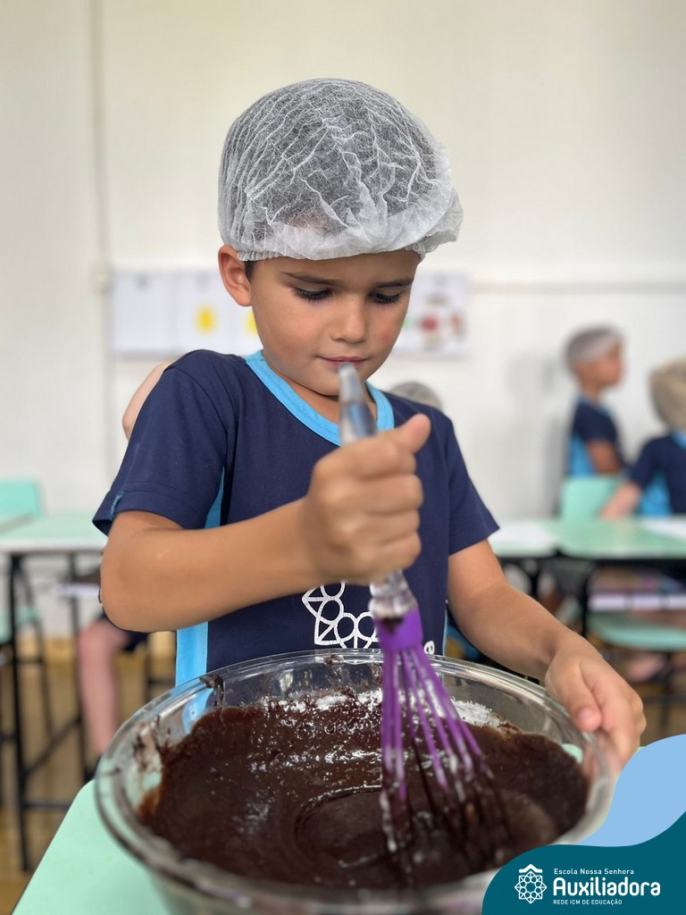 Em clima de Páscoa e confraternização, as crianças se envolveram em uma experiência de culinária muito significativa, fazendo um delicioso bolo de Cacau! Esta atividade não só ensina habilidades culinárias básicas, como também promove a criatividade e a colaboração. Realizaram a exploração sobre o Cacau, a separação e mistura dos ingredientes e, por fim o registro da receita em folha. Cada etapa foi uma oportunidade para aprender e se divertir juntos. Além disso, o resultado final foi um saboroso bolo, uma recompensa que todos puderam desfrutar em um lanche compartilhado, afinal Páscoa é partilha, amor e carinho uns com os outros.