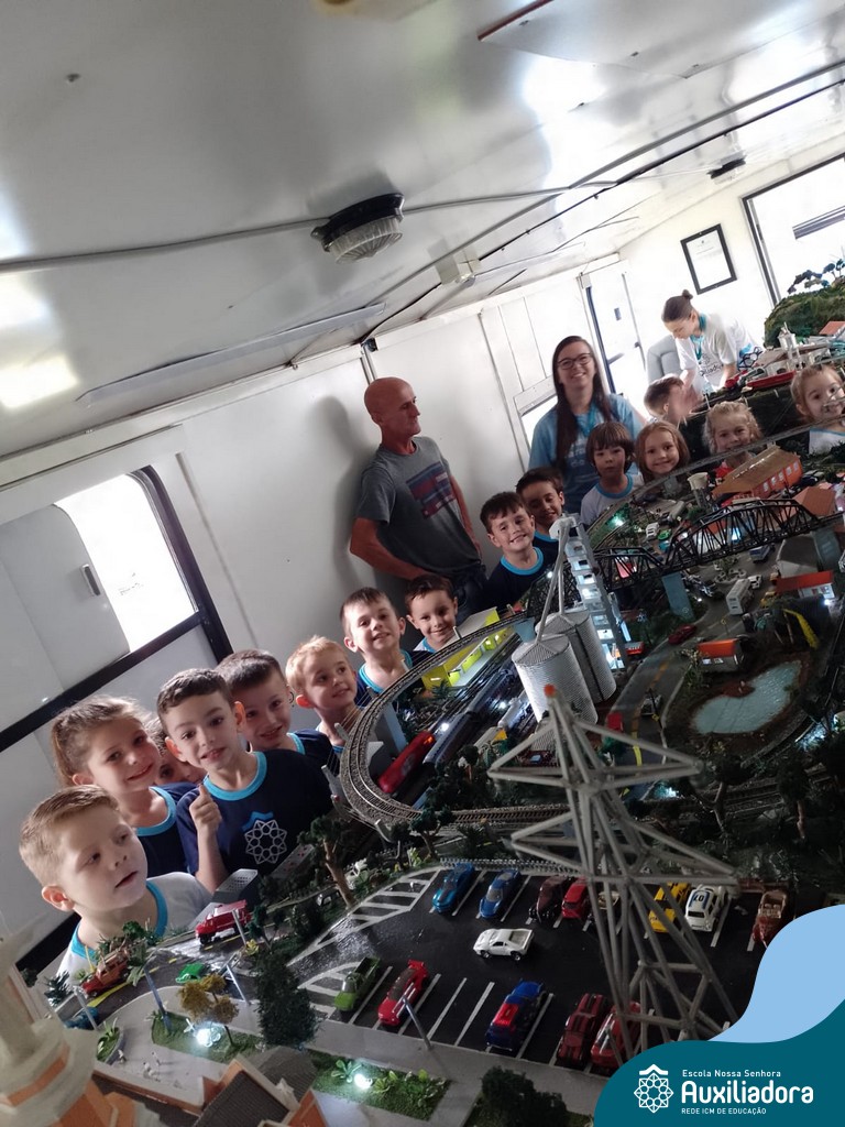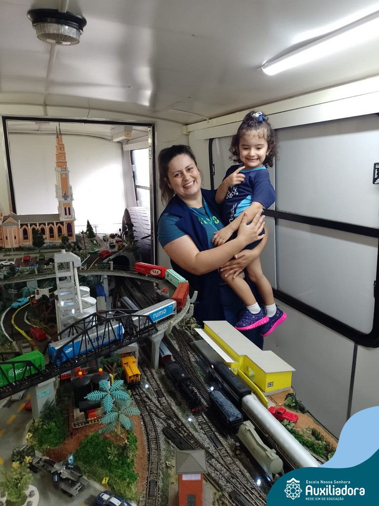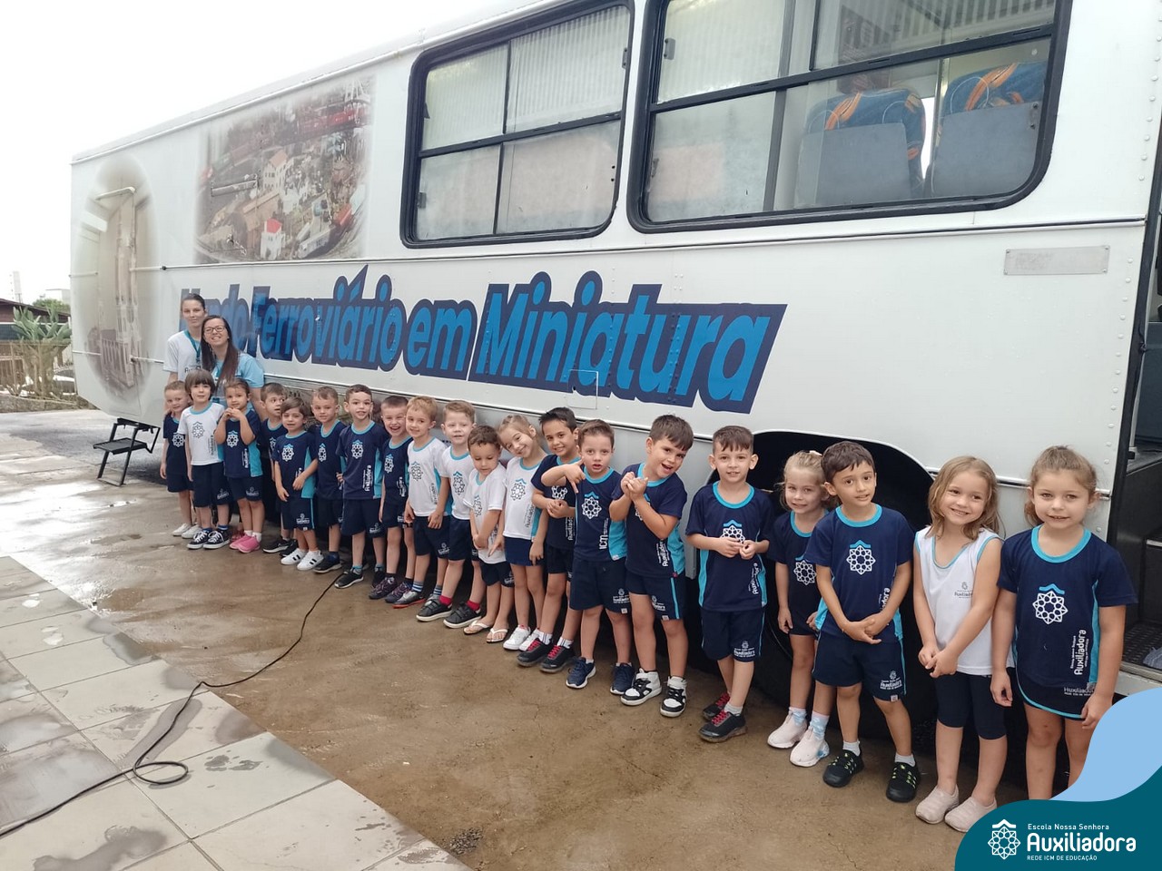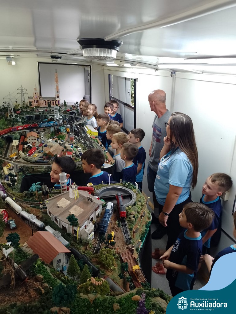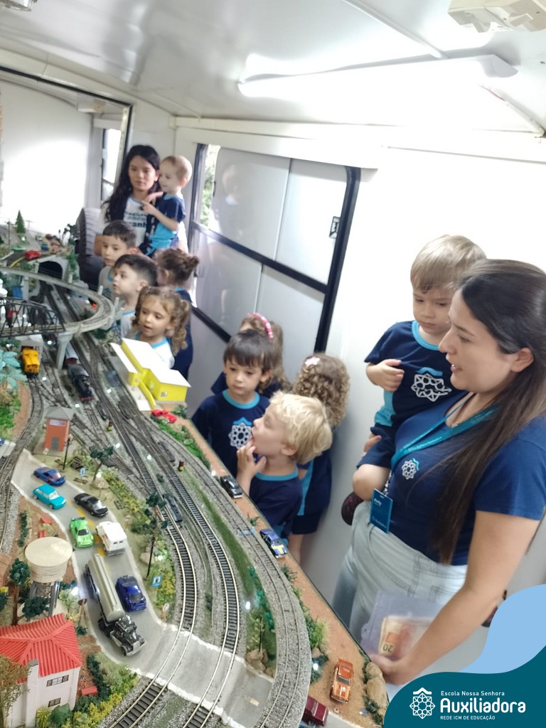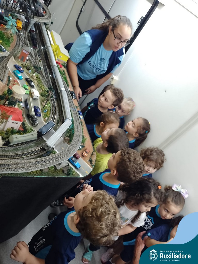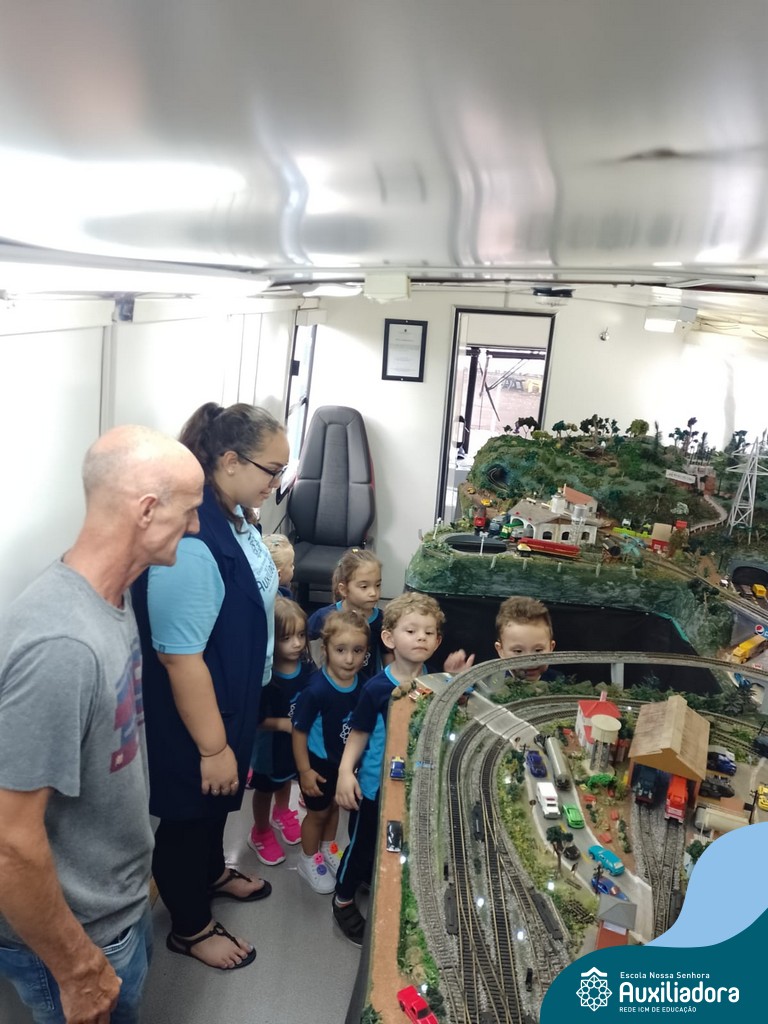 As turmas da Educação Infantil estão ampliando os conhecimentos sobre os meios de transportes. Para envolvê-los ainda mais neste tema, receberam na escola um ônibus muito especial, dentro dele uma maquete de ferrovia e algumas características de nossa cidade.