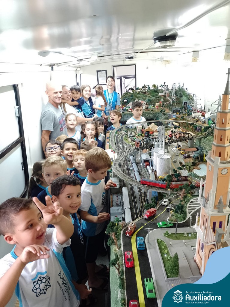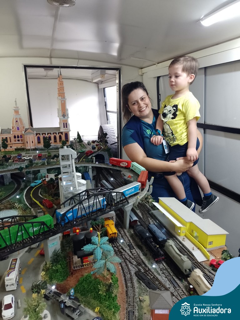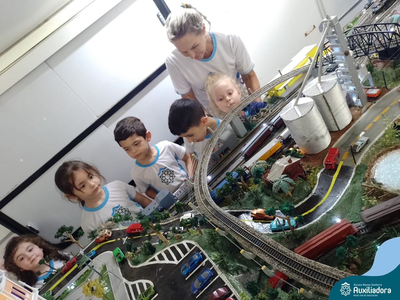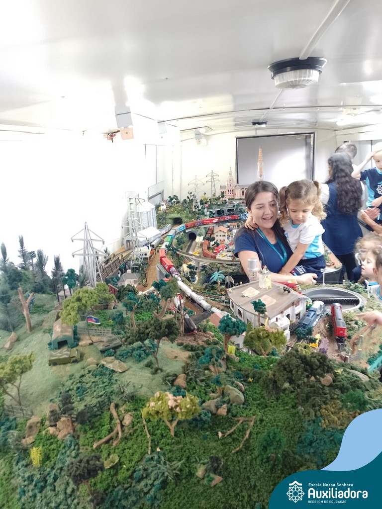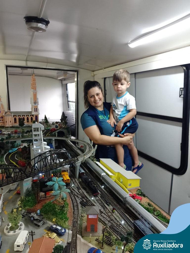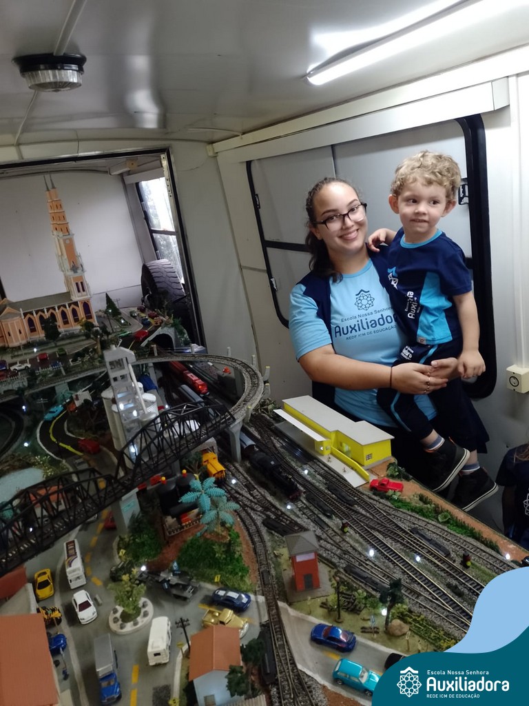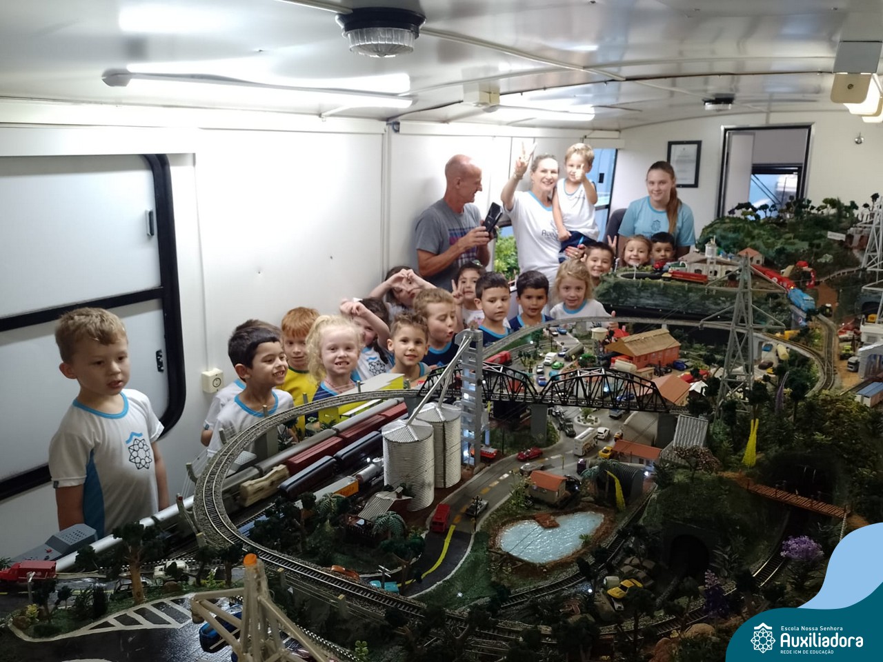 As turmas da Educação Infantil estão ampliando os conhecimentos sobre os meios de transportes. Para envolvê-los ainda mais neste tema, receberam na escola um ônibus muito especial, dentro dele uma maquete de ferrovia e algumas características de nossa cidade.