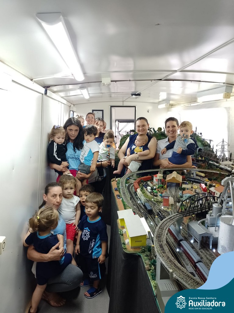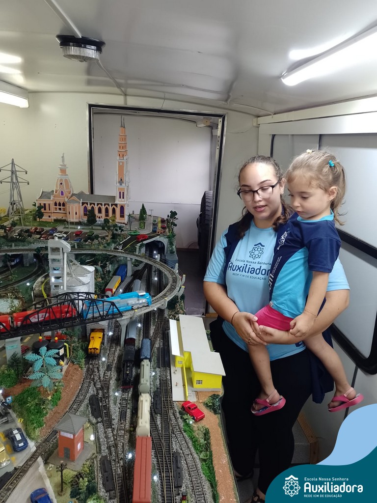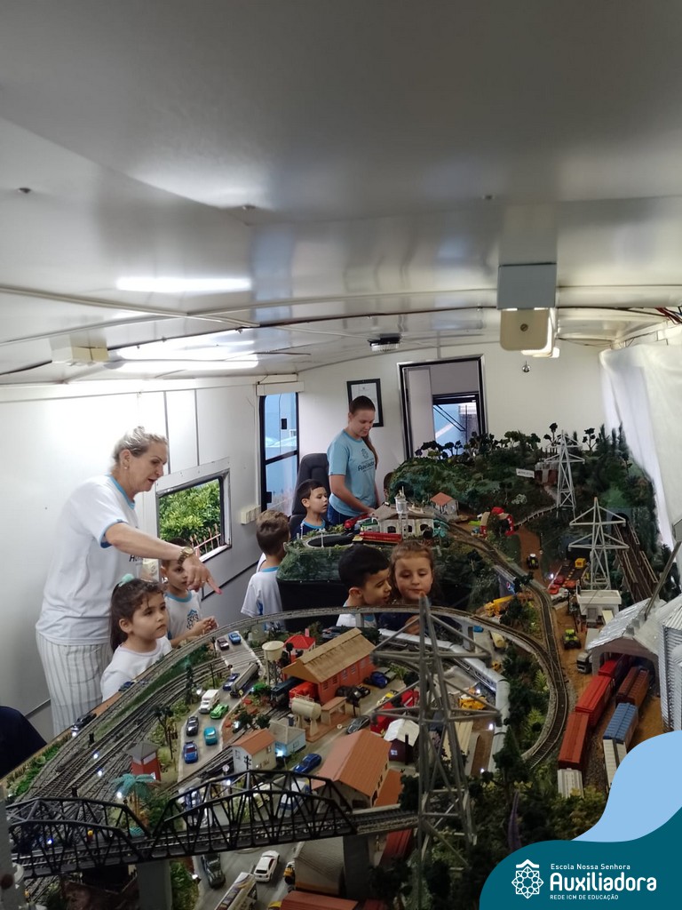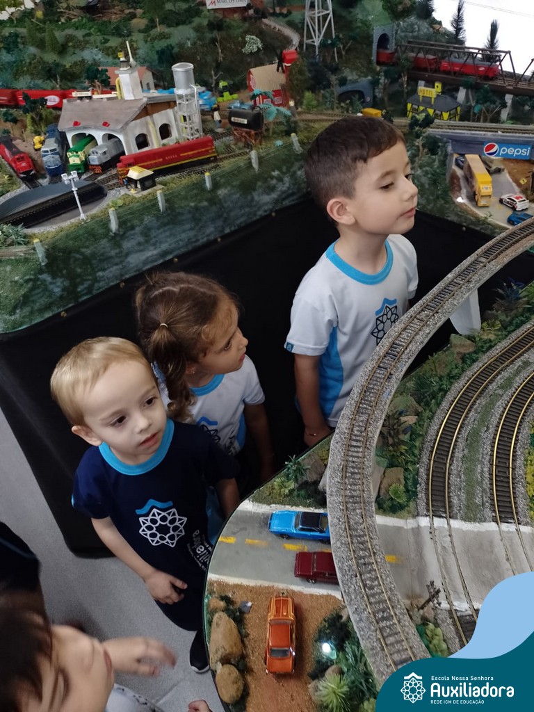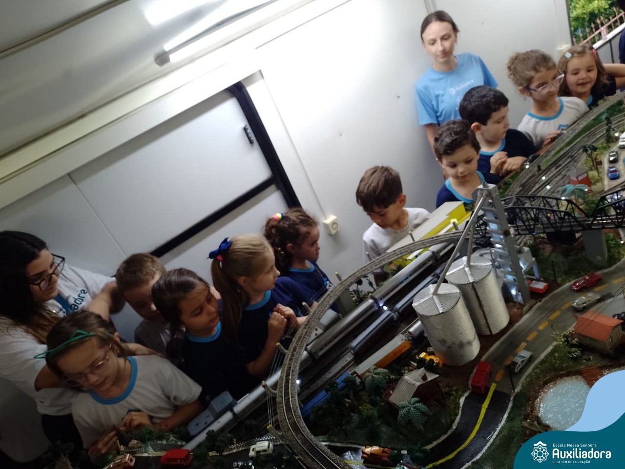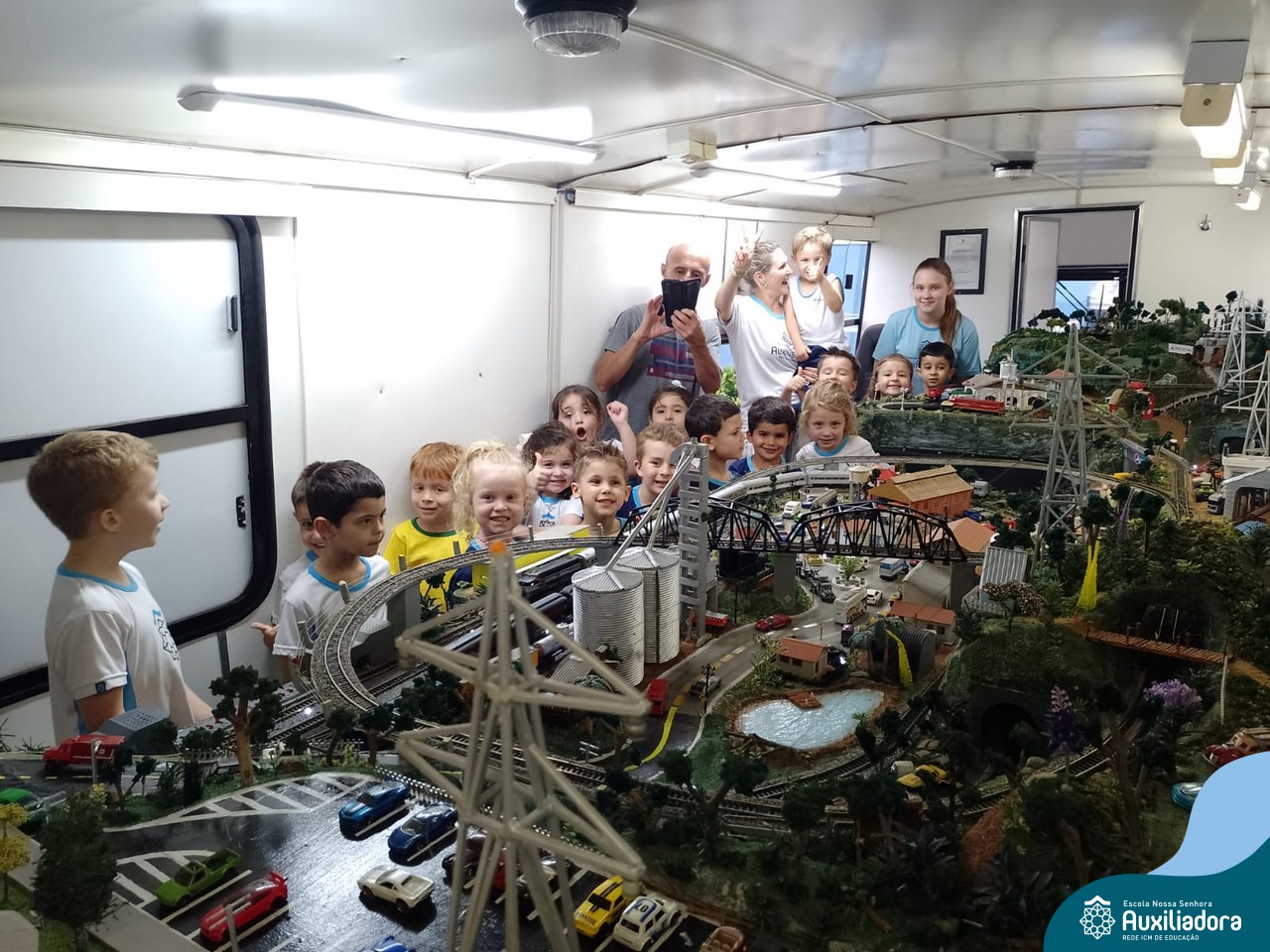 As turmas da Educação Infantil estão ampliando os conhecimentos sobre os meios de transportes. Para envolvê-los ainda mais neste tema, receberam na escola um ônibus muito especial, dentro dele uma maquete de ferrovia e algumas características de nossa cidade.