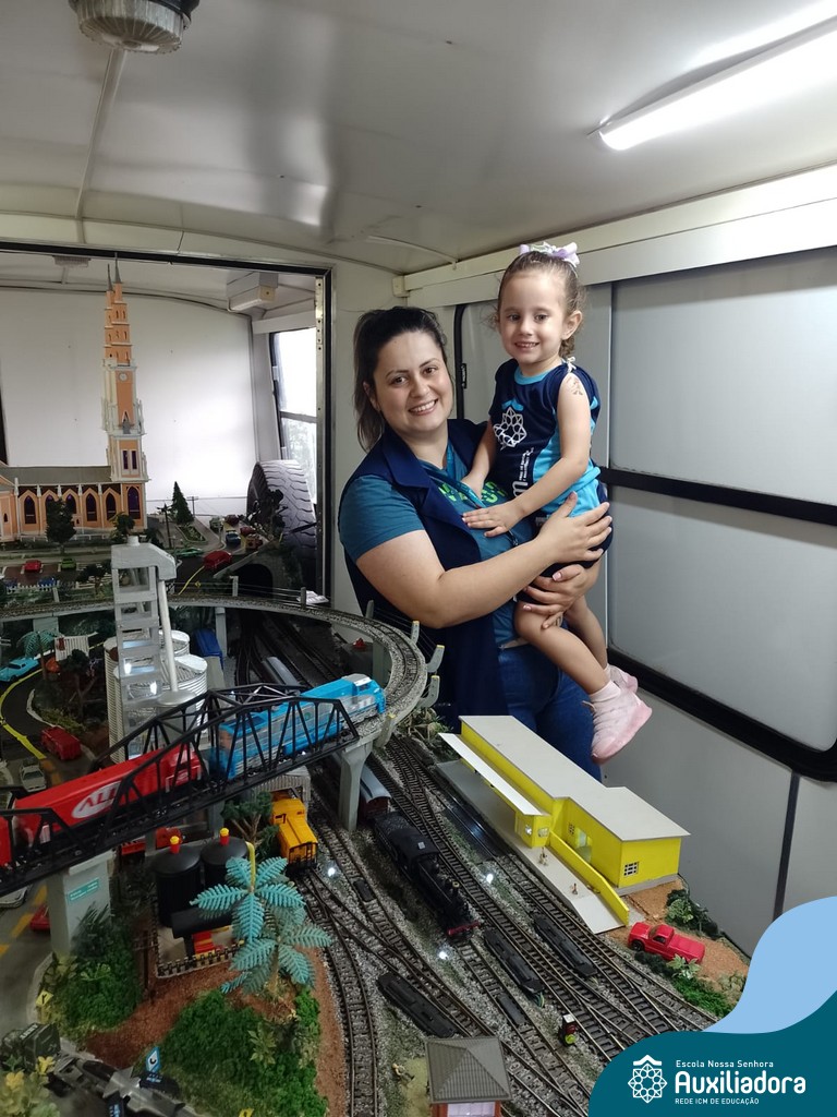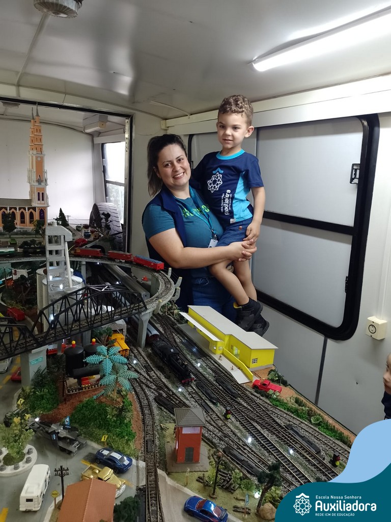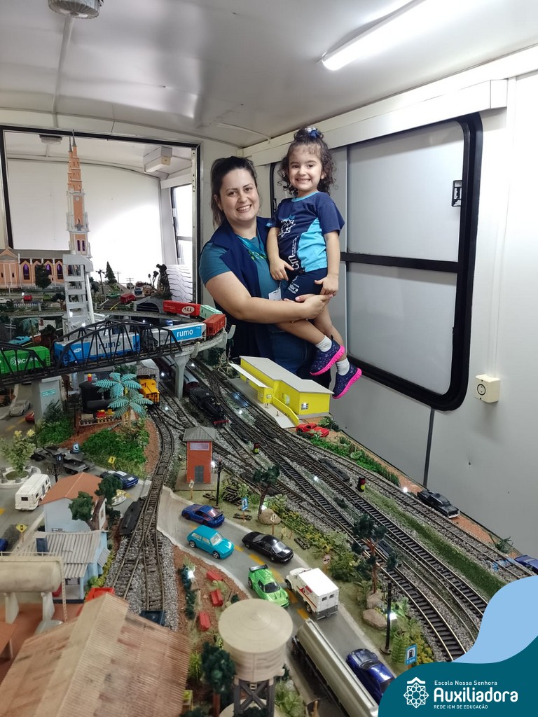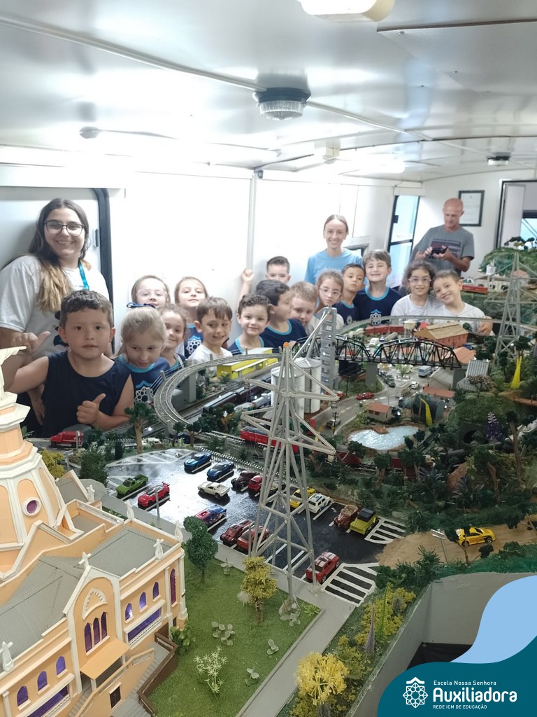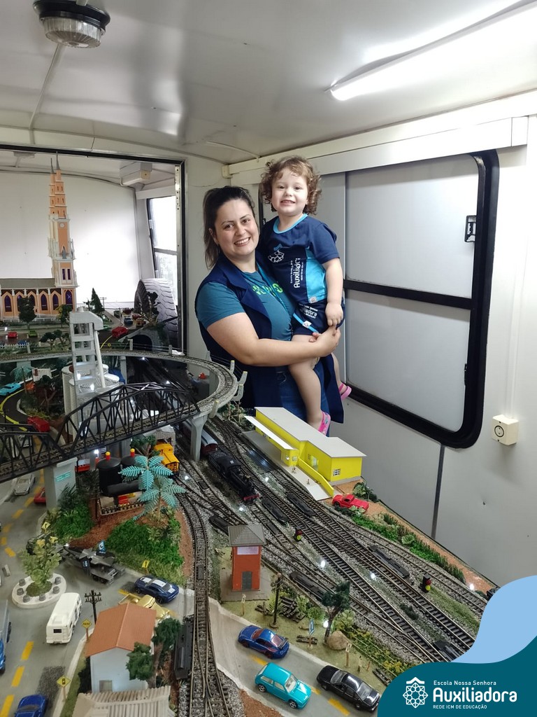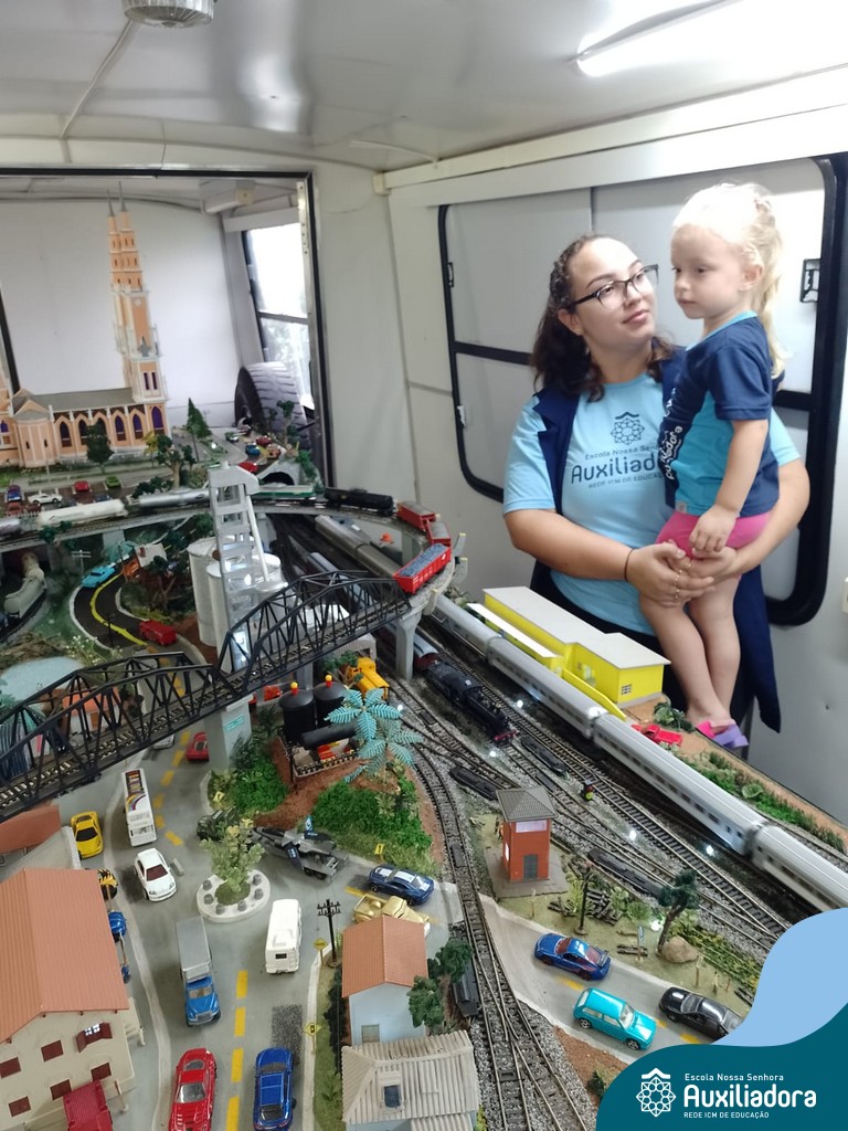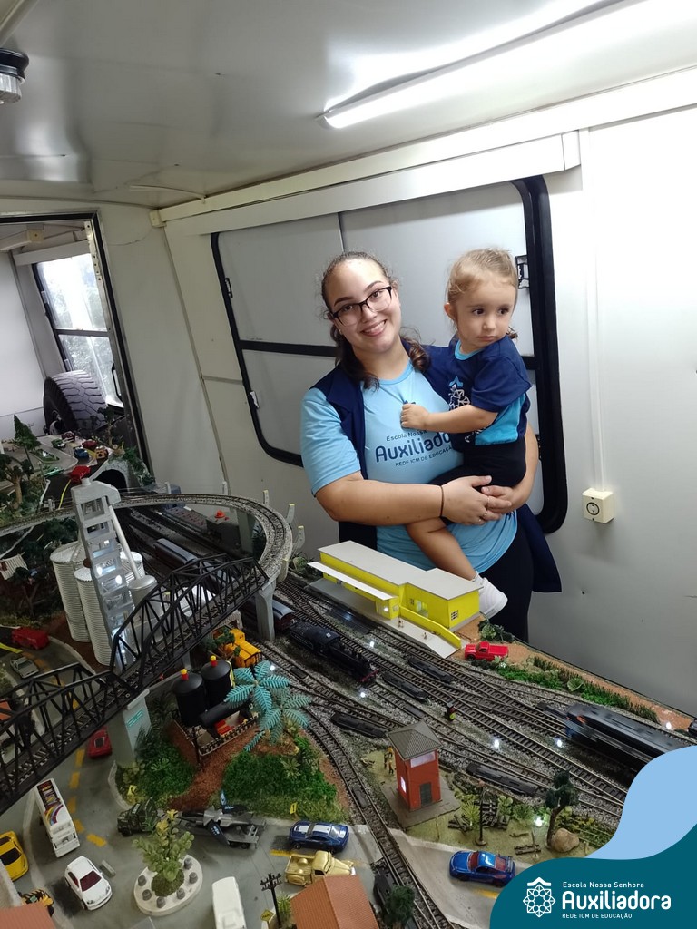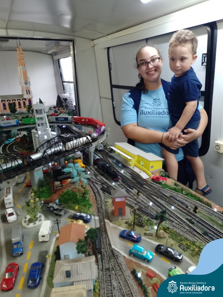 As turmas da Educação Infantil estão ampliando os conhecimentos sobre os meios de transportes. Para envolvê-los ainda mais neste tema, receberam na escola um ônibus muito especial, dentro dele uma maquete de ferrovia e algumas características de nossa cidade.