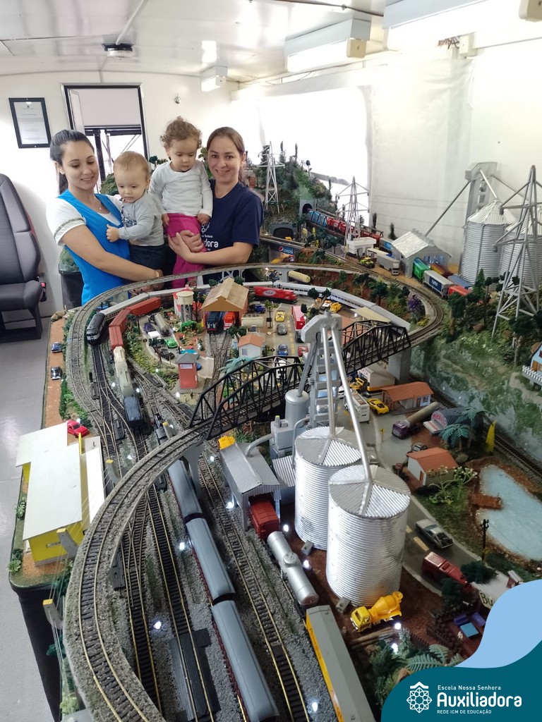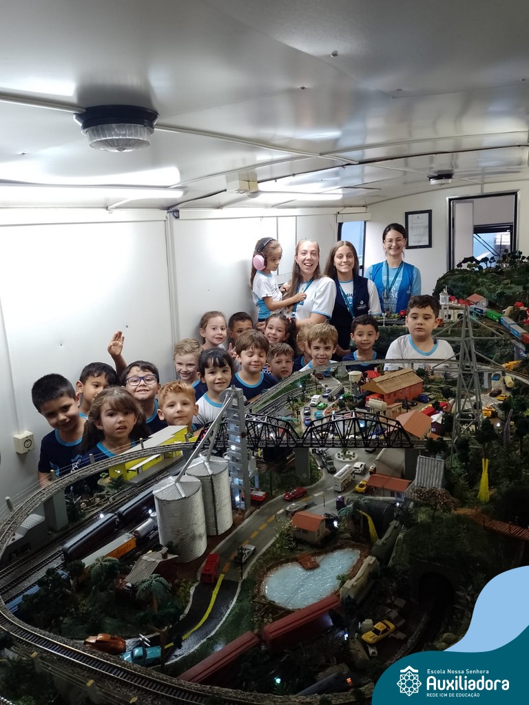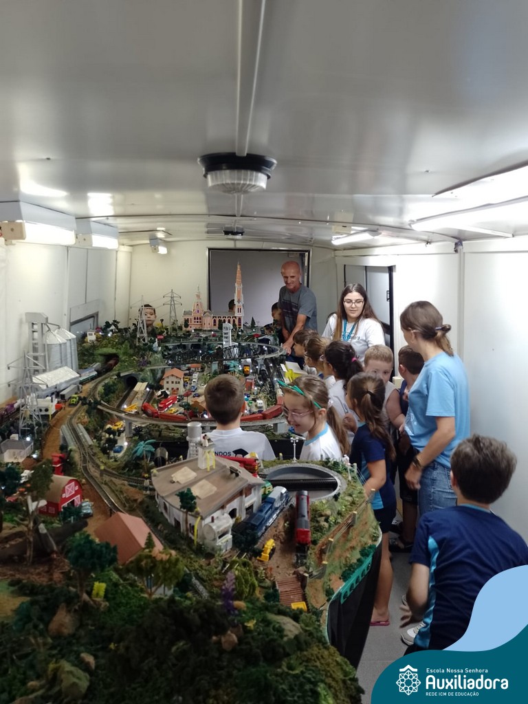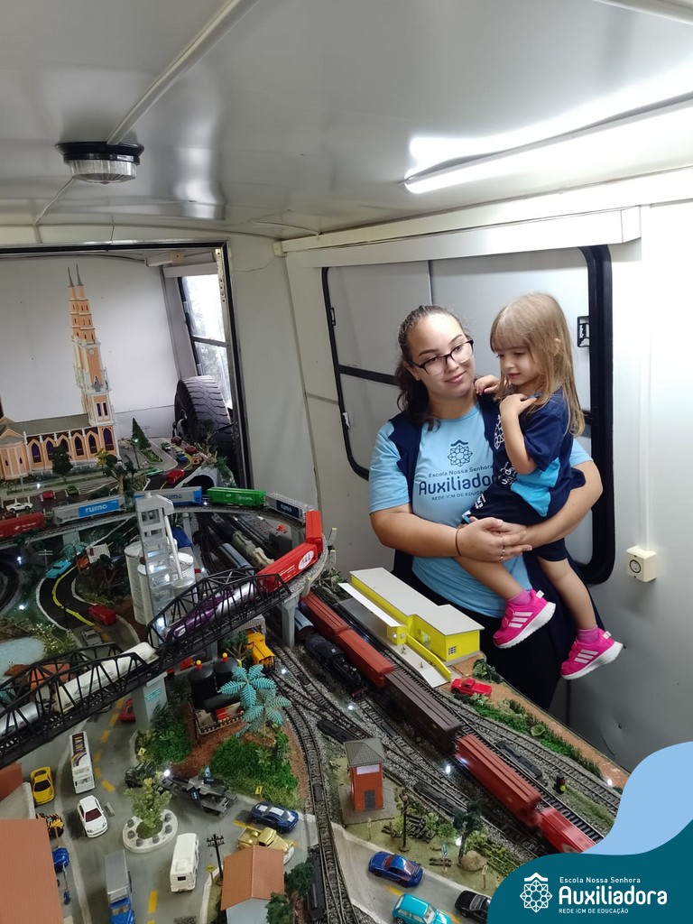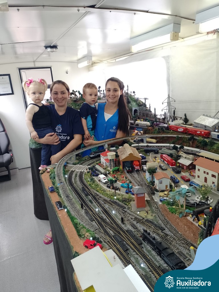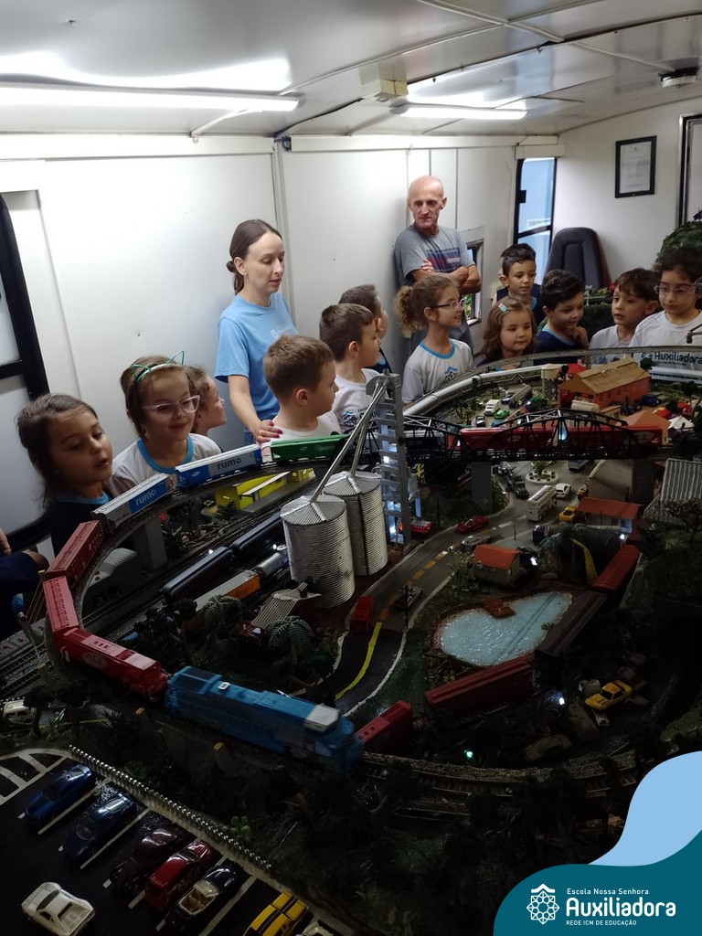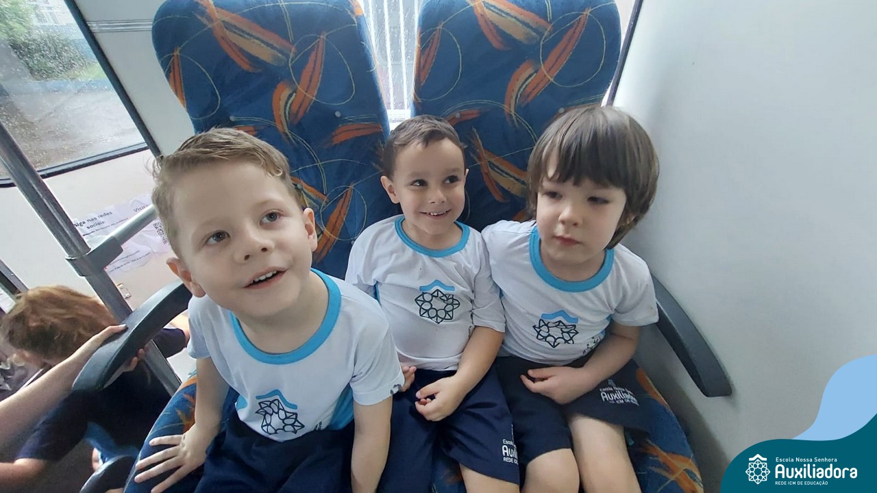 As turmas da Educação Infantil estão ampliando os conhecimentos sobre os meios de transportes. Para envolvê-los ainda mais neste tema, receberam na escola um ônibus muito especial, dentro dele uma maquete de ferrovia e algumas características de nossa cidade.