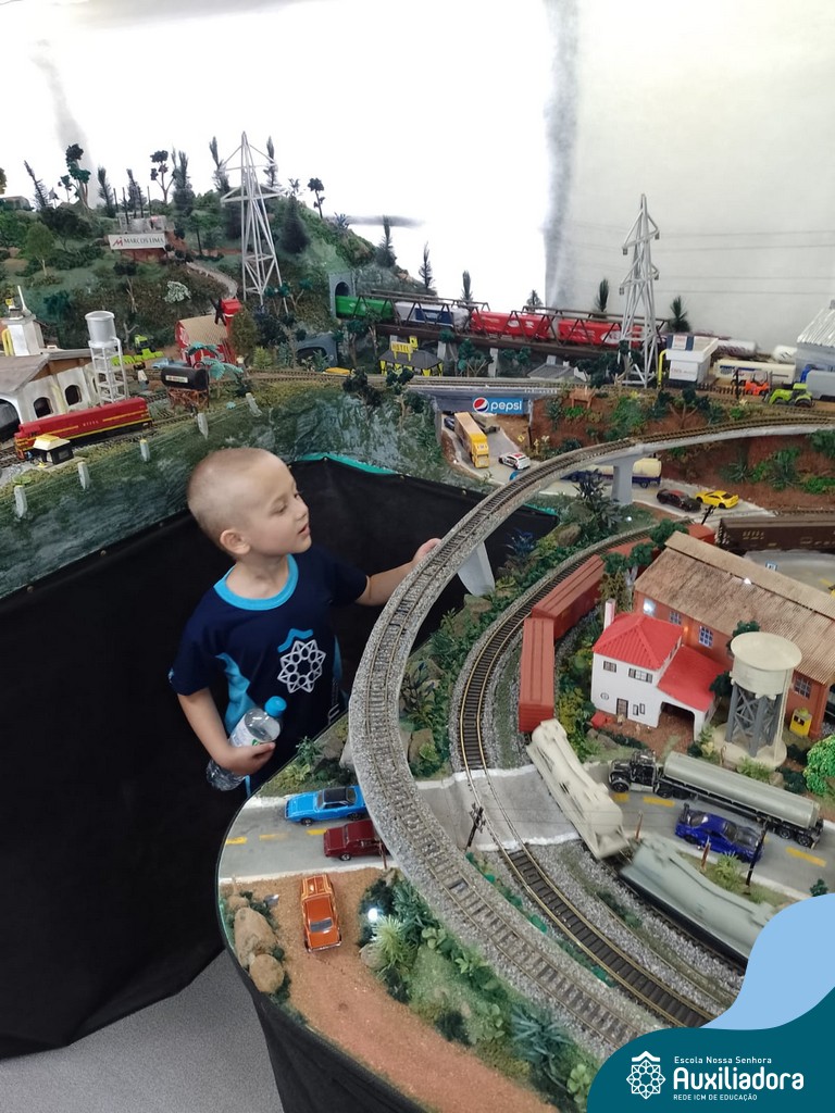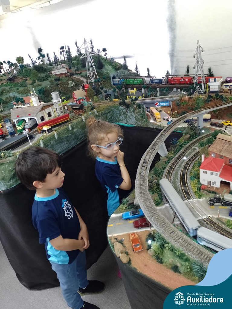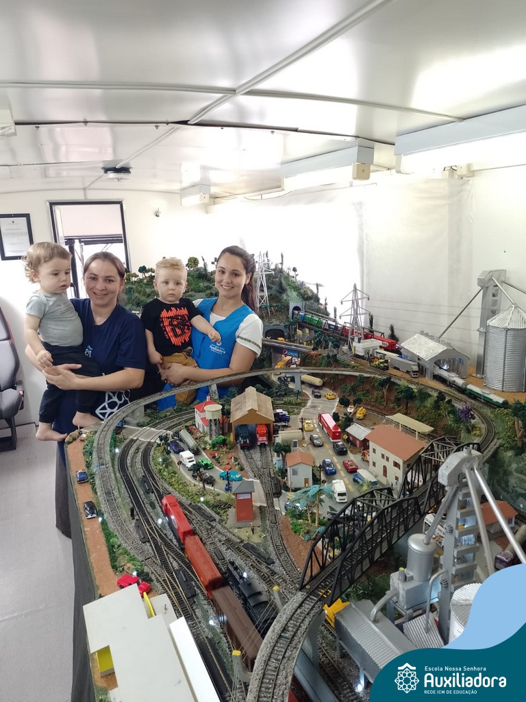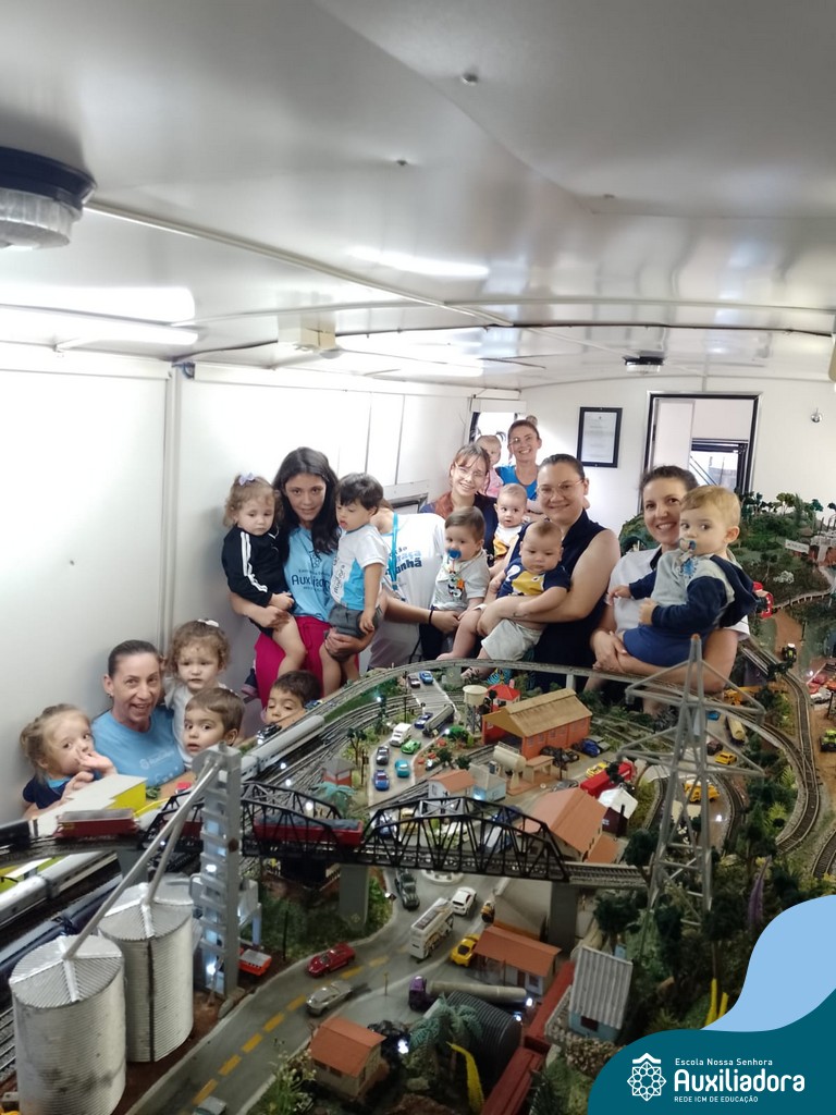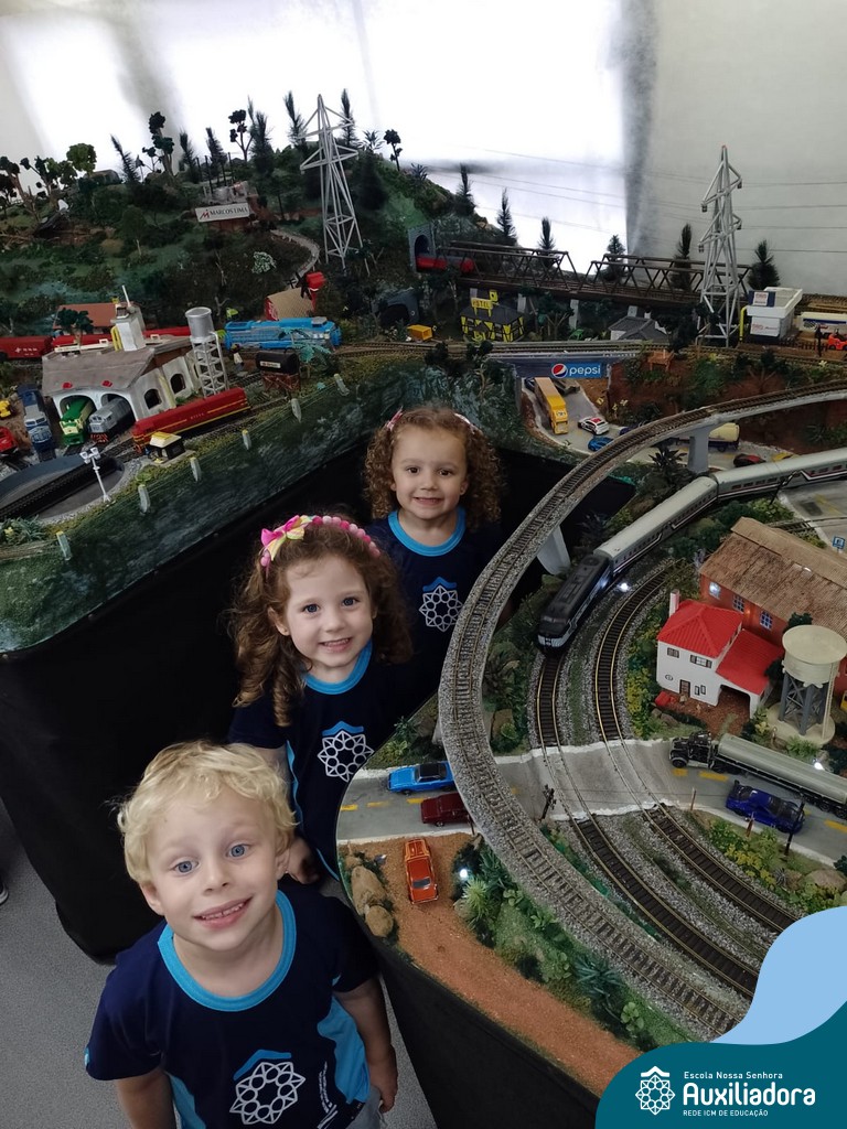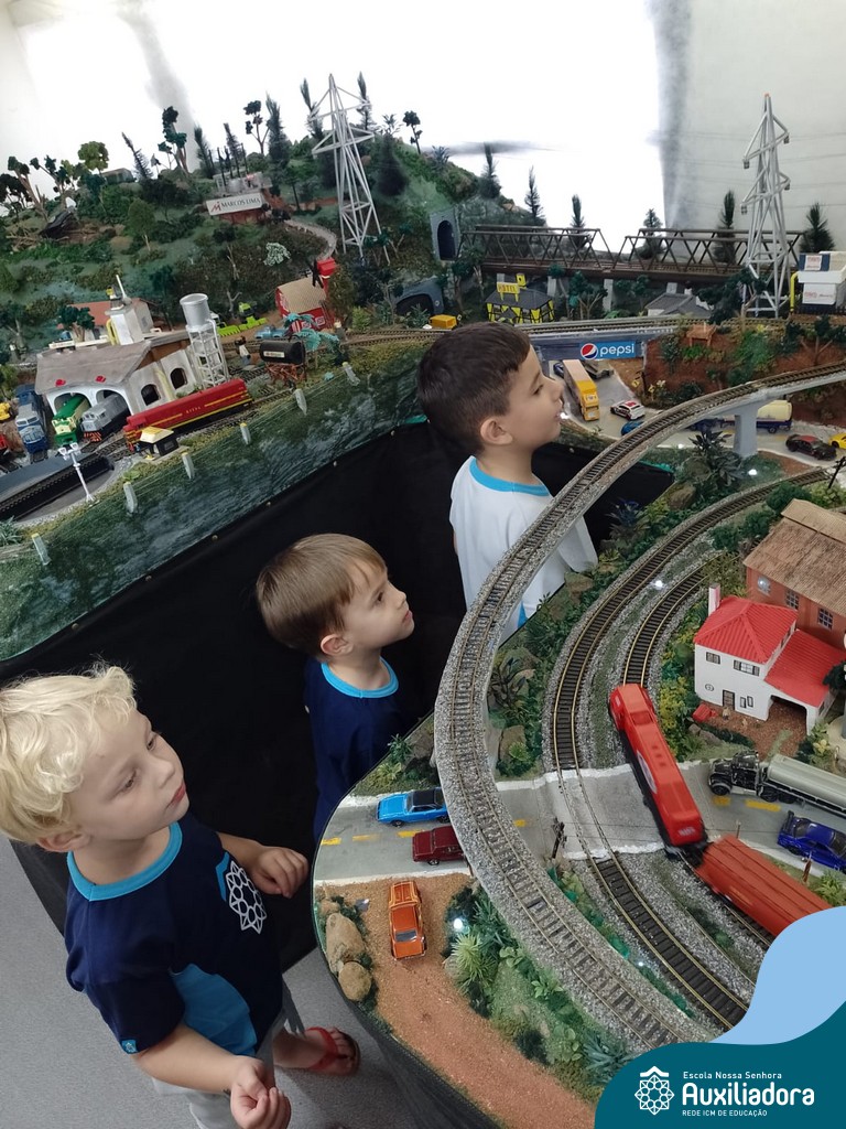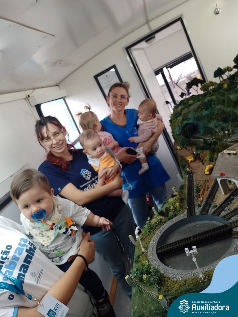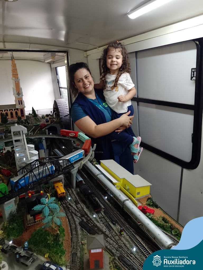 As turmas da Educação Infantil estão ampliando os conhecimentos sobre os meios de transportes. Para envolvê-los ainda mais neste tema, receberam na escola um ônibus muito especial, dentro dele uma maquete de ferrovia e algumas características de nossa cidade.