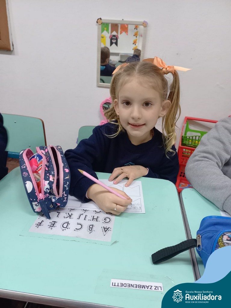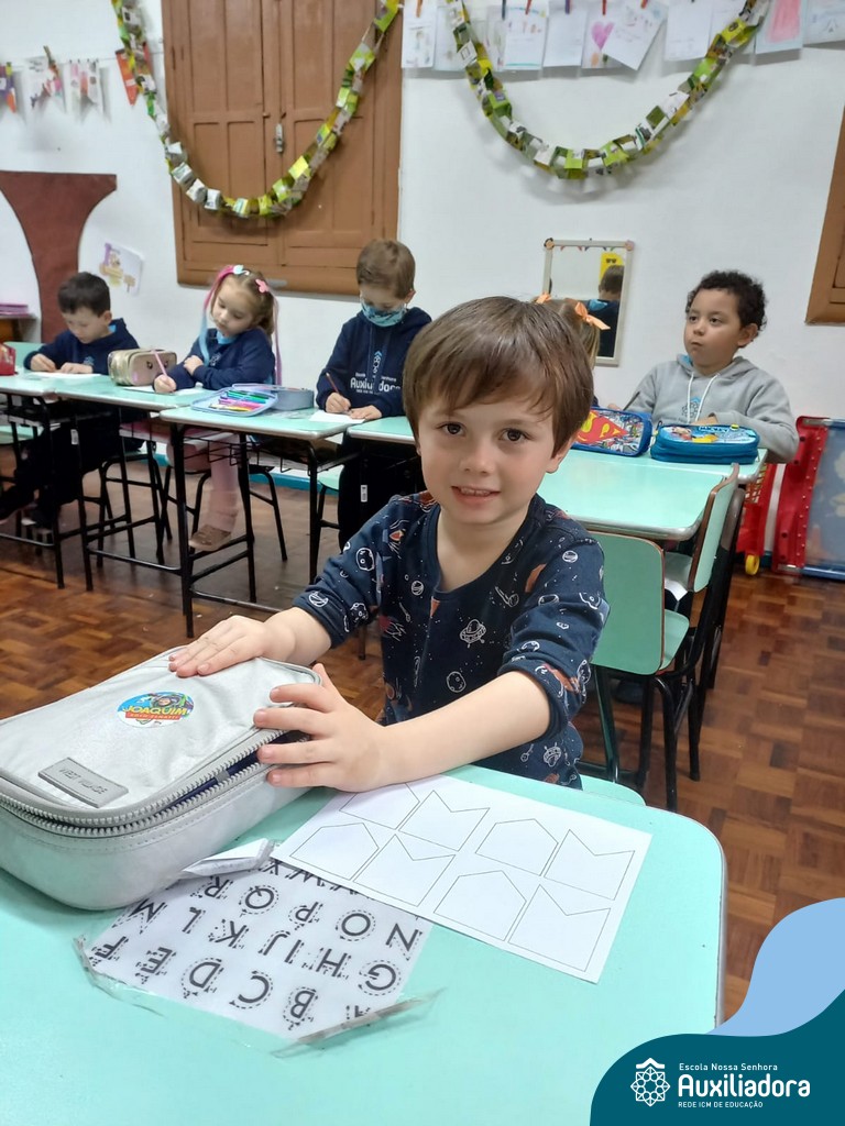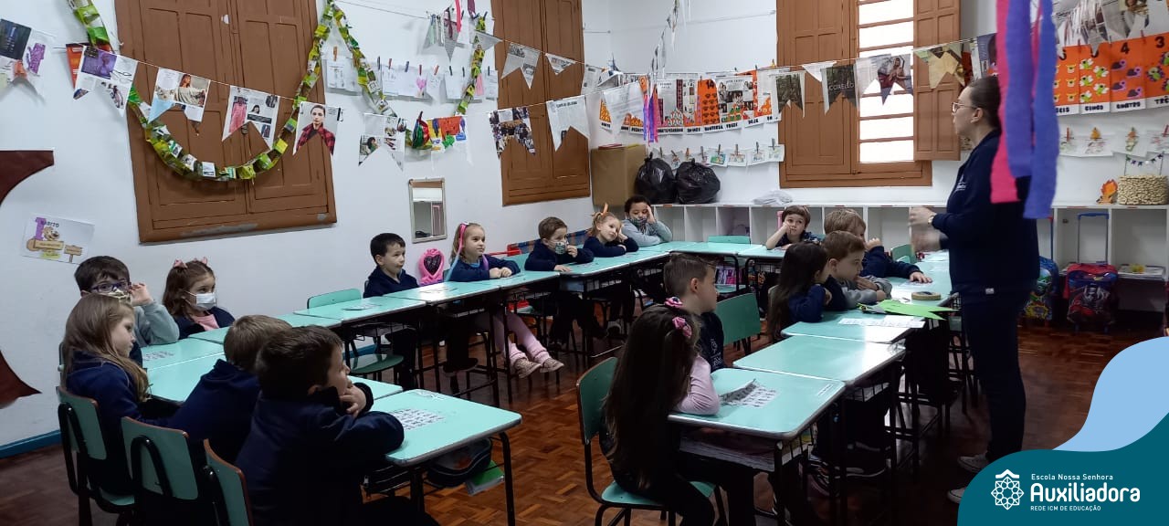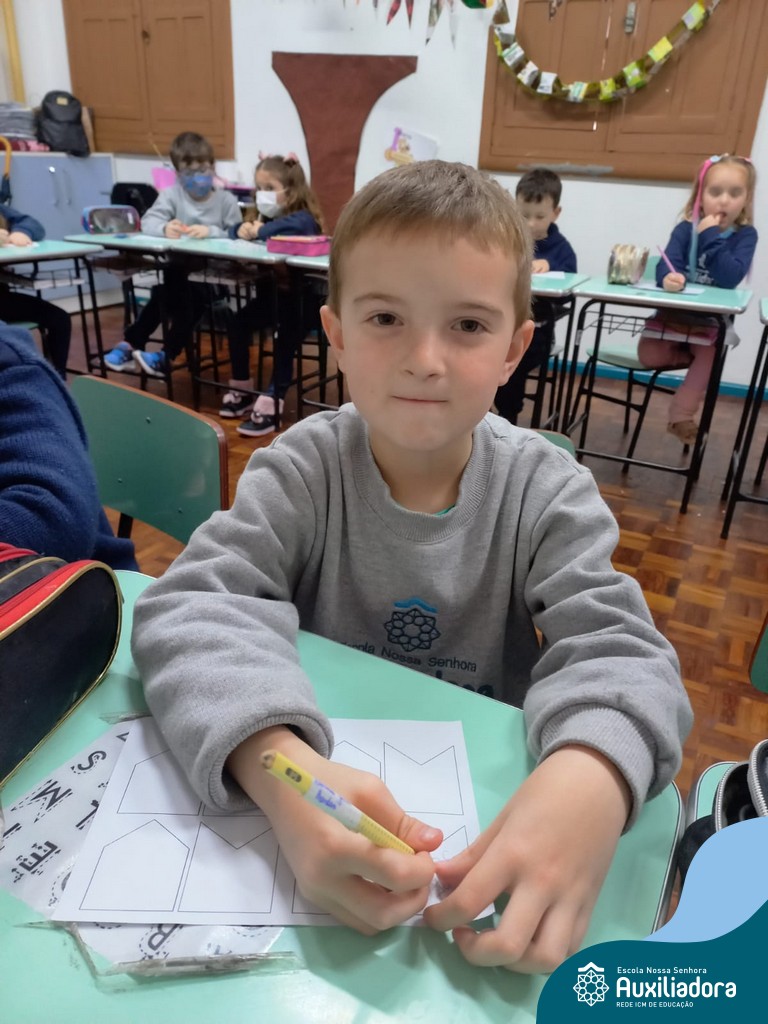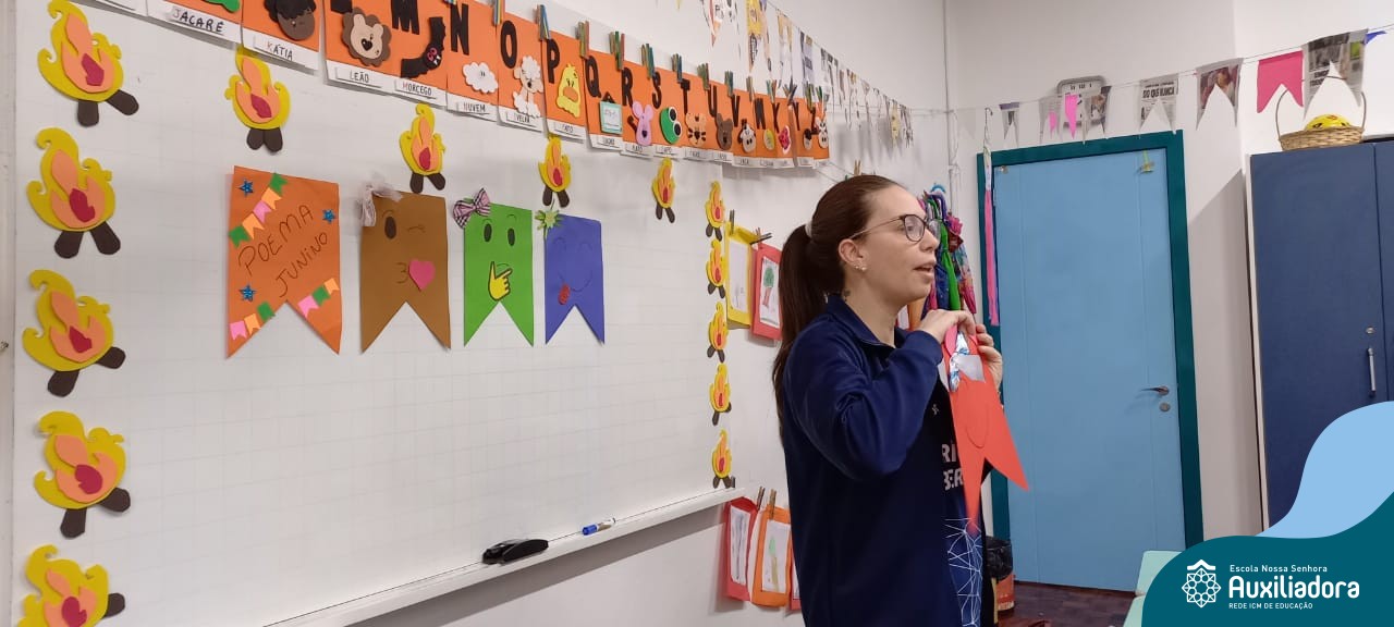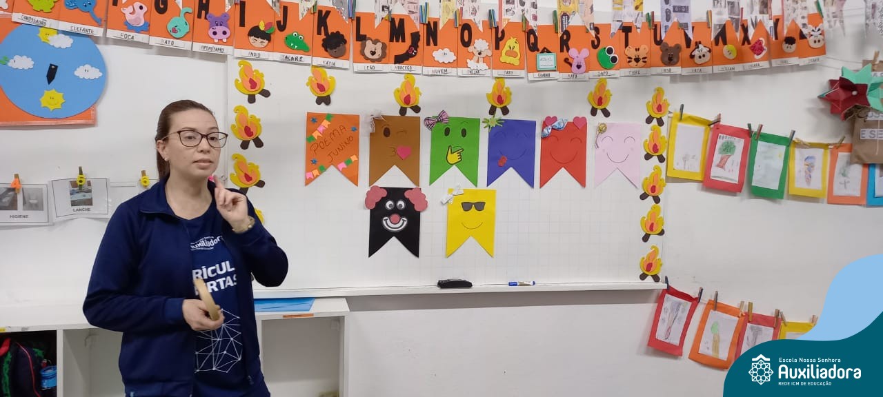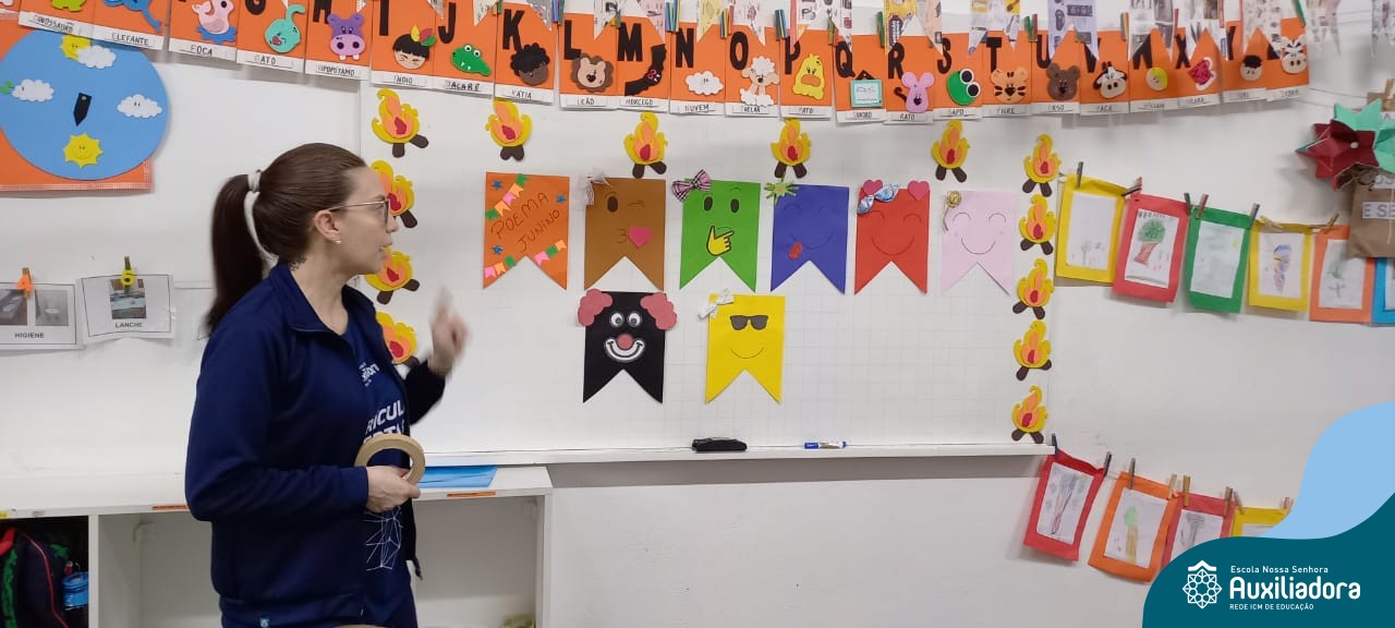As turmas do Pré 2 trabalharam um poema junino, onde cada bandeirinha tinha sua cor e seu tema. Após ouvirem o poema, trabalhamos as letras iniciais das cores e sua sequência, bem como suas rimas.
