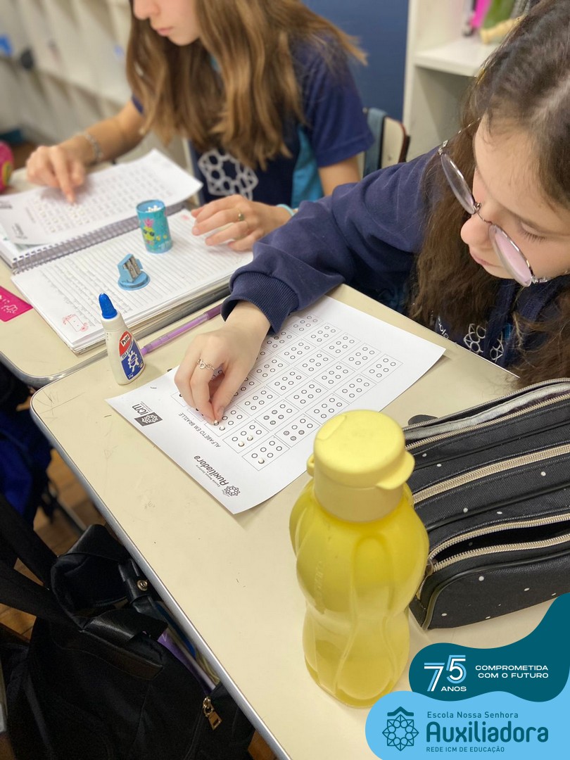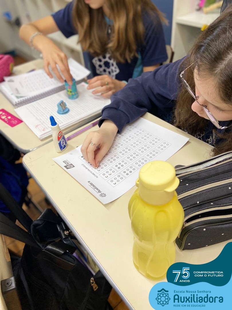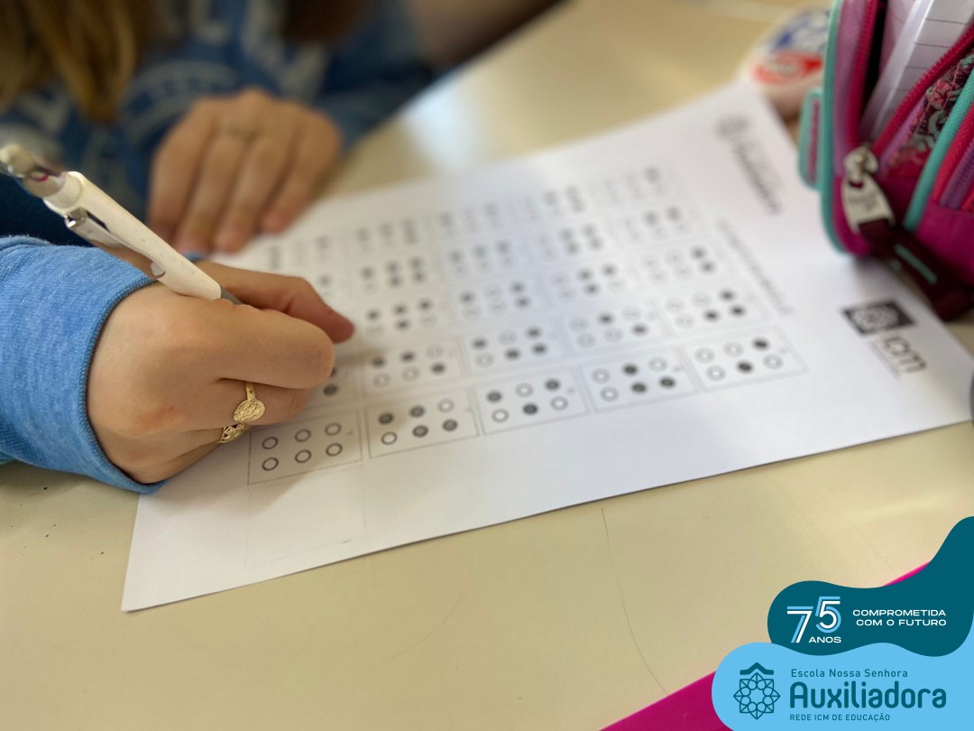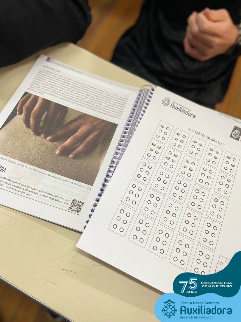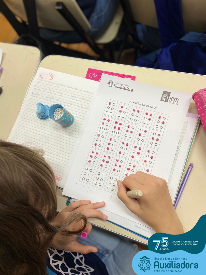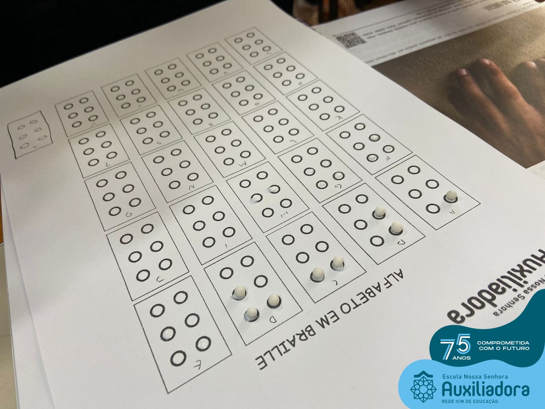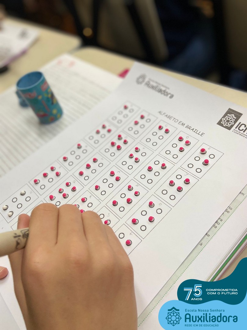 Todo esse conhecimento está atrelado ao conteúdo do 8° ano, sobre sistemas sensoriais. Neste sentido, a turma aproveitou o conhecimento adquirido e desenvolveu na prática um Alfabeto em Braille, usando bolinhas de sagu. Após colarem as bolinhas nos respectivos locais formadores de cada letra, os alunos ainda escreveram seus nomes em Braille. Uma aula sobre acessibilidade, empatia e muito conhecimento do corpo humano!